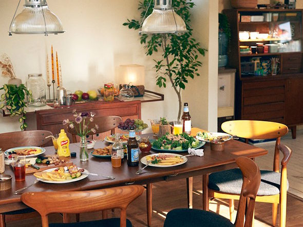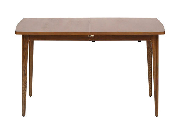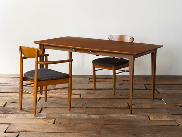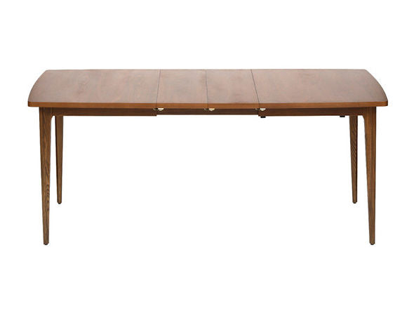天板を3段階で伸長することができるエクステンションテーブル。脚部の面加工や天板の曲線など、随所にヴィンテージ家具のディテールを再現しています。温かみのあるウォルナット材の質感とシャープなレッグラインのバランスが絶妙で、合わせるチェアを選びません。天板はウレタン仕上げで水や汚れを防ぎます。天板の中央に中板を差し入れることで、130cm・155cm・180cmの3段階にサイズを変えることができます。天板下には簡易的なロック機能が付いています。中板は使わないときには天板下に格納できる仕様となっています。