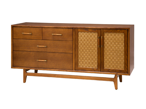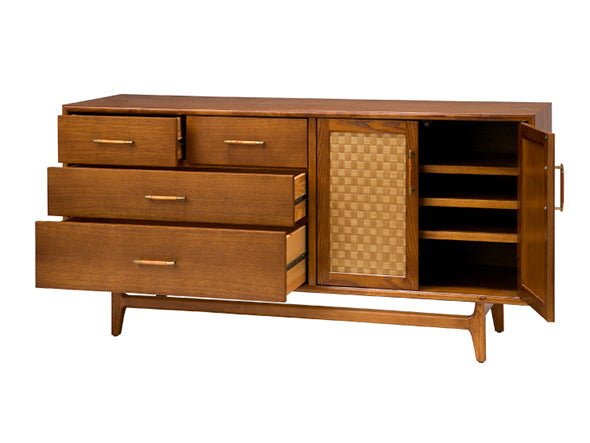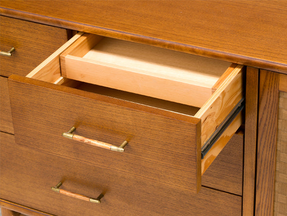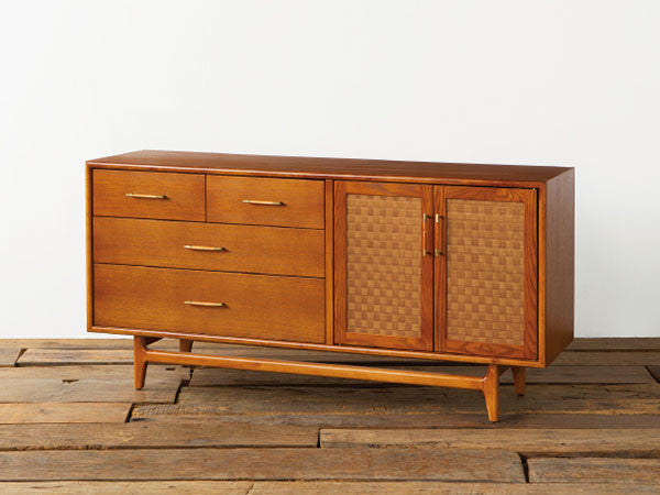 ACME Furnitureオリジナル「BROOKS」シリーズのキャビネット。ヴィンテージさながらのダイナミックなデザインです。アメリカンファニチャーの雰囲気を持ちながら、現代の住宅需要にフィットするようリサイズされています。リビングダイニングの壁面に置き、飾り台やテレビボードとしてお使いいただくほか、天板上に家電を置いてキッチンボードとしてもお使いになれます。開き戸内部に配線孔が設けられているため、テレビ台としての使用も可能です。