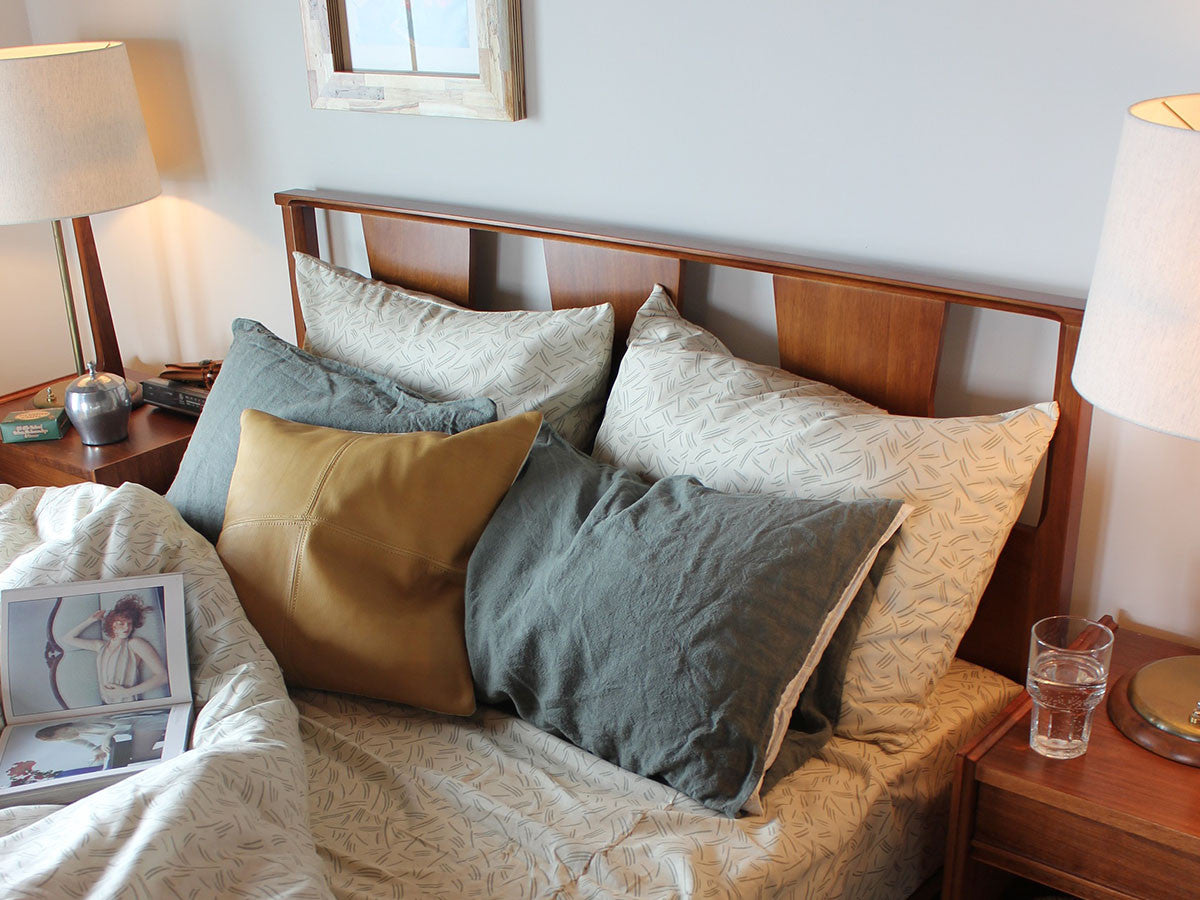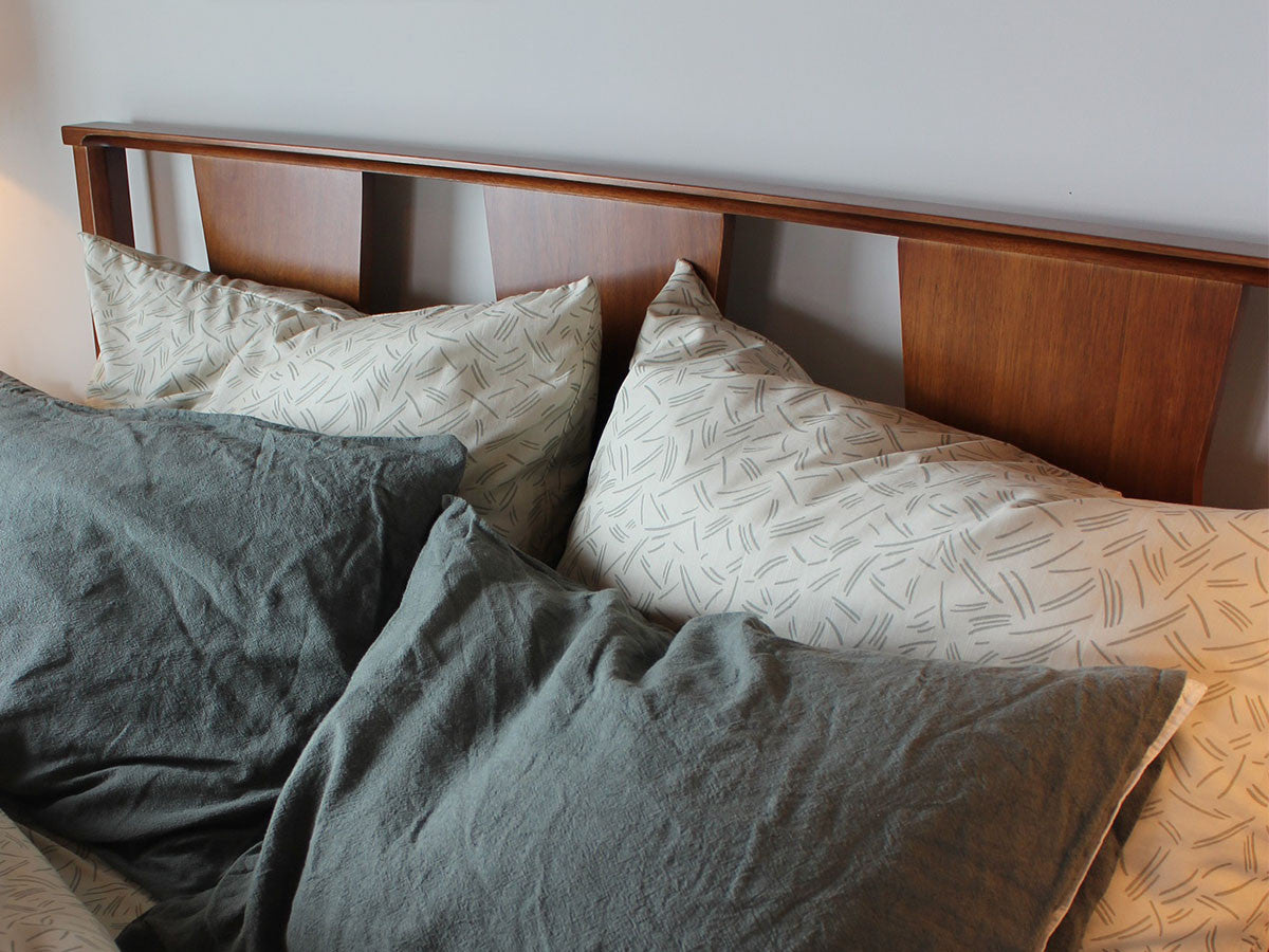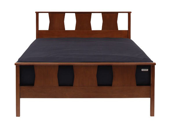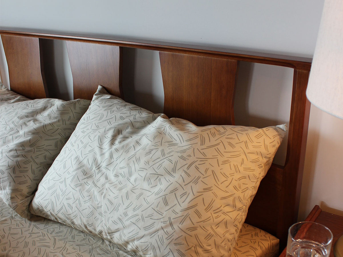 1960年代のヴィンテージベッドをベースにし、リデザインされたベッドフレーム。規則正しさの中にあるリズミカルな印象と、少しの艶をまとったウォールナットの上品な色合いが、年月を重ねたアメリカのヴィンテージ家具の趣を感じさせます。フットフレームは布団がずり落ちないよう少し高めに、ヘッドフレームは枕を置いても幾何学的な美しい意匠を損なわないように設計されています。西海岸のリラックスした雰囲気を感じるカリフォルニアスタイル、古材やアイアン素材を中心とするインダストリースタイル、古き良きアメリカを感じるミッドセンチュリースタイルなど多様なコーディネートに合わせることができ、ベッドルームで確かな存在感を示します。
