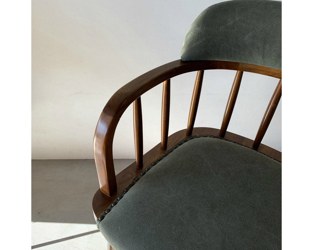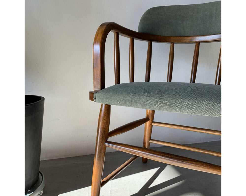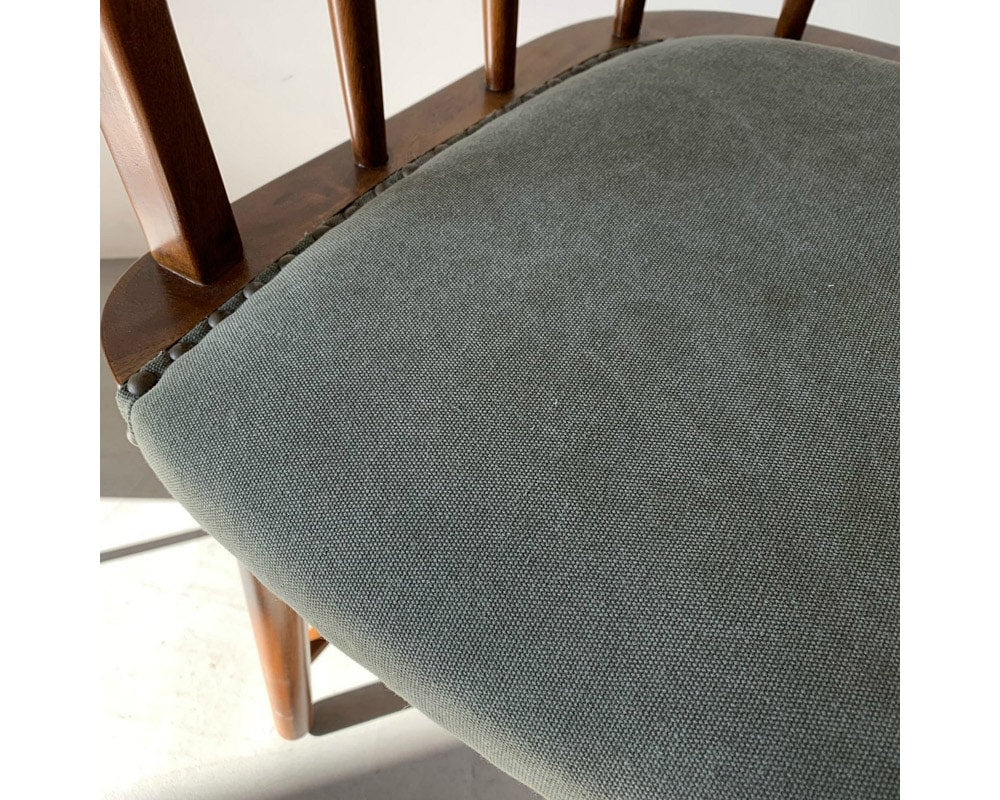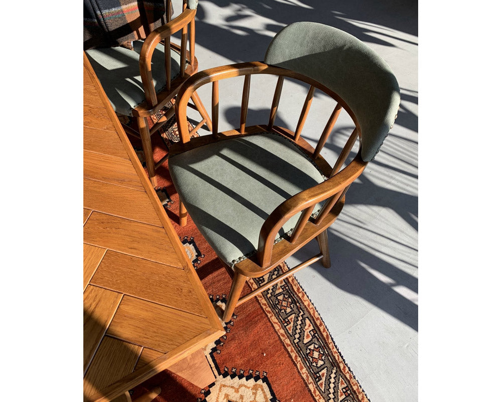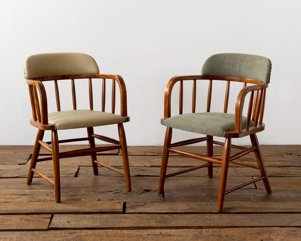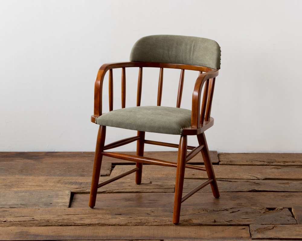 アメリカンヴィンテージを思わせるACME Furniture(アクメファニチャー)の「OAKS ARM CHAIR /オークスアームチェア」です。1908から1948年まで存在したアメリカ製のアームチェアをモチーフに、日本の住宅環境に合わせてリサイズしました。オリジナルは背、座面ともにウッドですが、こちらはクッション性を持たせるために背と座にウレタンを入れ、長時間座っても疲れないようにしています。ヴィンテージの美しいプロポーションを崩さずにサイズ変更をおこない、かつACMEのダイニングテーブルすべてに収まりが良いようアームの高さと幅を調整しています。どの角度から見ても遜色ない仕上がりで、ダイニングチェアとしてはもちろんのこと、デスクやリビングに置いてパーソナルチェア代わりにもおすすめです。座面にはバイオウォッシュをかけたコットンキャンバスを使用し、ヴィンテージアイテムとの相性も抜群です。フレームに使用されるマホガニーは横行する乱伐や違法伐採を防止するため、ワシントン条約によって天然木の取引が制限されています。この商品の木材はプランテーション栽培で計画的に植林された木材を使用しています。マホガニーは加工性や寸法安定性、耐久性などに優れ、また天然乾燥の速度も速く、ズレや割裂も少ない木材です。家具材、彫刻材、楽器、模型、内部装飾材などに用いられ、高級車のダッシュボードやハンドル、シフトノブにも伝統的に用いられています。