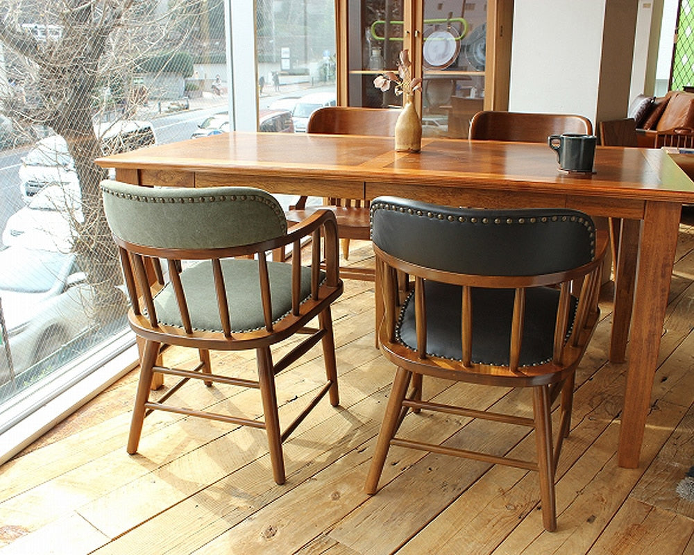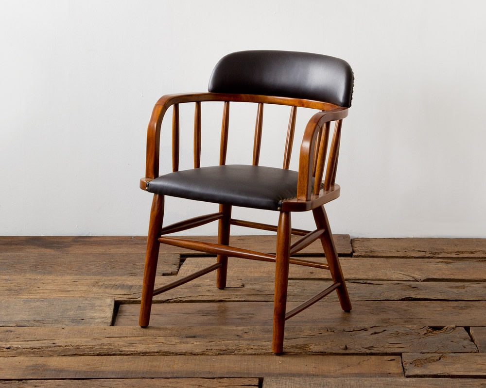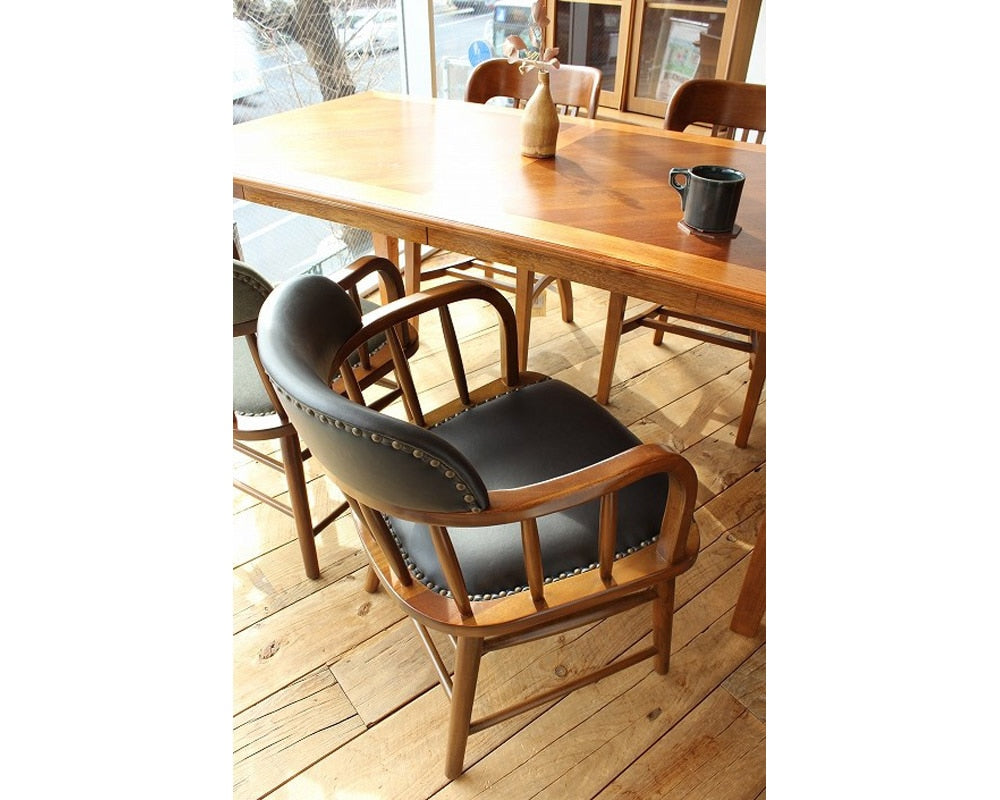 アメリカンヴィンテージを思わせるACME Furniture(アクメファニチャー)の「OAKS ARM CHAIR /オークスアームチェア」です。1908から1948年まで存在したアメリカ製のアームチェアをモチーフに、日本の住宅環境に合わせてリサイズしました。オリジナルは背、座面ともにウッドですが、こちらはクッション性を持たせるために背と座にウレタンを入れ、長時間座っても疲れないようにしています。ヴィンテージの美しいプロポーションを崩さずにサイズ変更をおこない、かつACMEのダイニングテーブルすべてに収まりが良いようアームの高さと幅を調整しています。どの角度から見ても遜色ない仕上がりで、ダイニングチェアとしてはもちろんのこと、デスクやリビングに置いてパーソナルチェア代わりにもおすすめです。座面にはお手入れの簡単なPVCレザーを使用し、ヴィンテージアイテムとの相性も抜群です。フレームに使用されるマホガニーは横行する乱伐や違法伐採を防止するため、ワシントン条約によって天然木の取引が制限されています。この商品の木材はプランテーション栽培で計画的に植林された木材を使用しています。マホガニーは加工性や寸法安定性、耐久性などに優れ、また天然乾燥の速度も速く、ズレや割裂も少ない木材です。家具材、彫刻材、楽器、模型、内部装飾材などに用いられ、高級車のダッシュボードやハンドル、シフトノブにも伝統的に用いられています。
