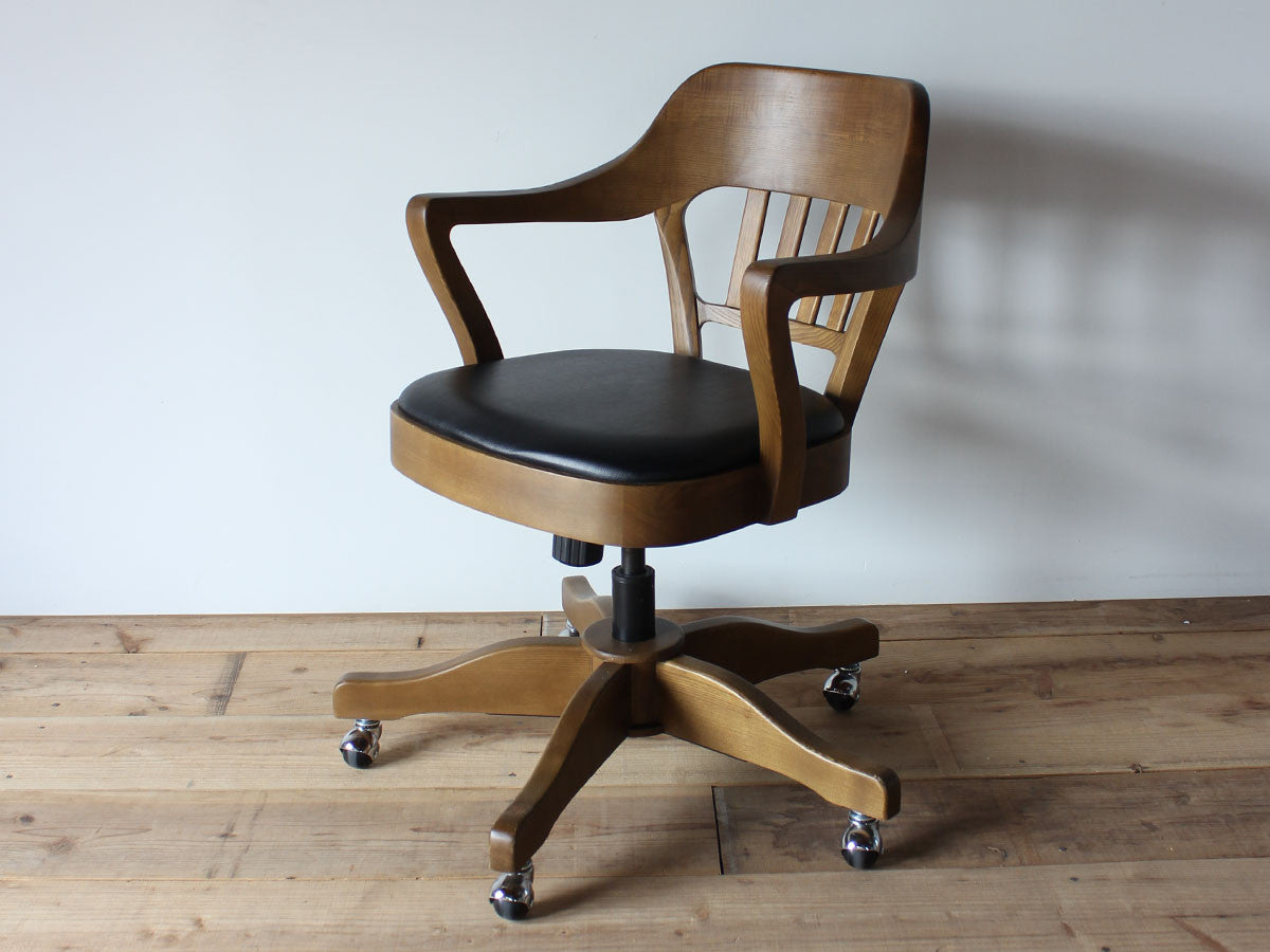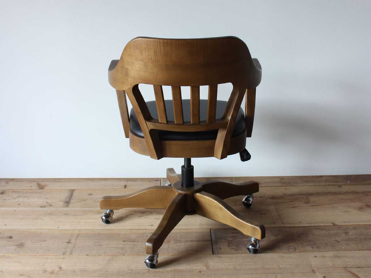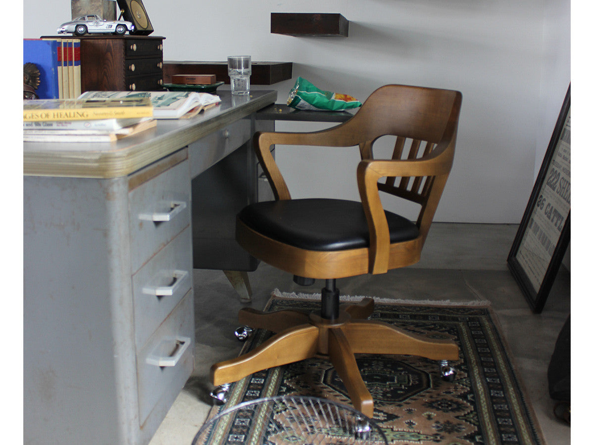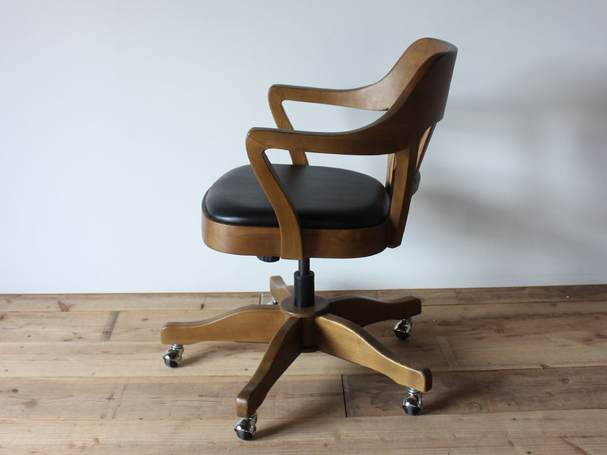 1910~20年代に生産されていたヴィンテージのデスクチェアを元に制作された椅子。ヴィンテージ家具空間に馴染むように仕上げながら、日本人の体型に合わせて扱いやすいように改めてサイジングされています。昇降やリクライニング機能は手軽に調節が出来る現代の仕様となっています。