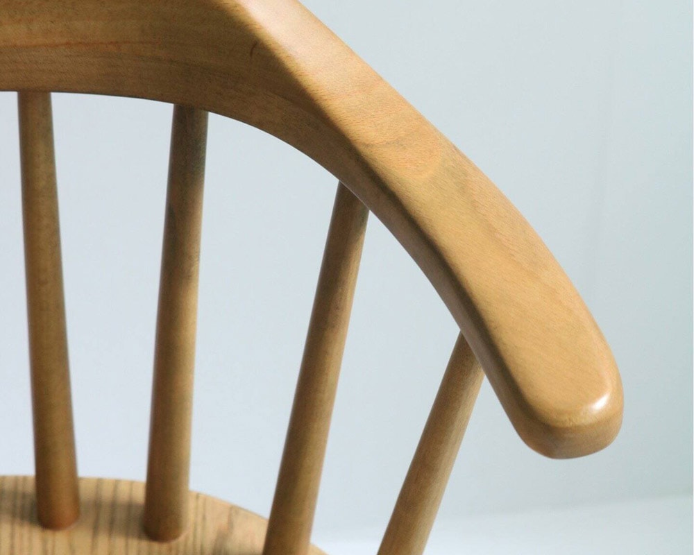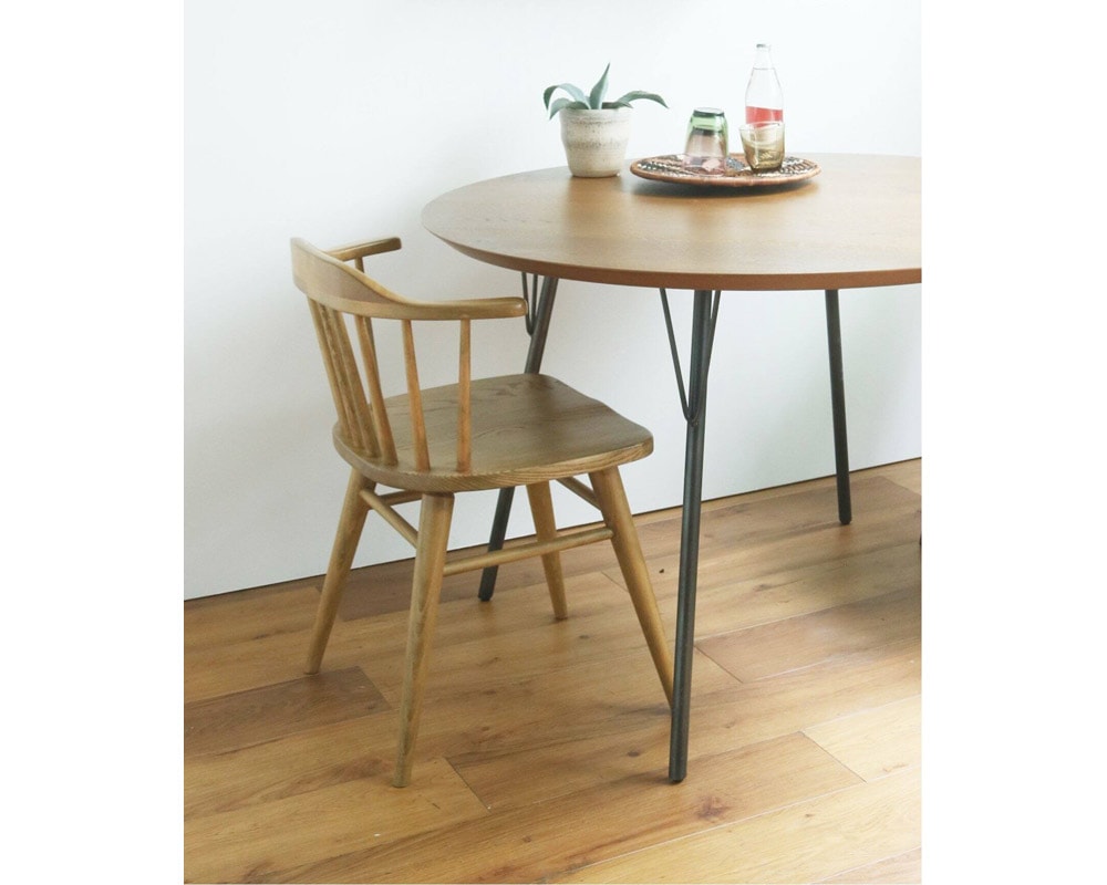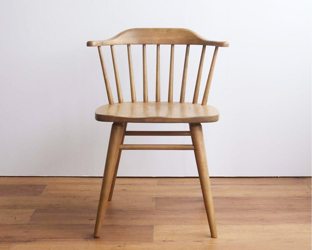アームへの美しい曲線が美しい、ACME FURNITURE/アクメファニチャーの「WINDAN SIDE CHAIR/ウィンダンサイドチェア」です。コナンボール社のラッセルライトとジョージナカシマがデザインしたチェアを元に、お互いの長所を汲み取ってリデザインしたチェアになります。厚い座板に細長い脚が取り付けられ、背もたれ部が細長い棒で作られたデザイン。丈夫で、座面が木のため貼り地の張り替えの必要がなくインテリアの邪魔な印象にもなりません。アーム付きのチェアは肘を支えに手をかけられるので、高齢者の方や、足腰が悪い人は、特に立ち座りが楽にできます。