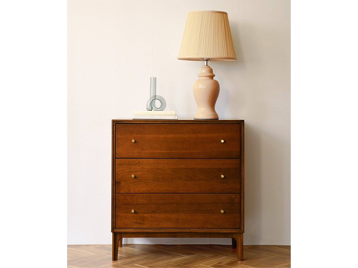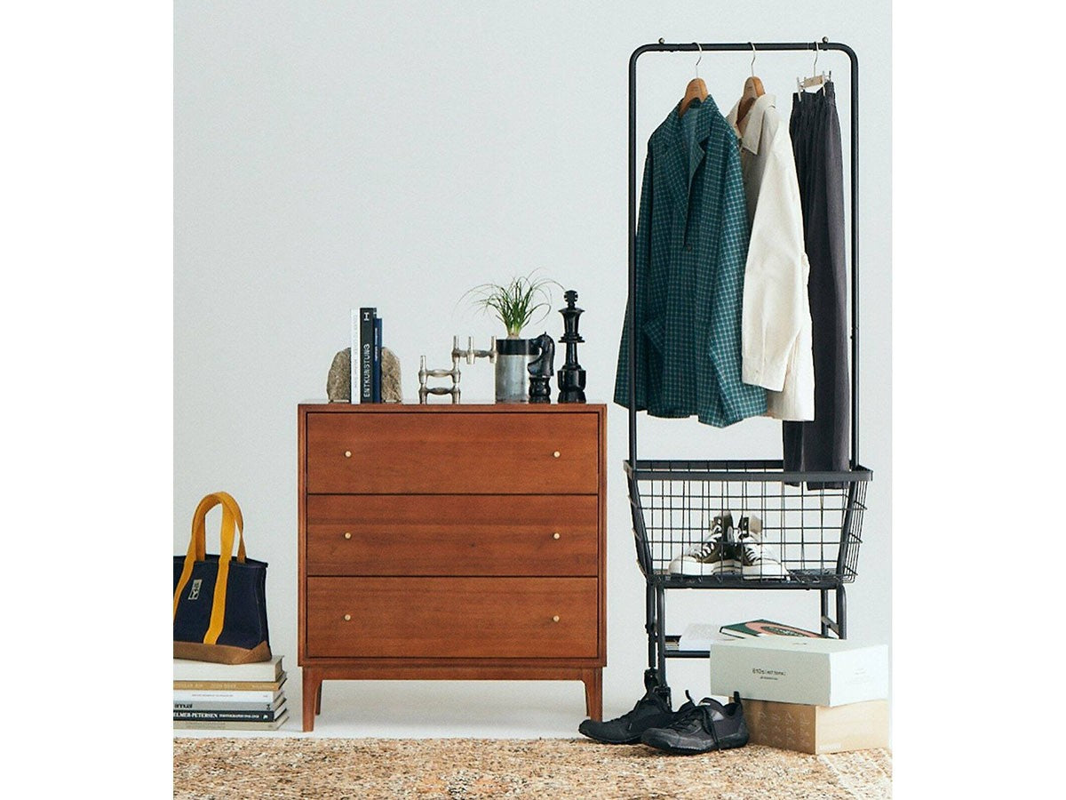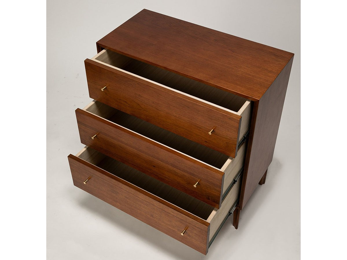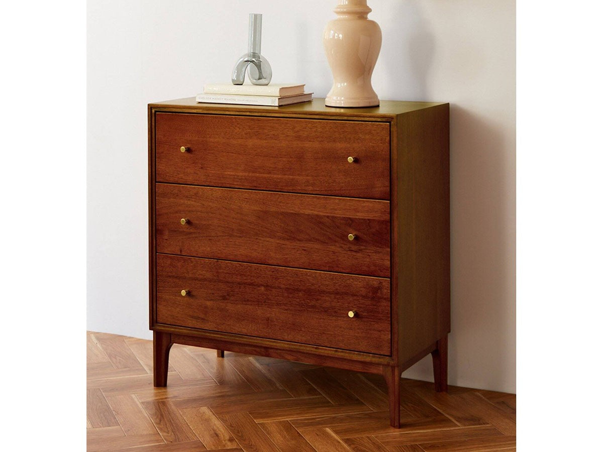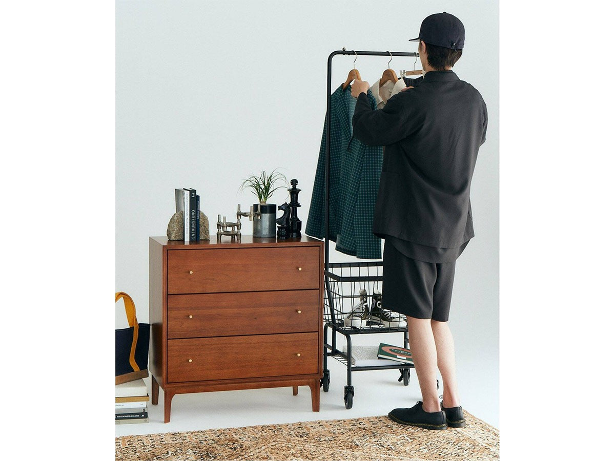 コンパクトな収納家具「BROOKS」シリーズのチェスト。近年では入手困難なアメリカンヴィンテージ家具をモチーフにしたデザインです。3段の引出しには、ミッドセンチュリーデザインを彷彿とさせる真鍮製のツマミを採用しています。ベッドルームやクローゼットで、衣類などを収納するのに最適です。同シリーズの「スモール サーバー」や「スモール ガラスシェルフ」と横並びで使用でき、天板の上にはオブジェや花瓶、時計などを飾って、インテリアをお楽しみいただけます。上部に「スタッキングシェルフ」を組み合わせれば、収納力のある大型のキャビネットを構成することができます。