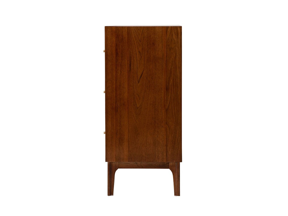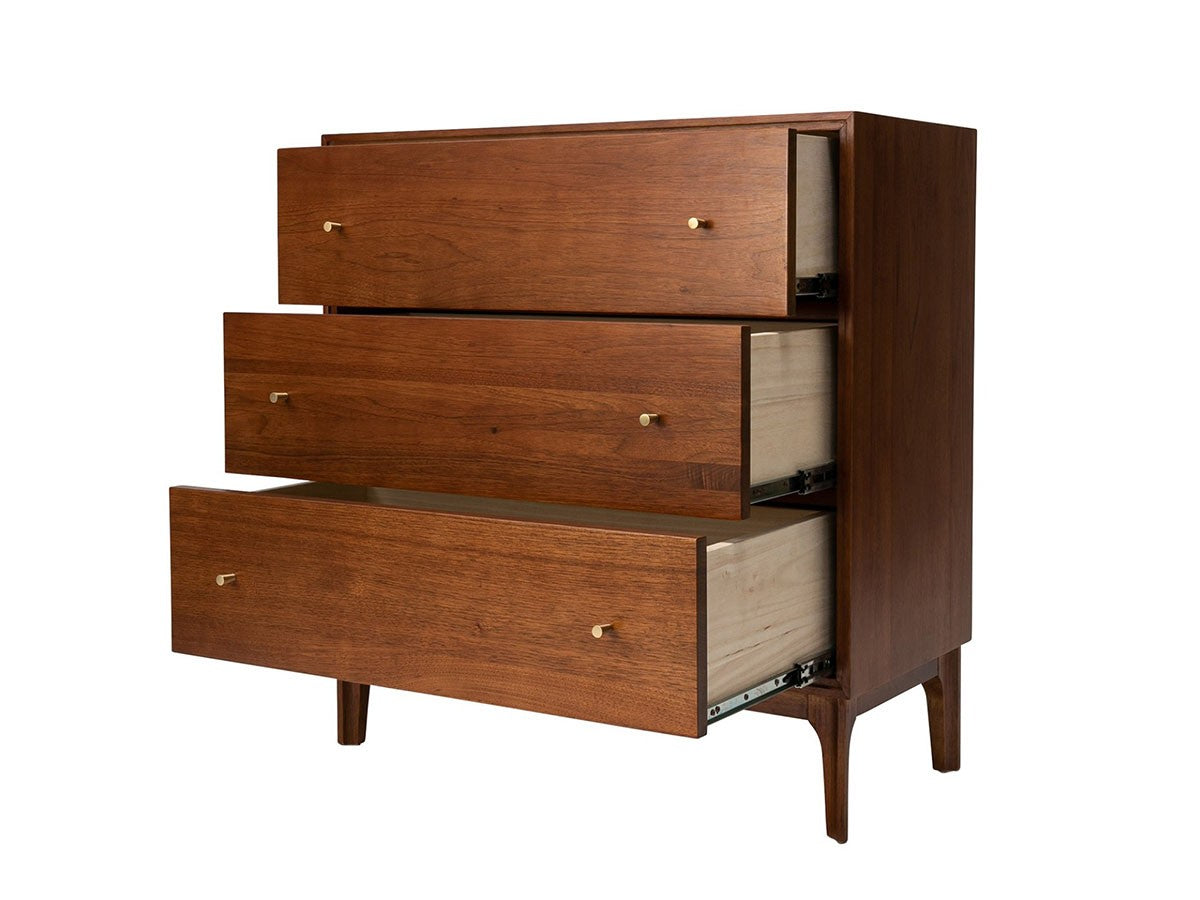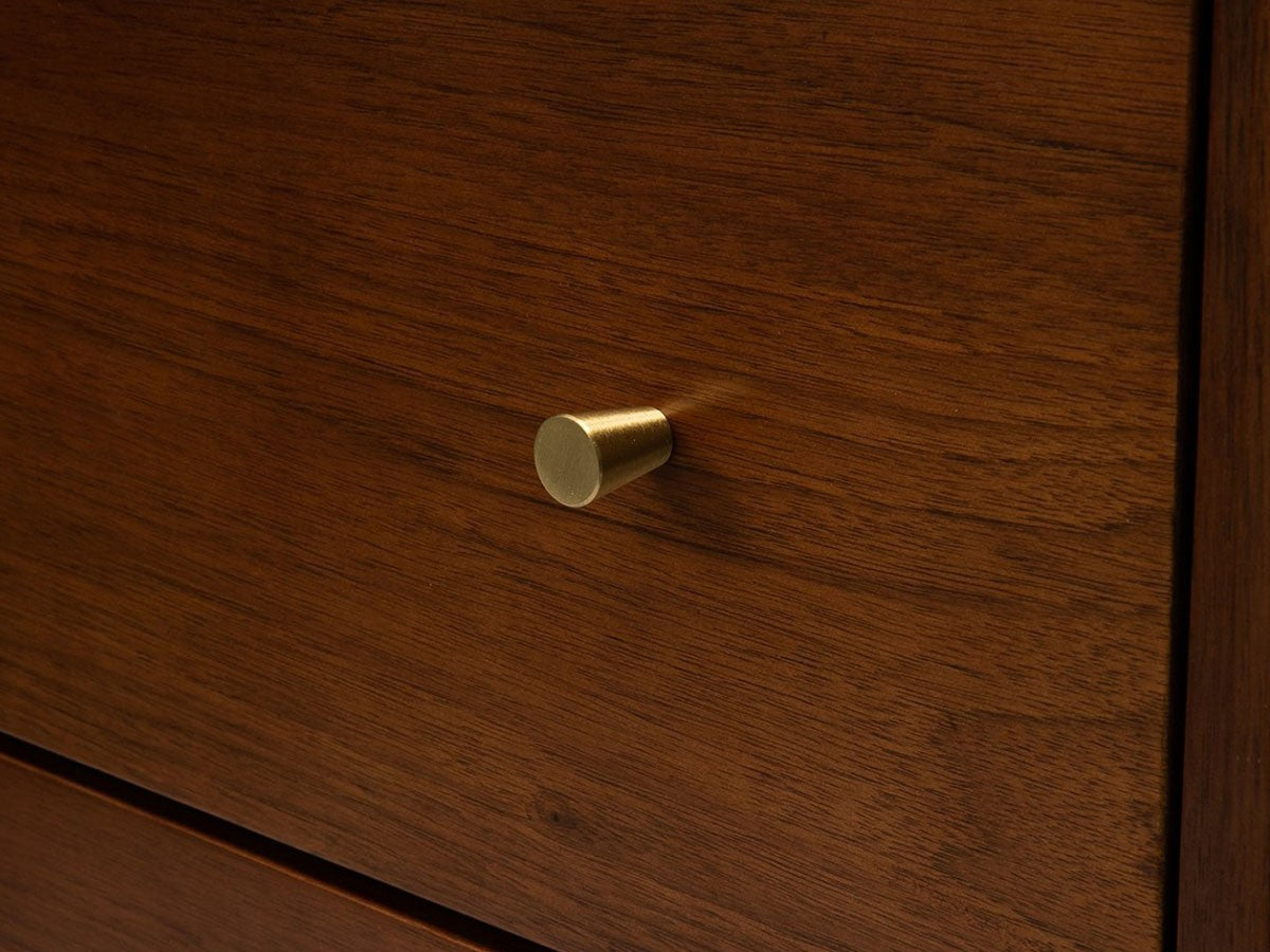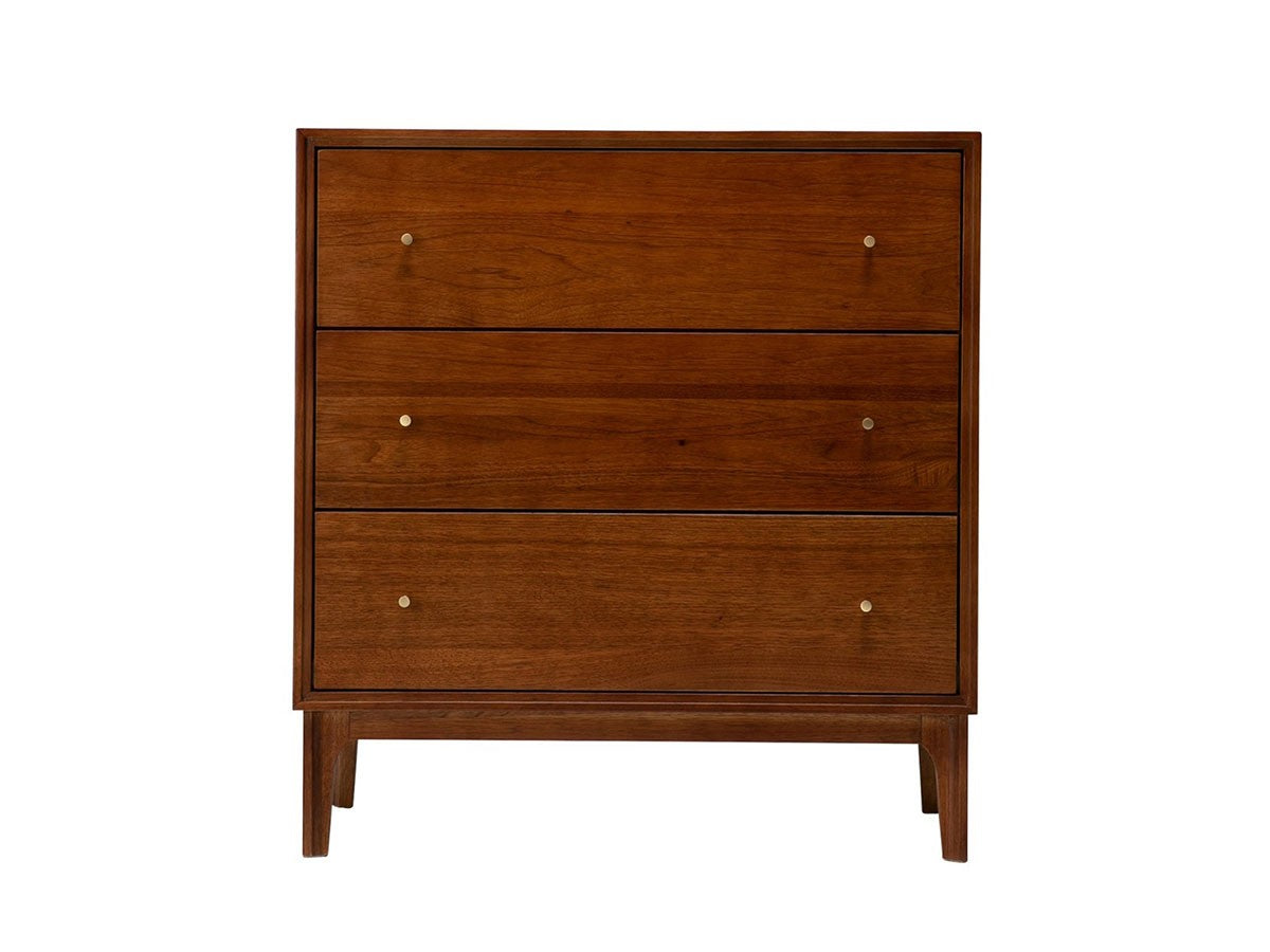 コンパクトな収納家具「BROOKS」シリーズのチェスト。近年では入手困難なアメリカンヴィンテージ家具をモチーフにしたデザインです。3段の引出しには、ミッドセンチュリーデザインを彷彿とさせる真鍮製のツマミを採用しています。ベッドルームやクローゼットで、衣類などを収納するのに最適です。同シリーズの「スモール サーバー」や「スモール ガラスシェルフ」と横並びで使用でき、天板の上にはオブジェや花瓶、時計などを飾って、インテリアをお楽しみいただけます。上部に「スタッキングシェルフ」を組み合わせれば、収納力のある大型のキャビネットを構成することができます。