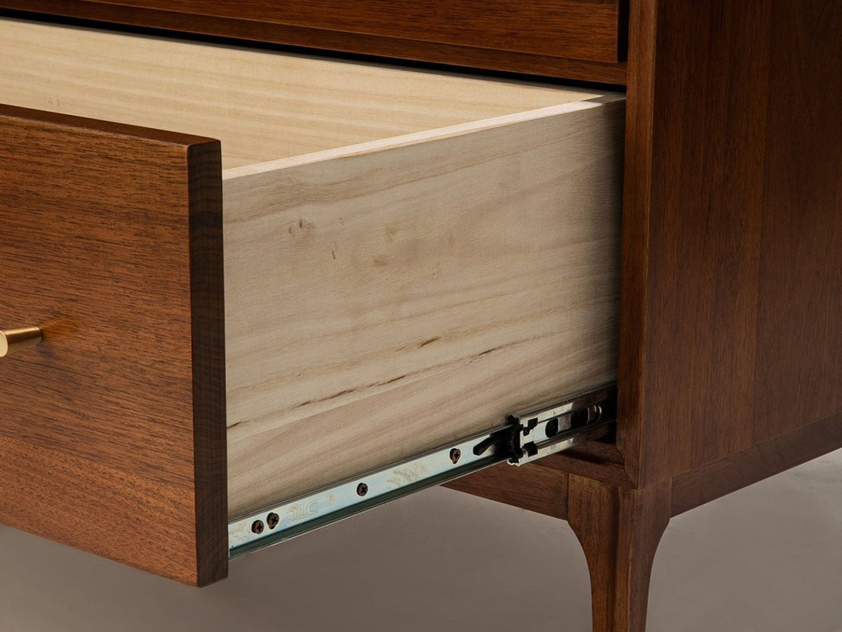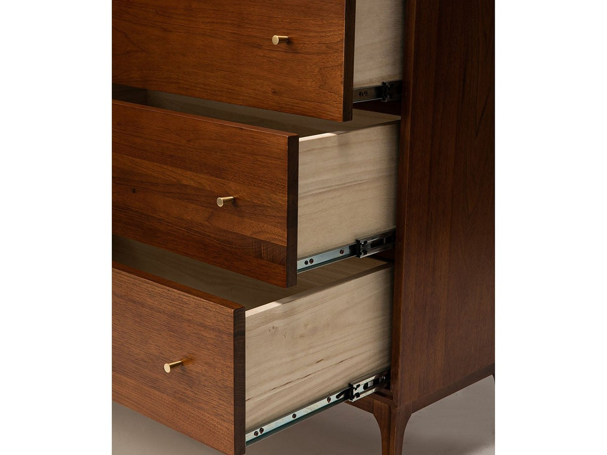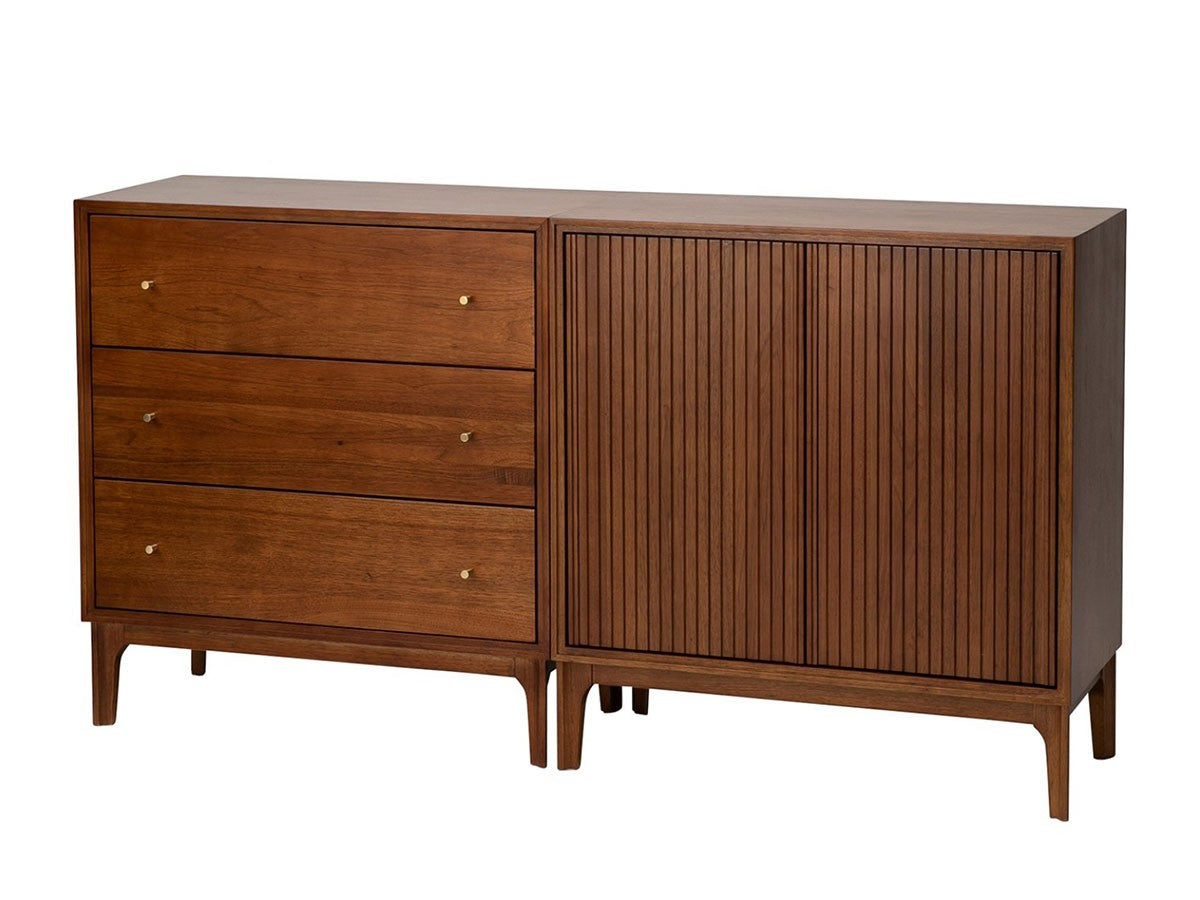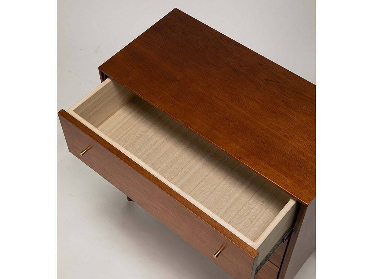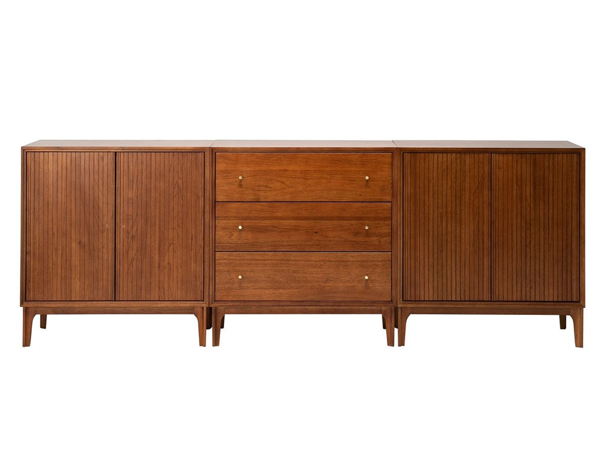 コンパクトな収納家具「BROOKS」シリーズのチェスト。近年では入手困難なアメリカンヴィンテージ家具をモチーフにしたデザインです。3段の引出しには、ミッドセンチュリーデザインを彷彿とさせる真鍮製のツマミを採用しています。ベッドルームやクローゼットで、衣類などを収納するのに最適です。同シリーズの「スモール サーバー」や「スモール ガラスシェルフ」と横並びで使用でき、天板の上にはオブジェや花瓶、時計などを飾って、インテリアをお楽しみいただけます。上部に「スタッキングシェルフ」を組み合わせれば、収納力のある大型のキャビネットを構成することができます。