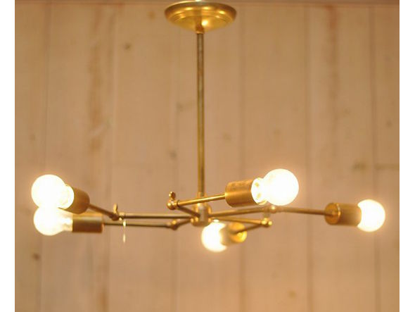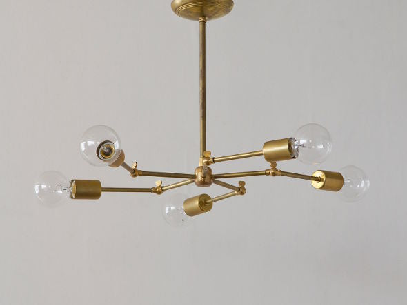 アメリカ映画のワンシーンにでてきそうな、象徴的なフォルムに惹かれるソリッドブラスシリーズ。5アームはパイプ部分を左右に動かし、フォルムの変化を楽しめる仕様です。本体に使用されている真鍮は、アメリカのヴィンテージ家具によく使われている素材でもあり、長年使うことによるくすみや使用感が深みのある風合いをつくりだします。電球は付属しておりませんので、ボール球やシャンデリア球、エジソン球にシリカ電球など、空間のイメージや使用環境によりお好みの電球をお選びください。ミッドセンチュリーインテリアの象徴的な存在でもある、スプートニクランプを彷彿させるフォルムは、アメリカンヴィンテージの雰囲気を存分に感じることができます。レトロ感のあるミッドセンチュリーモダンスタイルや、コンクリートを使用した無機質な空間、古材を使用したインダストリアルスタイルにも相性良くお使いいただけます。