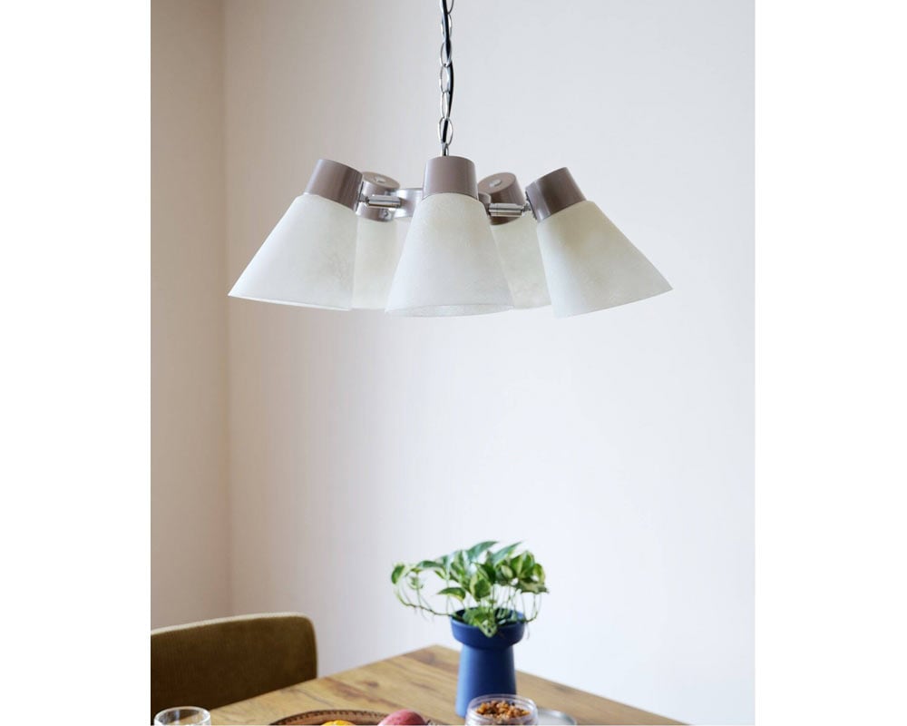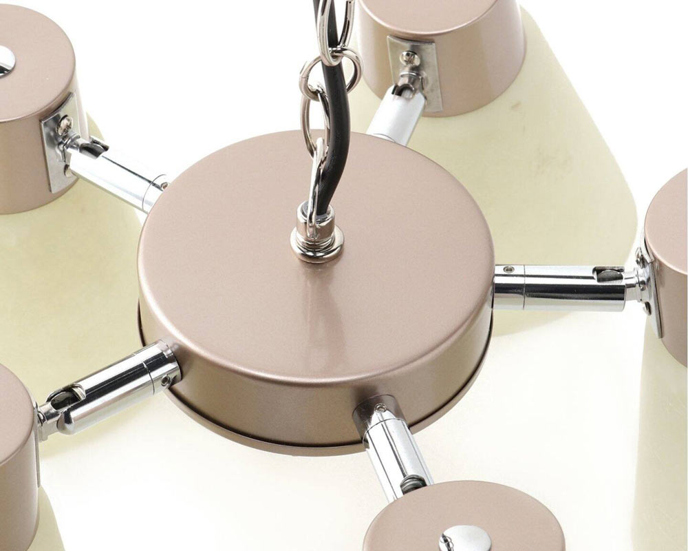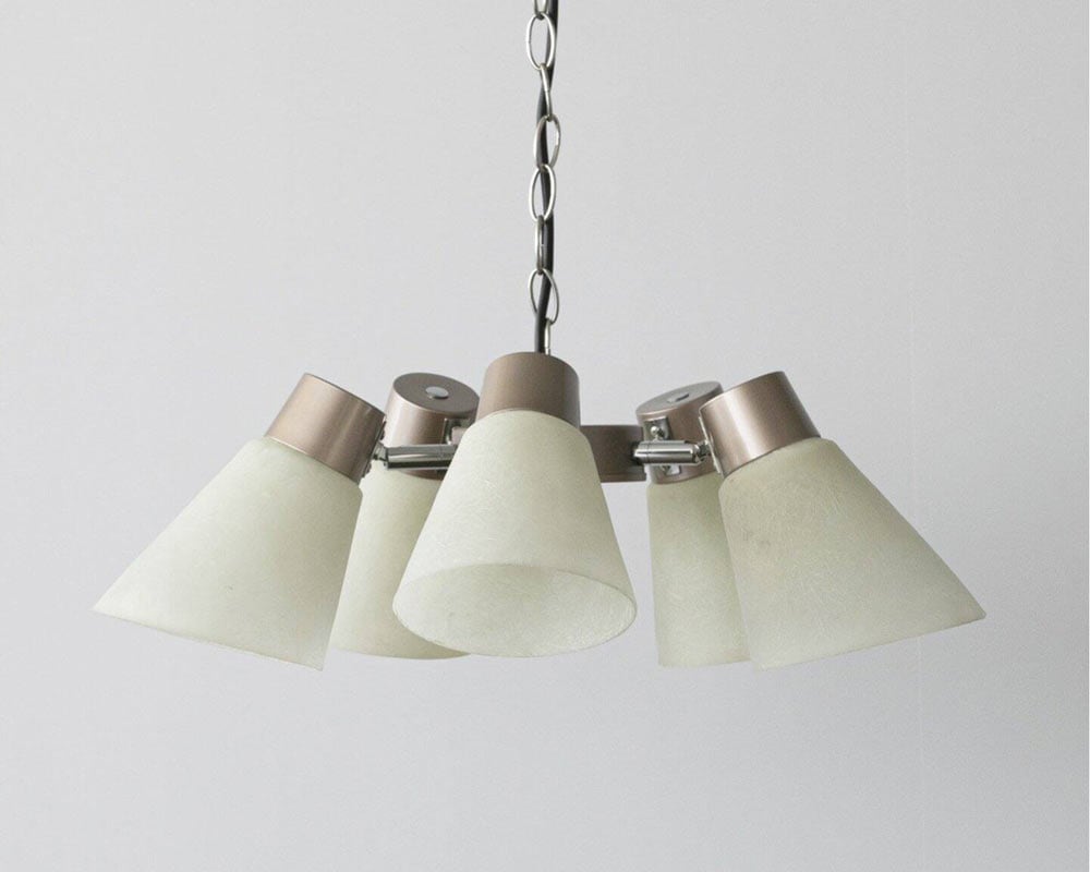 グラスファイバーを使用したヴィンテージ感漂う、ACME FURNITURE/アクメファニチャーの機能的ペンダントランプ「LEO PENDANT LAMP/レオペンダントランプ」です。グラスファイバーは1960年代のデザイナーが好んで使用されていた素材です。当時プラスチックを成型するのには莫大に掛かる金型が必要でしたが、ガラス繊維を骨組みにする事でより成型する事を可能にした素材です。半透明のシェードからこぼれる光の加減が美しく、ガラス繊維が透けて和紙の様に見え、美しく光をこぼす事により空間を柔らかく演出してくれます。ランプのフレーム部分はドイツデザインのように合理的かつ機能的なイメージを取り込み、ベージュベースの中性的なカラーリングをすることにより、空間を選ばず合わせていただきやすく、古き良き工業製品のような風合いを出しています。リモコン式ですので、離れたところにいても気軽に点灯消灯ができます。明るさ(5灯→3灯→2灯→消灯)と切り替えが可能ですので、本を読んだり書いたりする作業をされる時は明るく、音楽を聴いたりユッタリお酒を飲むなどリラックスタイムは暗くしてなど、生活スタイルに合わせて調整が可能です。