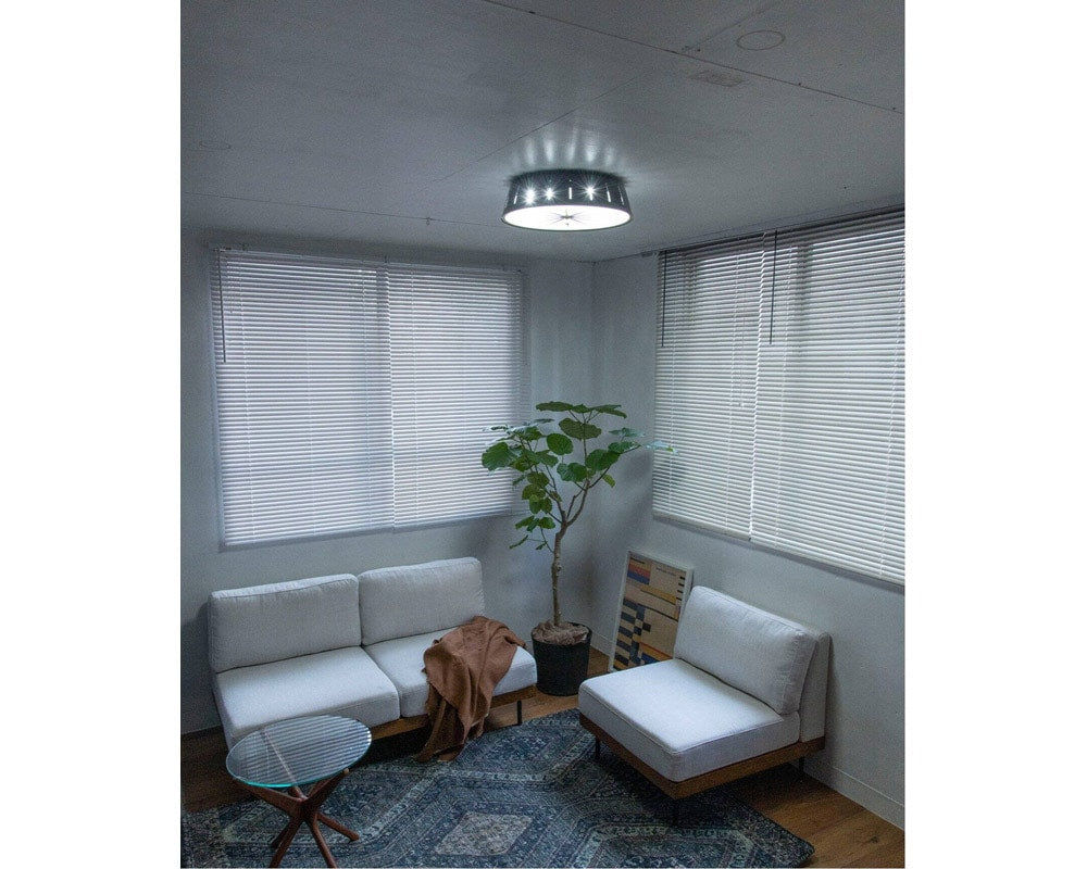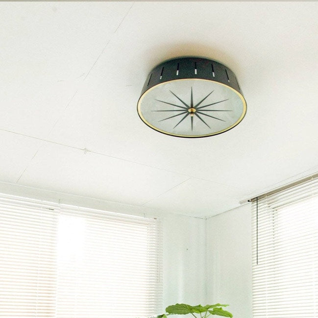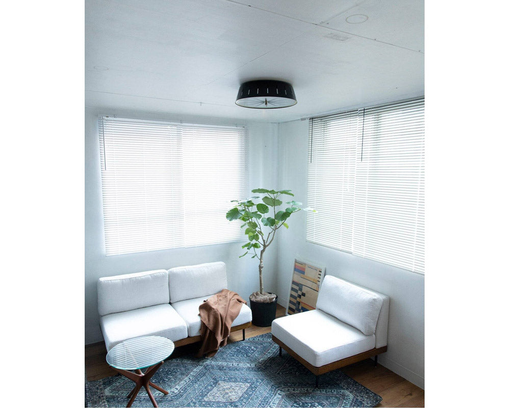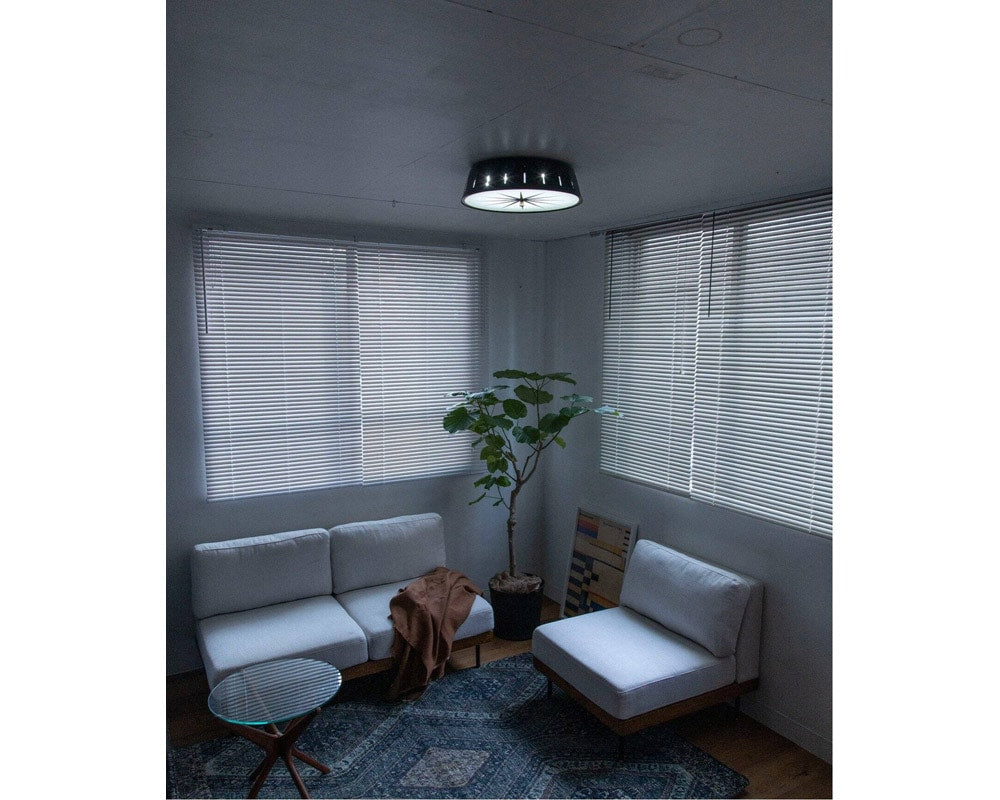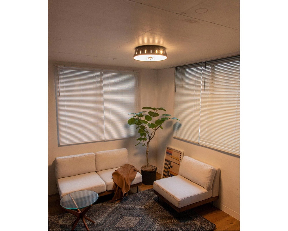 50's〜60'sのUSミッドセンチュリー時代をイメージした、ACME FURNITURE/アクメファニチャーの調光・調色できるLEDシーリングライト「SAGA LED CEILING LIGHT/サーガLEDシーリングライト」です。オリジナルの調光・調色できるLEDシーリングライトです。ACME FURNITUREが提案するミッドセンチュリースタイルに溶け込むシーリングライトをイメージして開発されました。50's〜60'sのUSミッドセンチュリー時代のインテリアアイコンの一つ、アトミックランプを彷彿させるデザイン。この時代のランプはとても個性的で、どれをとっても圧倒されるほどの存在感を放っていました。スペースエイジなデザインを取り入れ、LED器具を採用することで、現代の最新の機能を備えるシーリングライトになりました。サイドのスリットから漏れる光が天井を優しく照らし、その形が盤面の星形のような模様にそっくりなのもまた魅力です。【特徴】 ■光の色味(暖色3000K〜白色6500K)や明るさ(5%〜100%)の切り替えも付属のリモコンで自在に操作可能で、様々なライフスタイルに合ったライティングを楽しむことができます。■〜約12畳までの空間をカバーすることができます。■照明器具本体の厚みは約11センチと薄型設計。取り付けても圧迫感を感じにくいサイズです。■操作性に優れた専用リモコン付き。リモコンは赤外線ではなく「無線式」なので、リモコンを照明器具に向けなくても操作可能です。6チャンネルまであるので同じ部屋に照明を2台設置しても1つのリモコンで個別に操作することが可能です。■スマホアプリ「ROOM SWICH」に対応しています。アプリに照明器具をデバイス追加することで、照明をコントロールできます。■ROOM SWICHアプリはスマートスピーカー(アレクサ、Googleアシスタント)にも対応しています。一度連携すると、スマホなしで音声操作が可能。■付属のリモコンの背面にマグネットが組み込まれていて、スチール製の物に取付ける事ができます。【機能】 ■調光機能(明るさ調節)■調色機能(色味調節)■スマートフォンAPP「ROOM SWICH」対応(アプリの接続にはWi-fi環境が必要です。2.4GHz帯の電波に対応しております。5GHz帯の電波には対応しておりません。お手持ちのルーターにて電波の種類、接続方法をご確認下さい。また購入前にWi-Fiルーターに接続台数の空きがあるか確認してください。)■スマートスピーカー対応(Amazon Echo{Alexa}、Google Nest{Googleアシスタント})