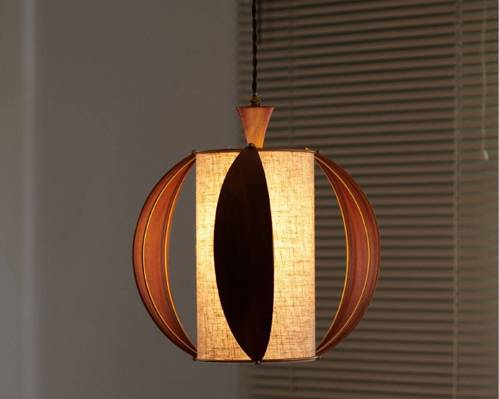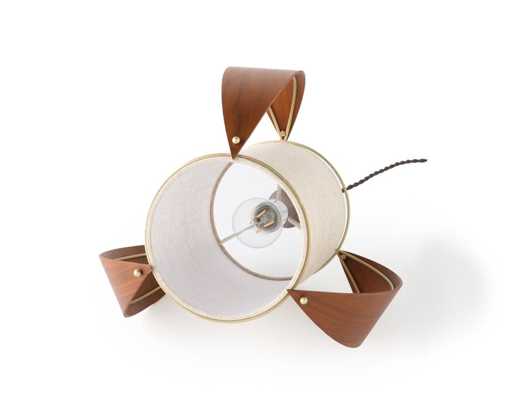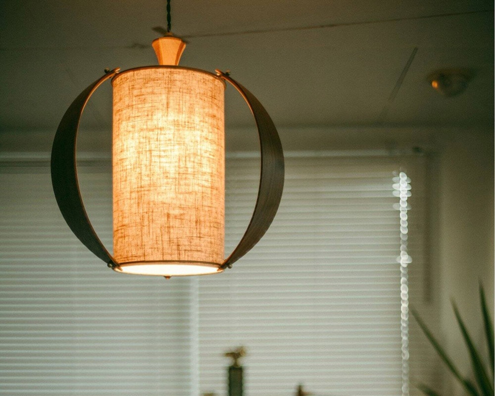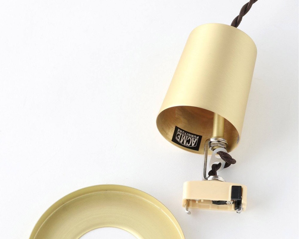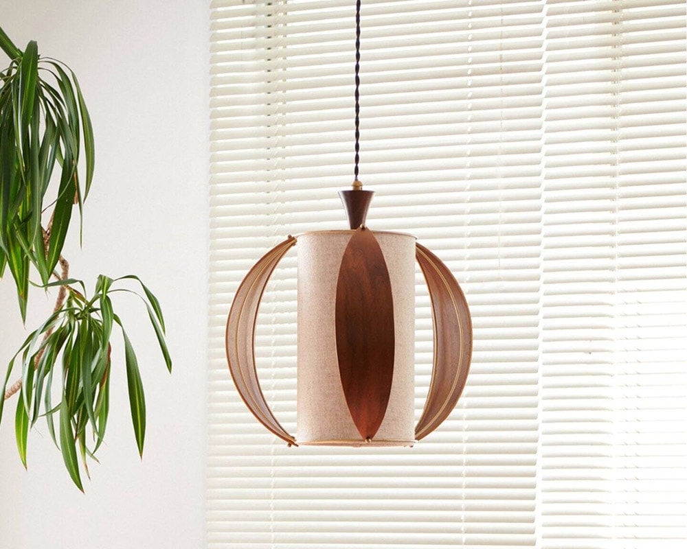 アメリカ・ミッドセンチュリーがルーツの、シェードを覆う3枚のプライウッド・リーフが特徴的な ACME FURNITURE /アクメファニチャーの「WOODEN LEAF PENDANT LAMP / ウッデンリーフペンダントランプ」です。ミッドセンチュリー期のデザインを彷彿させる、ウォルナットのプライウッド材を使用した美しいリーフが、光源をやわらかく包むシェードを覆い、やさしく空間を灯すランプです。特徴的な球体の造形とマテリアルミックスの装飾性のバランスが素晴らしく、その意匠はよき時代を象徴するマテリアルの一つであるPLYWOOD=成形合板でリーフを表現。ウォルナットの直線的な木目と黄金色のスチール、シェードの織り感。異なる質感のバランスがよく、落ち着いた佇まいに仕上がっています。色味はヴィンテージ家具の様に経年による日焼けで程よい飴色を再現。特徴的な球体のデザインが天井空間のアイコンとなり、心地の良いリラックスする明るさの空間を演出してくれるランプです。フランジカップの中でコードの長さを調整できるので、ランプをすっきりとお好みの高さに設定することができます。