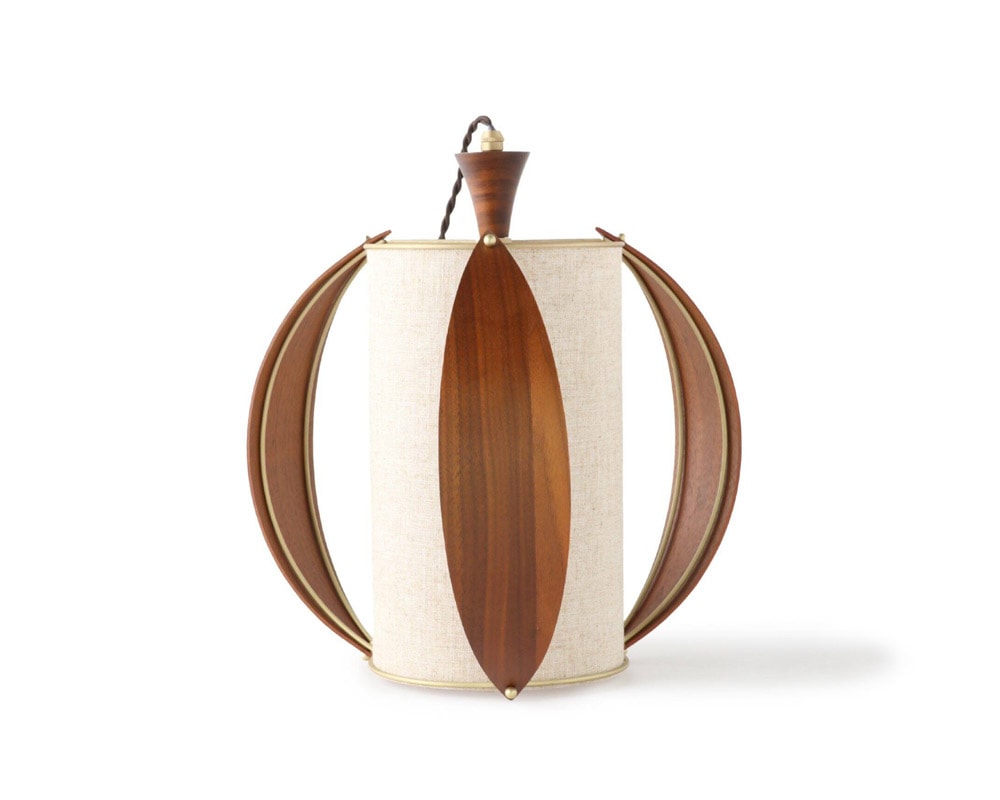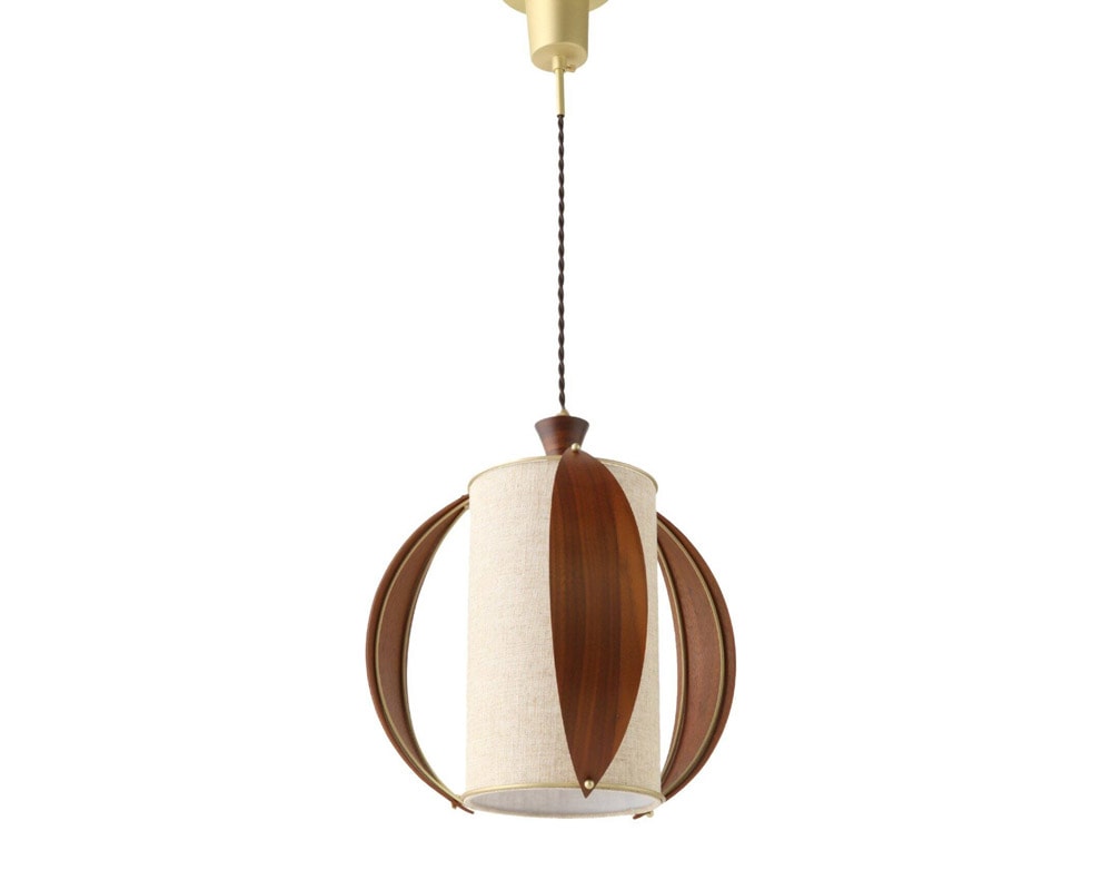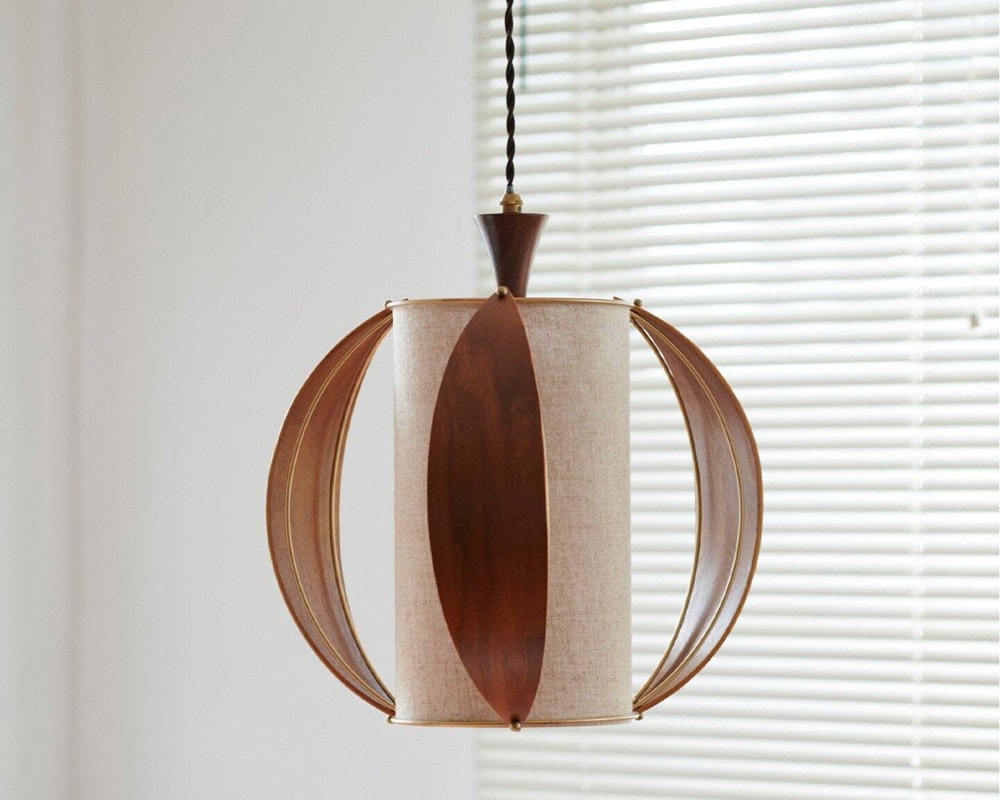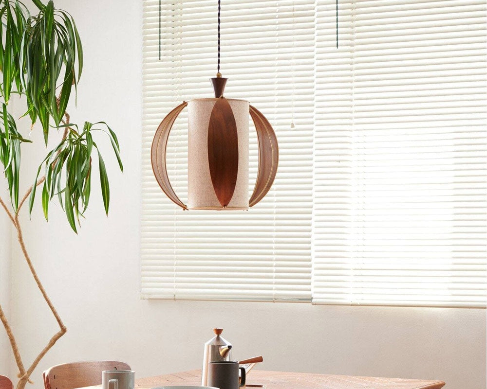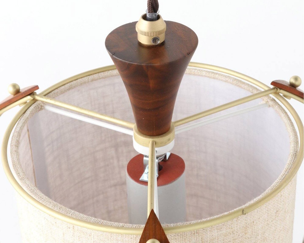 アメリカ・ミッドセンチュリーがルーツの、シェードを覆う3枚のプライウッド・リーフが特徴的な ACME FURNITURE /アクメファニチャーの「WOODEN LEAF PENDANT LAMP / ウッデンリーフペンダントランプ」です。ミッドセンチュリー期のデザインを彷彿させる、ウォルナットのプライウッド材を使用した美しいリーフが、光源をやわらかく包むシェードを覆い、やさしく空間を灯すランプです。特徴的な球体の造形とマテリアルミックスの装飾性のバランスが素晴らしく、その意匠はよき時代を象徴するマテリアルの一つであるPLYWOOD=成形合板でリーフを表現。ウォルナットの直線的な木目と黄金色のスチール、シェードの織り感。異なる質感のバランスがよく、落ち着いた佇まいに仕上がっています。色味はヴィンテージ家具の様に経年による日焼けで程よい飴色を再現。特徴的な球体のデザインが天井空間のアイコンとなり、心地の良いリラックスする明るさの空間を演出してくれるランプです。フランジカップの中でコードの長さを調整できるので、ランプをすっきりとお好みの高さに設定することができます。