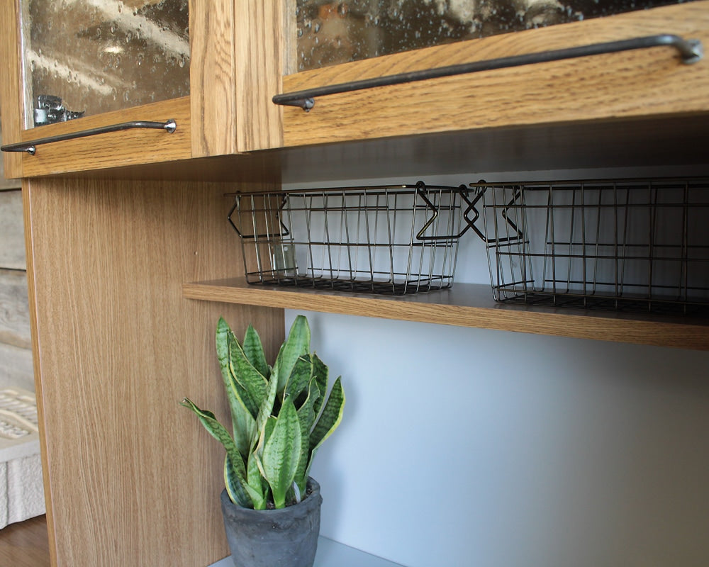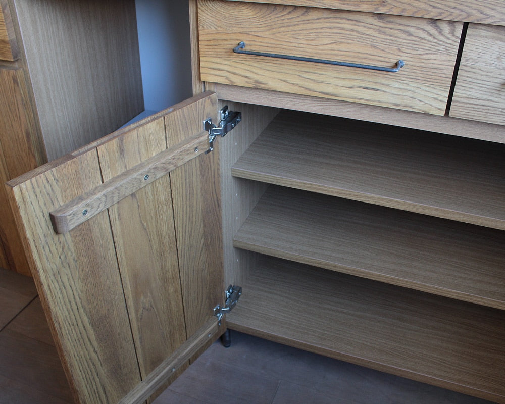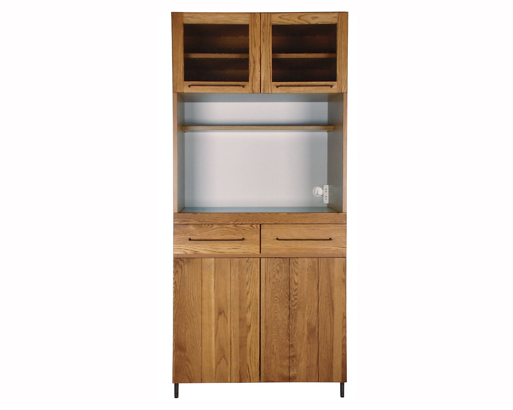 オーク無垢材とスチールを組み合わせたCadeal/カデルシリーズのキッチンボードです。しっかりとした収納力もありながら、サイズ的にも使いやすい幅800mmタイプです。ナチュラルな雰囲気でありながら、メンズライクなスチールがデザインのアクセントとなり、余計な装飾を省くことで様々なキッチンや家具と合わせやすく、ダイニングと統一感を出すことができます。正面の前板は無垢材を使いながら、 フレームには水気や湿気に強いポリ合板を、 内部には脱湿効果のある桐材を使用しており、細部までキッチンで使用することを想定した、デザインと実用を両立した仕様です。また、オープンスペースにはコンセント2口が付けられていて、下面にはスライドレールが仕込まれ、外に引き出せるようになっていますので、炊飯器等の設置にも最適な仕様です。デザインとしっかりとした収納力、さらに機能性を両立したCadeal/カデルキッチンボードは、ナチュラルなお部屋にはもちろんビンテージでコーディネートしたお部屋などにも良く合います。