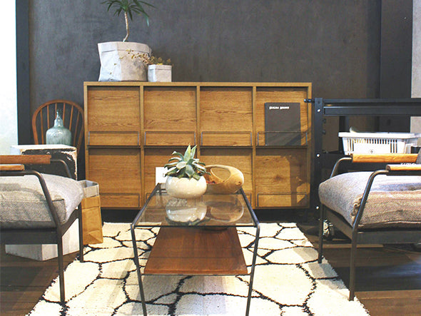 趣味のアイテムを前板にディスプレイして楽しむことができるレコードラック。木目の強い節のある木材やアイアンパーツを使い、ナチュラルながらもヴィンテージ感が漂う佇まいです。全ての箱に可動棚が1枚ずつ付属しているので、収納する物に合わせて高さの調整が可能。お気に入りの表紙の雑誌や本、レコードや写真など前板に何を飾るかで印象が違って見えるため、気軽にお部屋の雰囲気を変えて楽しむことができます。木目の純粋で優しいトーンとスチールのすっきりとしたラインの印象が特徴のカデルシリーズ。様々なシチュエーションに合わせたシリーズ展開は、個々でお楽しみいただけるのはもちろん、揃えていただくことでキッチンからダイニング、そしてリビングを一つの空間として感じさせます。