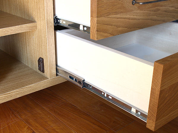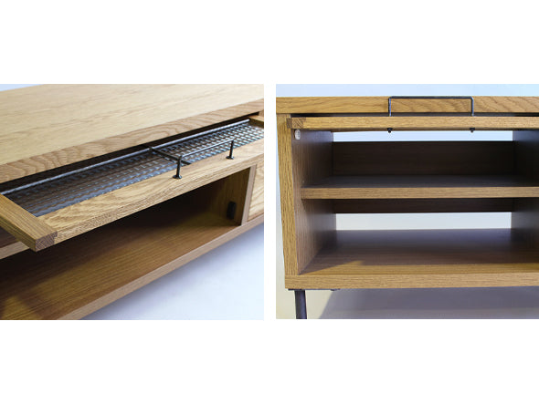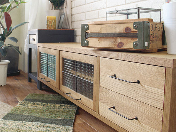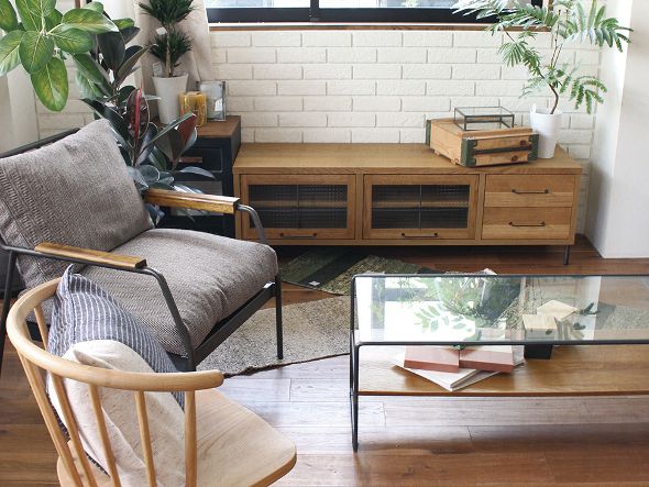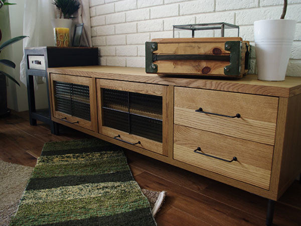 オークの無垢材とスチールを組み合わせたカデルテレビボード。ナチュラルな雰囲気を保ちつつ取手や脚部のメンズライクなアイアンをアクセントとして合わせることで、インダストリアルな印象をあわせ持っています。ガラスも飾りガラスのため、中の機器の状態を開けることなく見せながらも、メカニカルな雰囲気をやんわりと軽減します。フラップ式の扉は配線作業や機器を出し入れする際に便利なように、開いたときに上部に収納することができる仕様。中の棚板は高さの調整が可能です。無垢材の味わいを生かすため節を除くことなく丁寧に処理して残し、木の質感を楽しんでいただける仕上げとなっています。