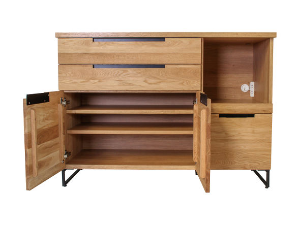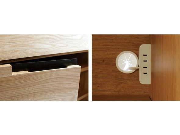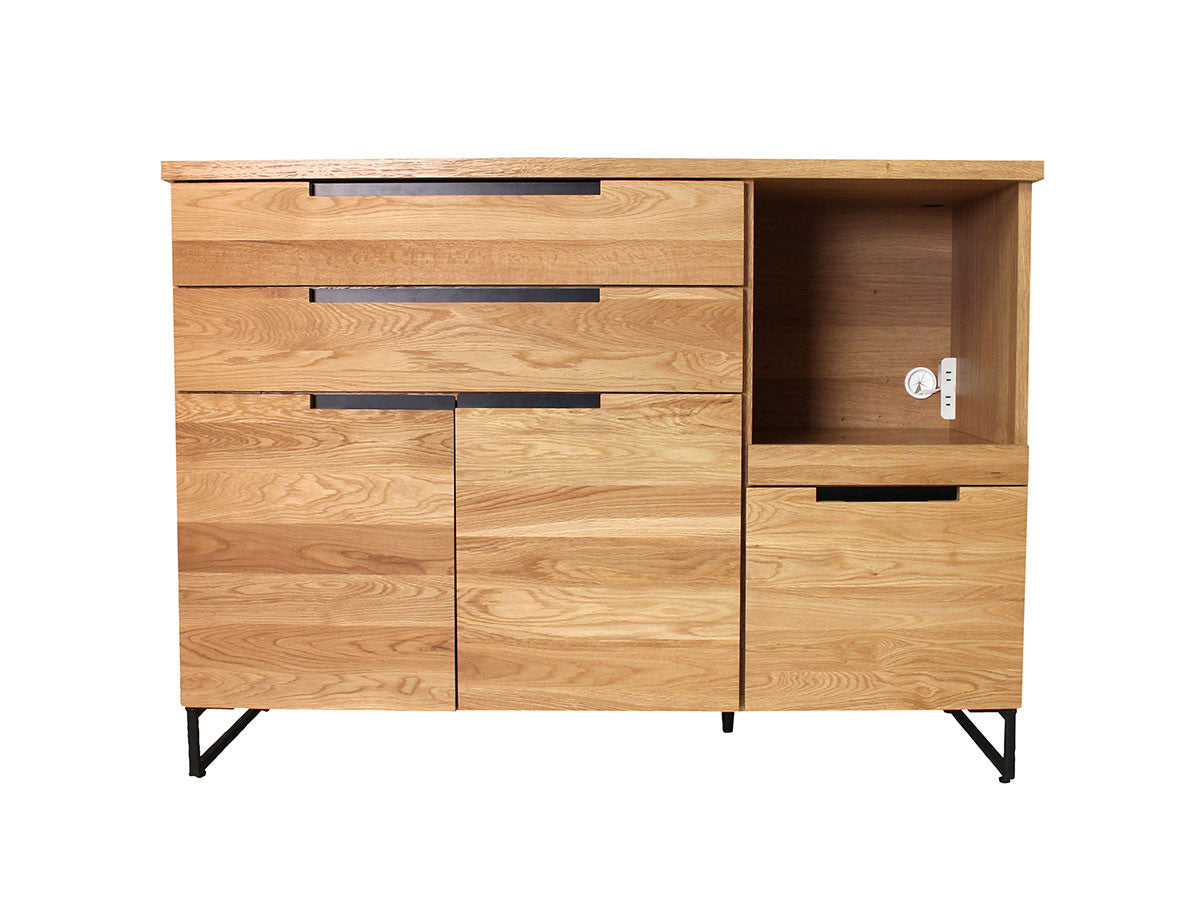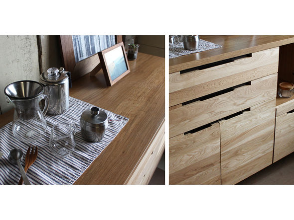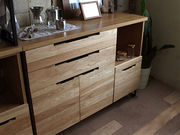 ナチュラルなオーク無垢材と、黒塗装されたスチールを組み合わせたスプレムシリーズのカウンターボード。オーク材は色味を揃えずにあえてランダムにデザインされ、節目などもそのまま使用することにより、木の自然な表情が美しく表現されています。脚や取っ手部分の無機質なブラックスチールが全体を引き締めています。フレームには水気や湿気に強いポリ合板を使用し、引出し内部には脱湿効果のある桐材が使用され、実用性や収納力を兼ね備えたデザインとなっています。清潔感とユーズド感がミックスされたデザインなので、ナチュラルモダンや北欧ヴィンテージ、和モダンなど幅広いテイストにに合わせることができます。左上と右下にサイズの違う引出しがあるため、アイテムの大きさによって分けることができます。左下の扉収納には可動棚が2枚付いているため、収納するものによって高さを調整することができて便利です。右上のオープンスペースはスライドレールになっているので、水蒸気が出る炊飯器やポットなどを配置すると、熱や蒸気などを逃がしてくれるため、安心してお使いいただけます。