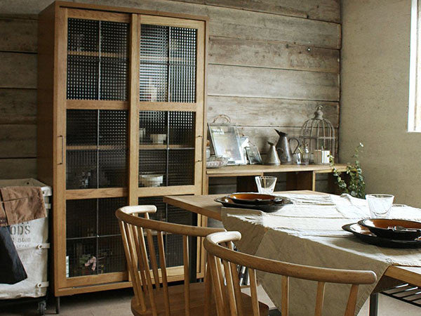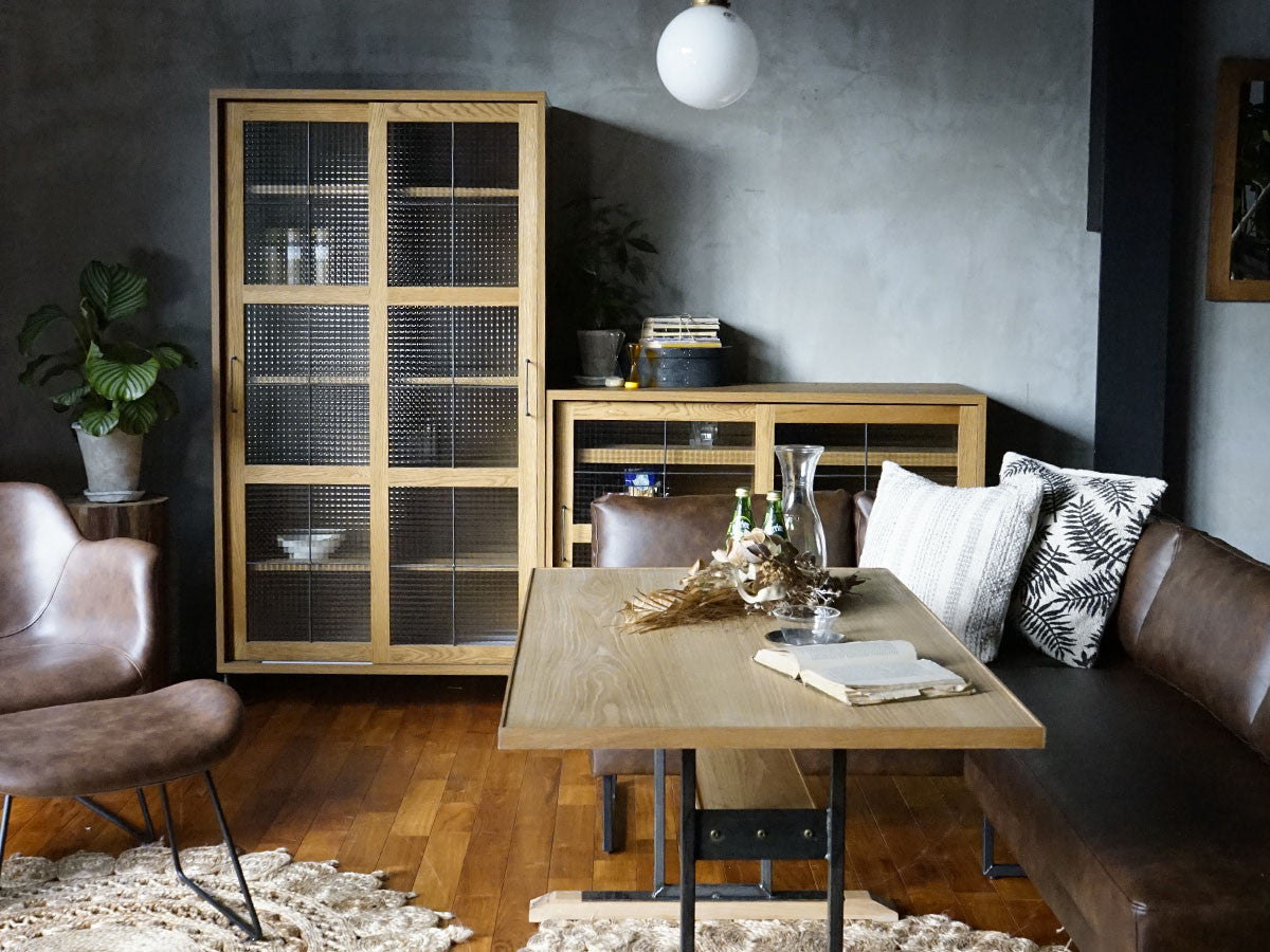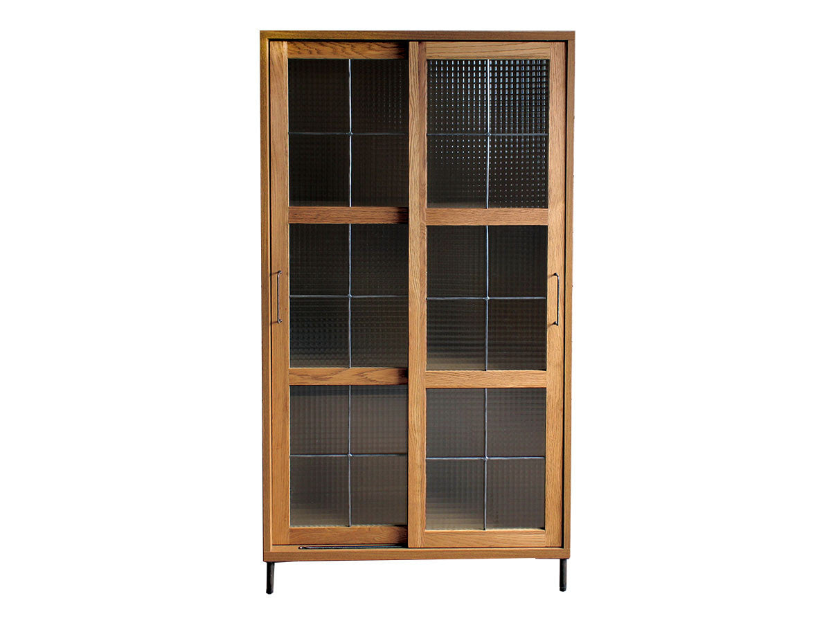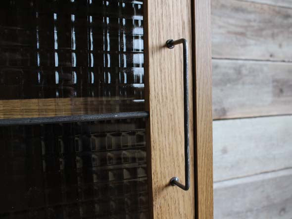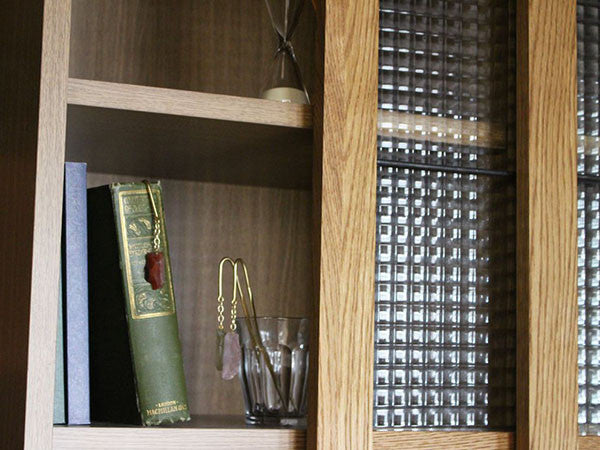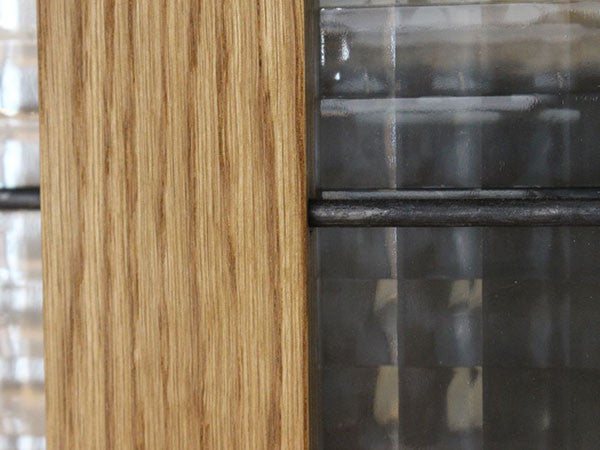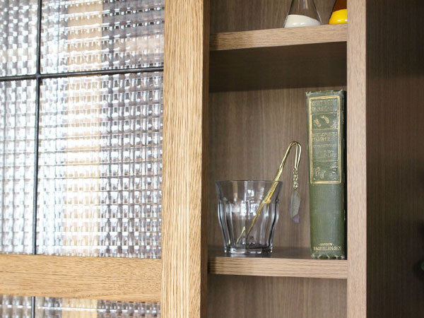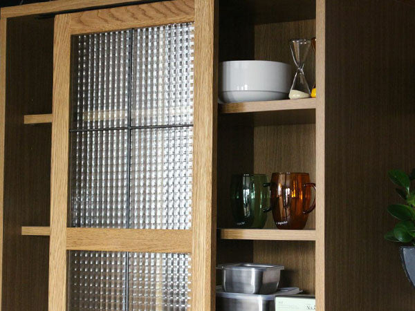 オークの無垢材とスチールを組み合わせたカデルシリーズのガラスキャビネット。レトロな雰囲気のモザイクテクスチャーガラスは、中に収納するものを程よく隠しながらも光を取り込むため重たい印象になりません。メンズライクなスチールがデザインのアクセントとなり、余計な装飾を省くことで様々なキッチンや家具と合わせやすいデザインです。3段の固定棚のほかに、可動棚板が6枚付属しますので、ダイニング、リビング、書斎など、設置する場所や収納する物に合わせて棚間を調節してご使用いただけます。