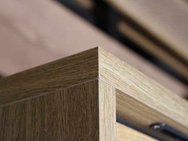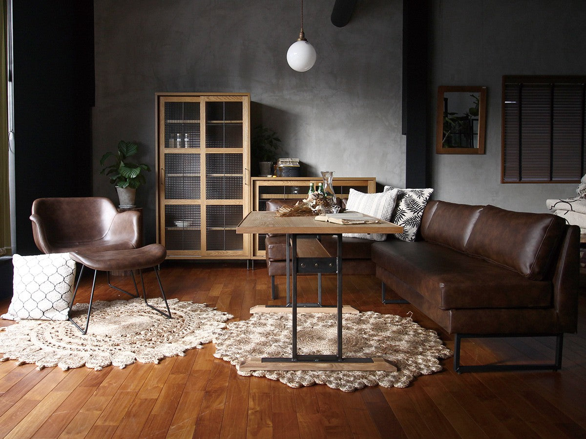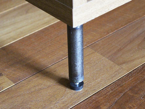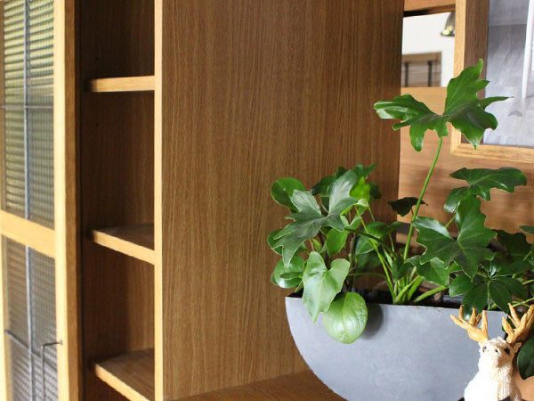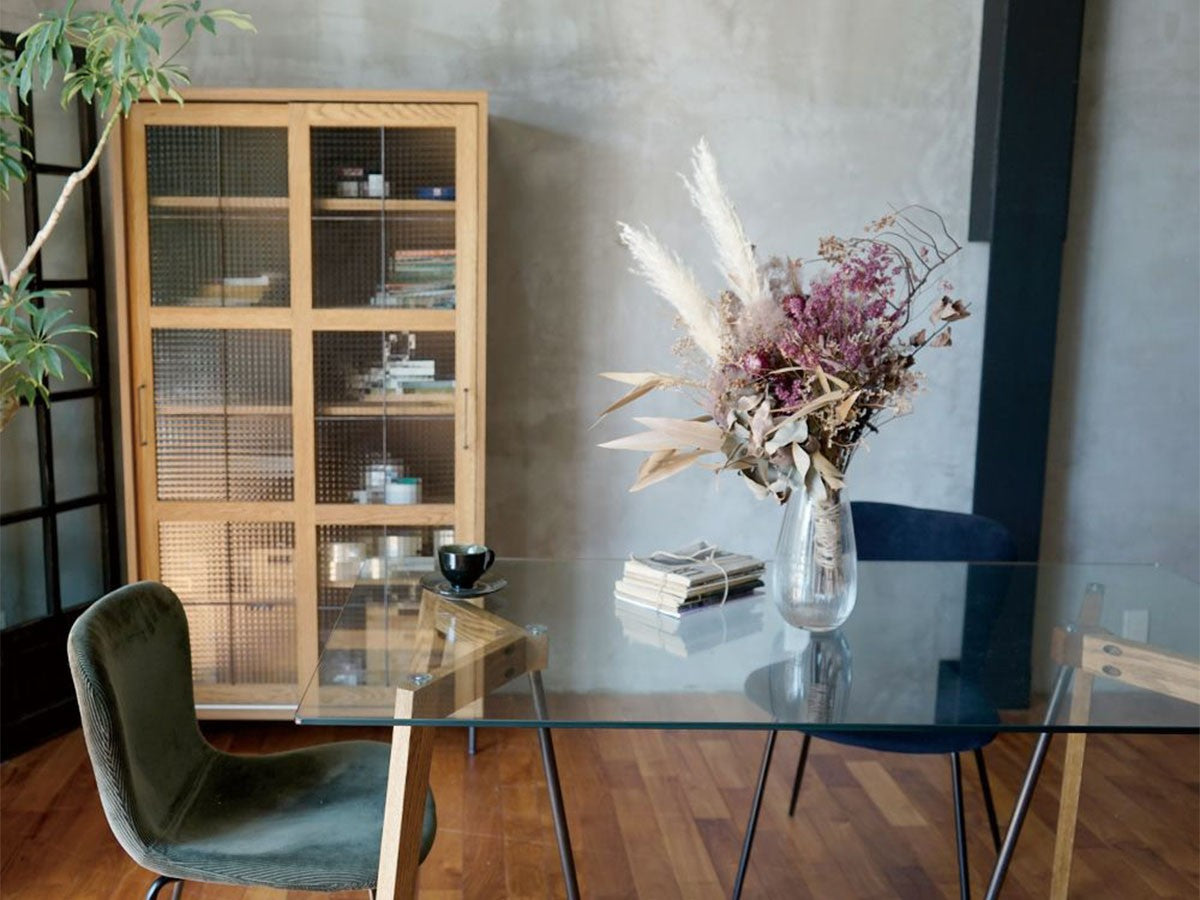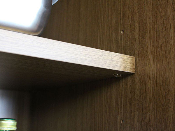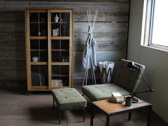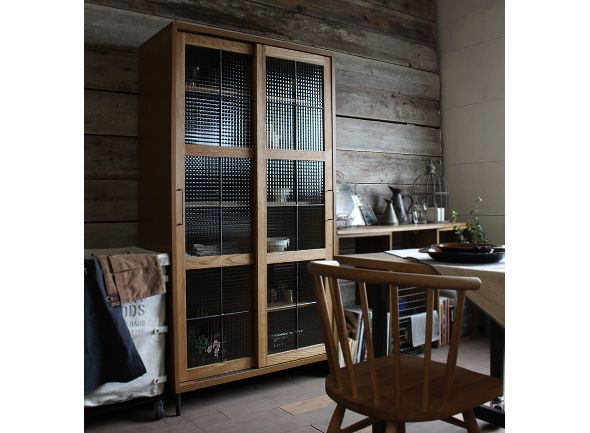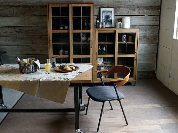 オークの無垢材とスチールを組み合わせたカデルシリーズのガラスキャビネット。レトロな雰囲気のモザイクテクスチャーガラスは、中に収納するものを程よく隠しながらも光を取り込むため重たい印象になりません。メンズライクなスチールがデザインのアクセントとなり、余計な装飾を省くことで様々なキッチンや家具と合わせやすいデザインです。3段の固定棚のほかに、可動棚板が6枚付属しますので、ダイニング、リビング、書斎など、設置する場所や収納する物に合わせて棚間を調節してご使用いただけます。