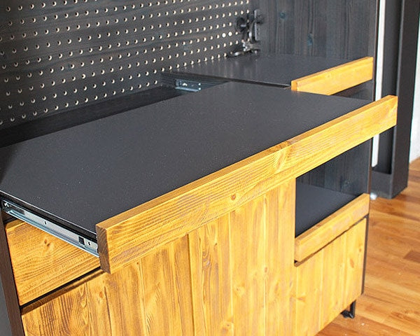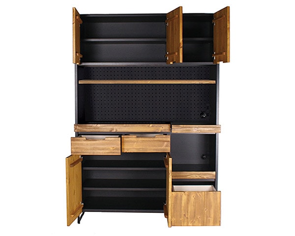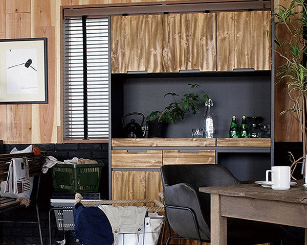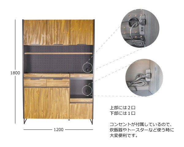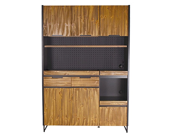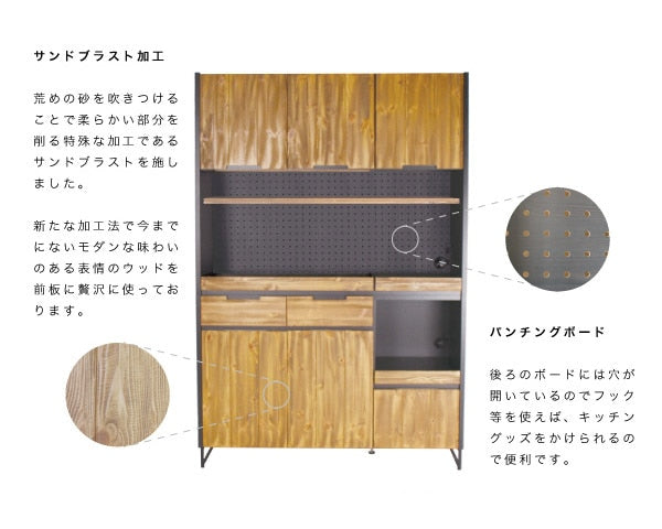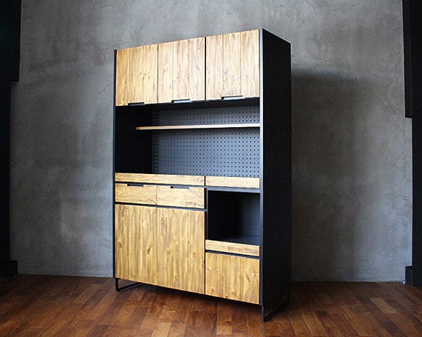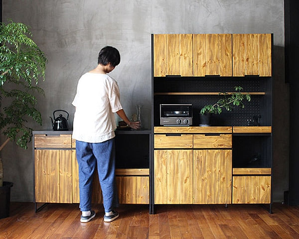 パイン材を使用したカントリーテイストをa.depeche/アデペシュらしく現代風にアレンジしたmodage/モダージュシリーズのキッチンボードです。味わいの出やすいパイン無垢材をベースに、ブラックのフレームやアイアンパーツをバランスよく組合わせ、現代カントリー風にアレンジ。モダンな空間にも合わせやすくなっています。パイン材はヴィンテージ感を表現するためにサンドブラスト加工が施され、木目を強調した独特な手触りと艶のある質感に仕上げられています。温かみのある風合いはグリーン等との相性も抜群で、経年変化によって雰囲気の良い飴色へと変化していきます。大小2ヵ所のオープン部分はスライド天板仕様になっていて、使い勝手も非常に良くなっています。また、背板は有孔ボードにすることで、フック等を使ってキッチングッズを掛けたり、有孔ボード用のパーツを使用することで棚をつけたりすることも可能です。コンセントは上部に2口、下部に1口の計3口付き。炊飯器や電子レンジ、オーブンなどの調理器具を使用するのにとても便利です。扉収納の内部は可動棚仕様ですので、収納する物に合わせて高さを変えることができます。新しい試みの現代風カントリーmodage/モダージュシリーズは、他にキッチンカウンター、ダイニングテーブルや、チェア等も揃っていますのでトータルコーディネートも可能です。