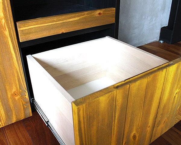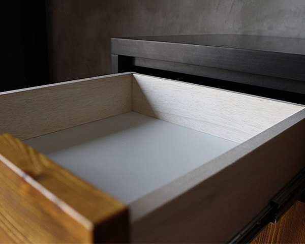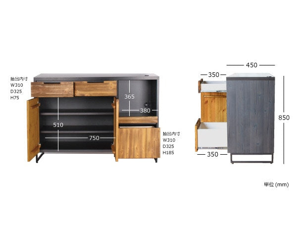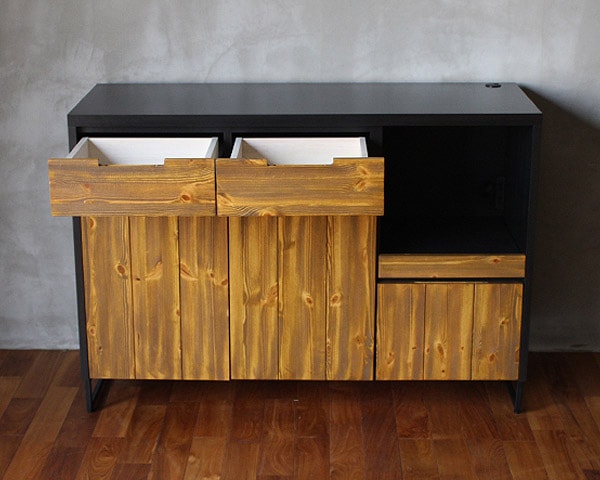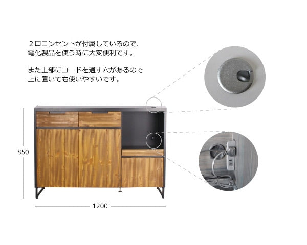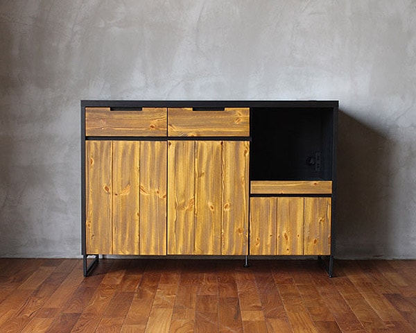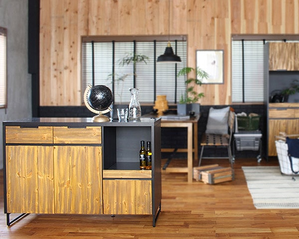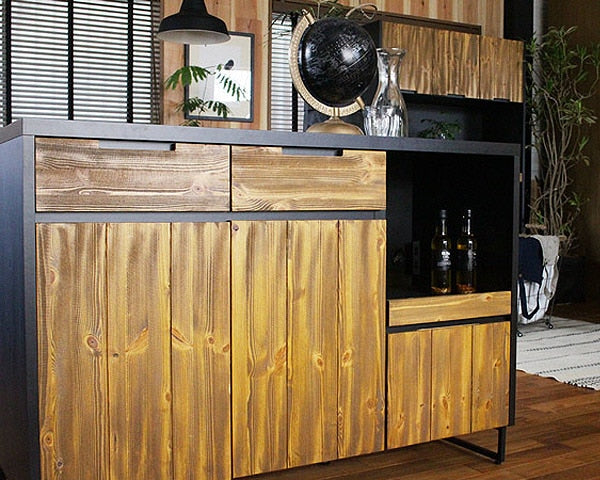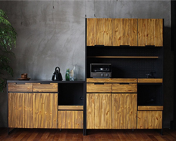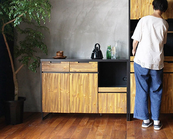 パイン材を使用したカントリーテイストをa.depeche/アデペシュらしく現代風にアレンジしたmodage/モダージュシリーズのカウンターボードです。味わいの出やすいパイン無垢材をベースに、ブラックのフレームやアイアンパーツをバランスよく組合わせ、現代カントリー風にアレンジ。モダンな空間にも合わせやすくなっています。パイン材はヴィンテージ感を表現するためにサンドブラスト加工が施され、木目を強調した独特な手触りと艶のある質感に仕上げられています。温かみのある風合いはグリーン等との相性も抜群で、経年変化によって雰囲気の良い飴色へと変化していきます。オープン部分はスライド天板仕様になっているため、調理家電を使用するのに使い勝手が良く、コンセントが2口付いています。また、深さの異なる引出し3杯に可動棚が付属する扉収納が設けられているため、多様なキッチンでの調理器具や食器などを整理しながら収めることが可能です。新しい試みの現代風カントリーmodage/モダージュシリーズは、他にキッチンボード、ダイニングテーブルや、チェア等も揃っていますのでトータルコーディネートも可能です。