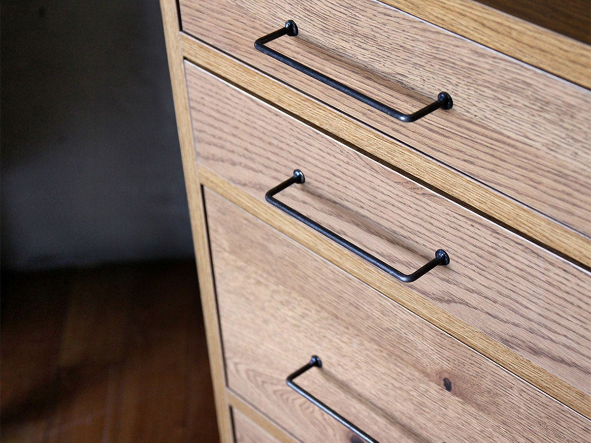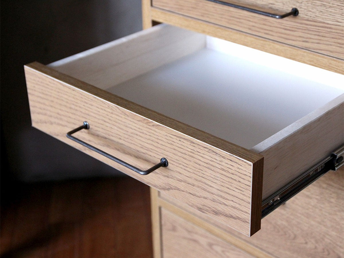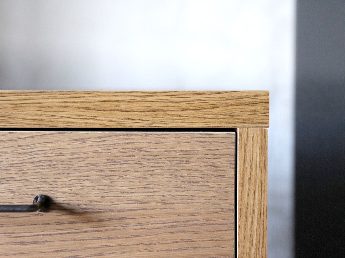 リビングや寝室、ワークスペースなど、どこにでも設置できるスリムなドロワー。コンパクトなサイズ感と細いスチール脚のデザインが圧迫感を感じさせず、スペースの限られたお部屋にもお使いいただけるデザインです。同シリーズの「カデル スライドガラス ローボード 1200」と天板高、奥行きを揃えているため、並べてお使いいただくと統一感のある収納スペースになります。無垢材の味わいを生かすため節を除くことなく丁寧に処理して残し、木の質感を楽しめるように仕上げられています。ナチュラルな雰囲気を保ちつつも取手や脚部のメンズライクなアイアンをアクセントとして合わせることで、インダストリアルな印象を演出。フレームには水気や湿気に強いポリ合板を選択し、引出し内部には脱湿効果のある桐材を取り入れるなど機能性にも優れています。清潔感が気になる食器や衣類などの収納におすすめです。引出しのレールには飛び出し防止機能が付いていますので、万が一の時にも安心です。
