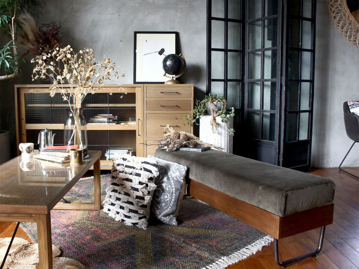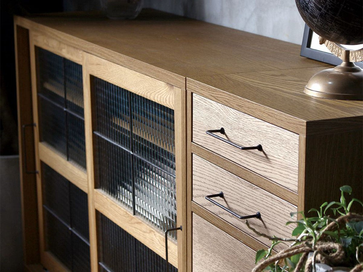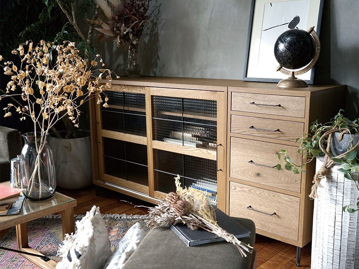 リビングや寝室、ワークスペースなど、どこにでも設置できるスリムなドロワー。コンパクトなサイズ感と細いスチール脚のデザインが圧迫感を感じさせず、スペースの限られたお部屋にもお使いいただけるデザインです。同シリーズの「カデル スライドガラス ローボード 1200」と天板高、奥行きを揃えているため、並べてお使いいただくと統一感のある収納スペースになります。無垢材の味わいを生かすため節を除くことなく丁寧に処理して残し、木の質感を楽しめるように仕上げられています。ナチュラルな雰囲気を保ちつつも取手や脚部のメンズライクなアイアンをアクセントとして合わせることで、インダストリアルな印象を演出。フレームには水気や湿気に強いポリ合板を選択し、引出し内部には脱湿効果のある桐材を取り入れるなど機能性にも優れています。清潔感が気になる食器や衣類などの収納におすすめです。引出しのレールには飛び出し防止機能が付いていますので、万が一の時にも安心です。