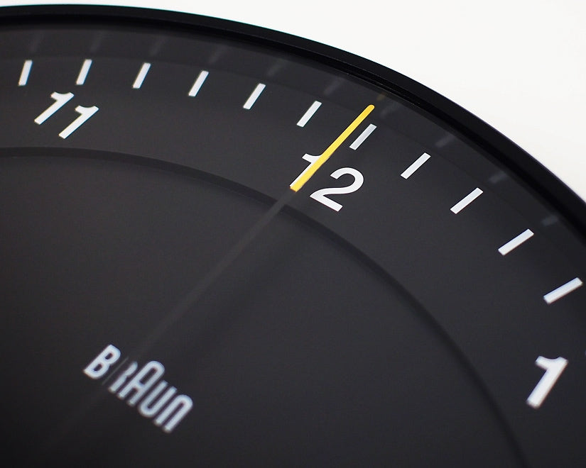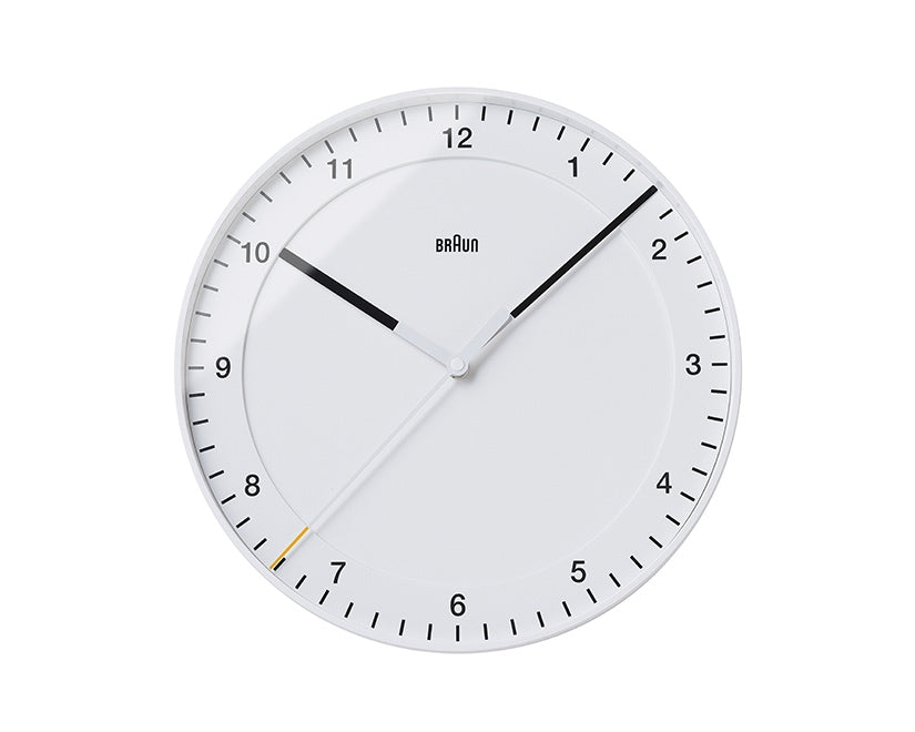 ディーター・ラムスの哲学「良いデザインは目立たない」を受け継ぐBRAUN(ブラウン)の新作クロック「BNC017」です。バウハウスの理念のもと、機能主義を一貫した革新的なデザインを数多く輩出し、家電デザインに革命をもたらし、世界を牽引したBRAUN社。そのBRAUNがクロックのデザインを手掛けてからこれまでの長い歴史の中で、最も大きい時計となるのが今回のBNC017です。読みやすい文字盤、視認性を高める針先の配色など、シンプルかつ機能美に優れたデザインは、現在のBRAUNデザインにもディーター・ラムスの哲学が受け継がれています。現在までリリースされている掛け時計には存在しなかった「秒針」には、置き時計同様のアイコニックな黄色が配され、さらに今回のBNC017には、待望の「風防」を備えています。視認性を確保するための文字盤の段差、ぎりぎりまで伸ばされた針の長さや針の配色等、まさにディーター・ラムスの哲学はそのままに、秒針の動作音がしない静音ムーブメントを採用するなど機能や実用性を兼ね備えた美しい掛け時計に仕上がっています。オールプラスチックのボディーは軽量で、壁に負担をかけず取り付けることができます。