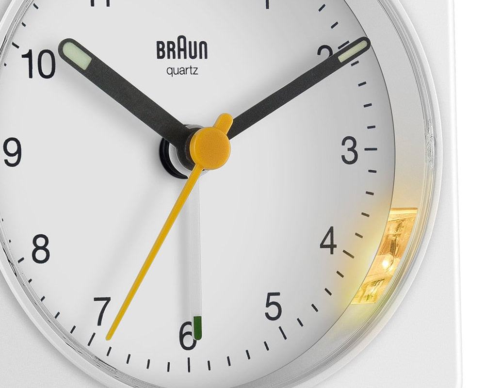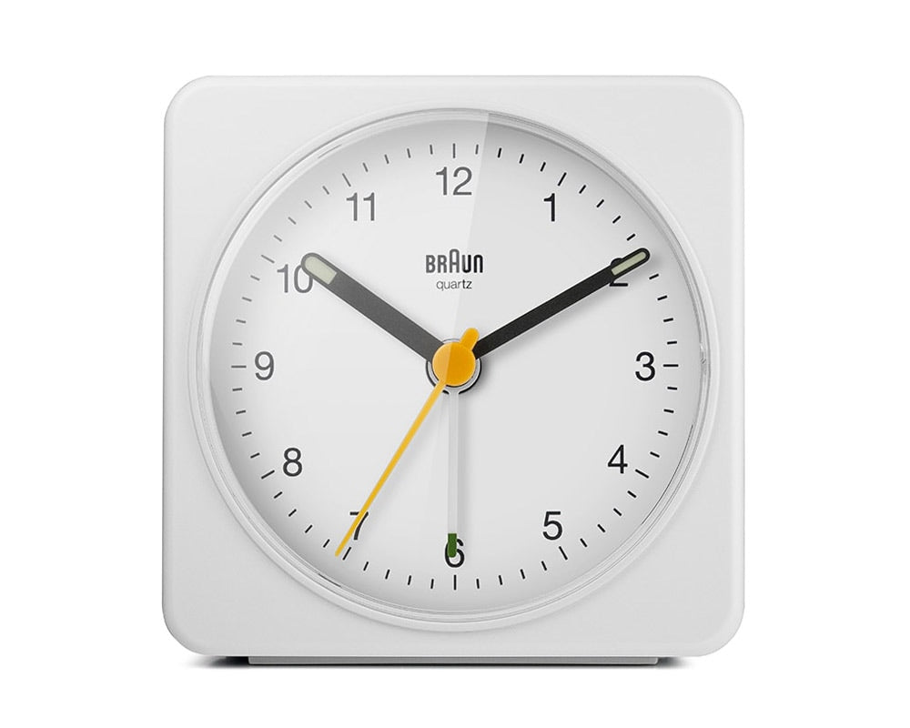 ドイツの家電メーカーBRAUN(ブラウン)のアラームクロックBC03です。人間工学に基づいたシンプルで機能的なデザインで、世界を牽引したブラウン社のアラームクロックです。1987年にデザインされ、ニューヨーク近代美術館MOMAの永久展示品に選定された名作「AB1」をベースに再現されたBC02をサイズアップし、ライト・スヌーズ機能を備えたアラームクロックです。サイズアップにより視認性を高め、実用的なライト、スヌーズなどの機能を追加することで、使い勝手が高まりました。クラシックかつミニマルな正方形。暗闇でも発光するルミナス針を採用しているので、夜間の利用も心配ありません。針に配されたグリーン・イエローは視認性を考慮した色使いでBRAUNの象徴的なカラーリング。機能性とシンプルさを追求した、こだわりの見えるプロダクトです。当時巨匠ディートリッヒ・ルブスがデザインを担当したまさに名作です。