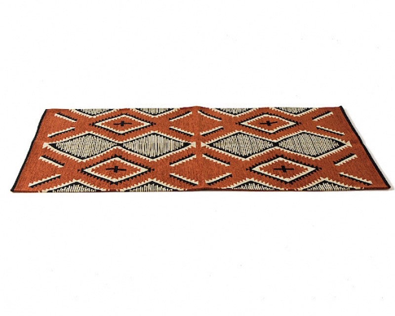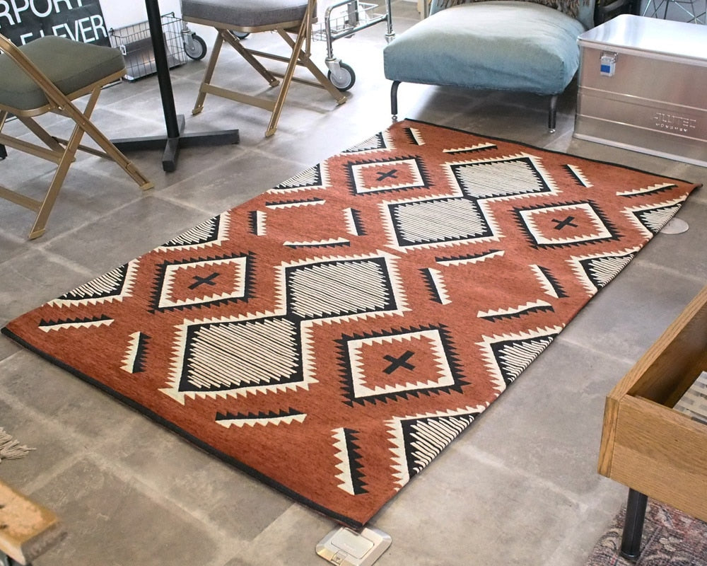 トレンドでもあるバティック柄等のネイティブパターンをモチーフにしたラグマットです。短い毛足のシェニール糸を使ったソフトな肌触りで、素足でも心地よく、オールシーズン使っていただけるラグです。カラフルな印象が強いネイティブ柄を、特徴的なモチーフやパターンはそのままに、バーガンディーを基調に落ち着いたトーンで仕上げています。サイズは2〜3シーターのソファ前に最適な大きさで、西海岸テイストやインダストリアル、北欧、ナチュラルなお部屋まであわせやすい、万能なデザインです。
