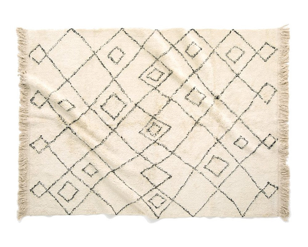 モロッコラグを思わせるコットン100%のフカフカとした肌触りが特徴の「ERIVAN RUG/エリバンラグ」です。コットン100%のフカフカとした肌触りが特徴の人気のコットンタフトシリーズのエリバンラグです。インドの職人が、基布にガシガシ綿糸を植え付け(tufting)することからタフトシリーズと呼んでおり、独特のフカフカの肌触りをお楽しみ頂けます。手描き感のある歪んだ線はその過程ならではで、モロッコ調のデザインを取り入れ、 馴染みやすい色味で幅広いインテリアによく合います。サイズは2〜3シーターのソファ前に最適な大きさで、肌触りの良いモロッコ調のラグを探している方にオススメです。