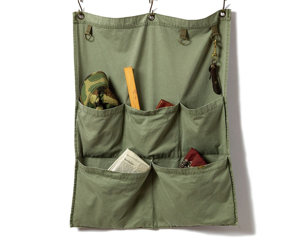壁面で小物を収納しながら絵になるBasShu(バッシュ)のウォールポケットです。玄関先やデスク前、キッチンなどの壁面にあると便利で、かつ、寂しい壁面を飾ってくれるウォールポケット。丈夫なミリタリーのダック生地にユーズド加工を施し、長年使い込んだような風合いに仕上げています。上部にはキーチェーンなどを引っ掛けて使えるDカンを3箇所、下にはたっぷりと収納できる大きめのポケットが5箇所あります。下部ポケットにはさりげなく施した真鍮製のタグもつき、インテリアとしても雰囲気の良いウォールポケットです。