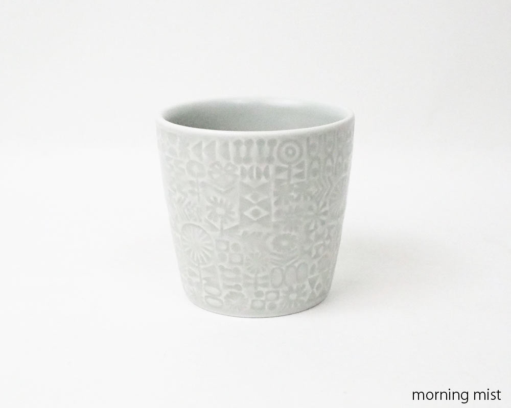 隙間なく埋められた模様と凹凸による釉薬の濃淡が、北欧のヴィンテージカップを思わせる、BIRDS' WORDS/バーズワーズのPATTERNED CUP/パターンドカップです。陶芸作家の伊藤利江さん自身が作ったハンコで、カップ全体に模様を施したフリーカップです。隙間なく埋められた模様の凹凸が手触りを良くし、手に馴染む大きさも相まってずっと持っていたくなる心地良さを生んでいます。ハンコの模様はどこか懐かしい花や鳥、幾何学模様で、センスよく、また隙間無く施されています。落ち着いた色合い釉薬の濃淡が美しく、使いやすいサイズ感は、朝一杯のコーヒーから、デザートの盛りつけ、ちょっとした花瓶まで、生活の様々なシーンでお使いいただけます。