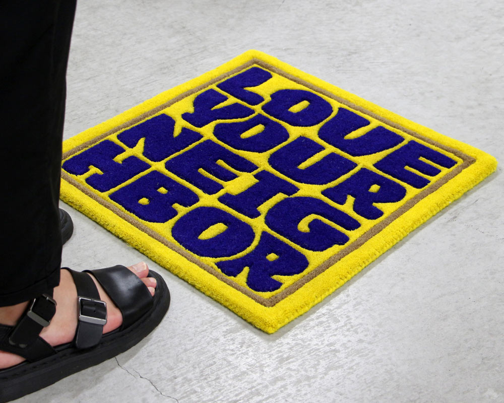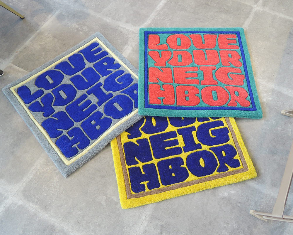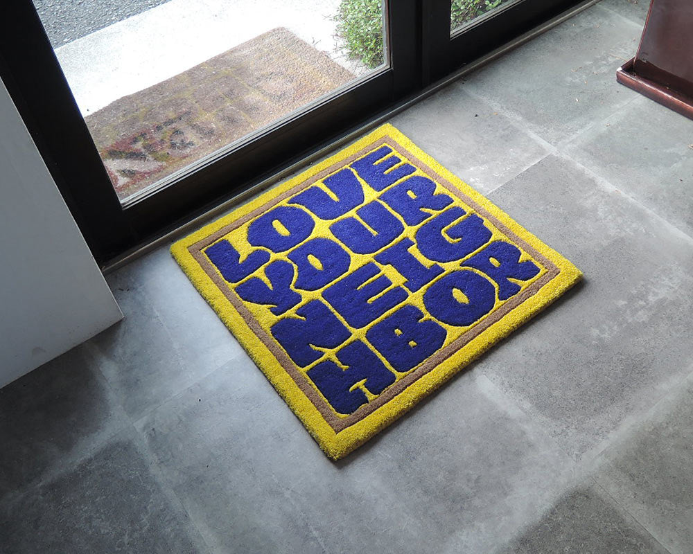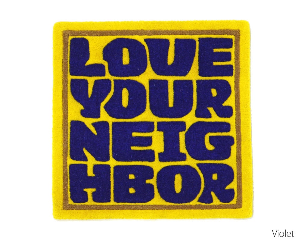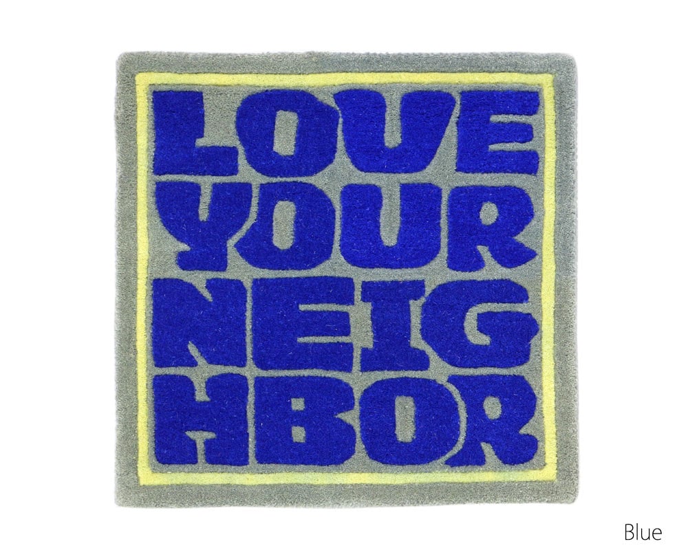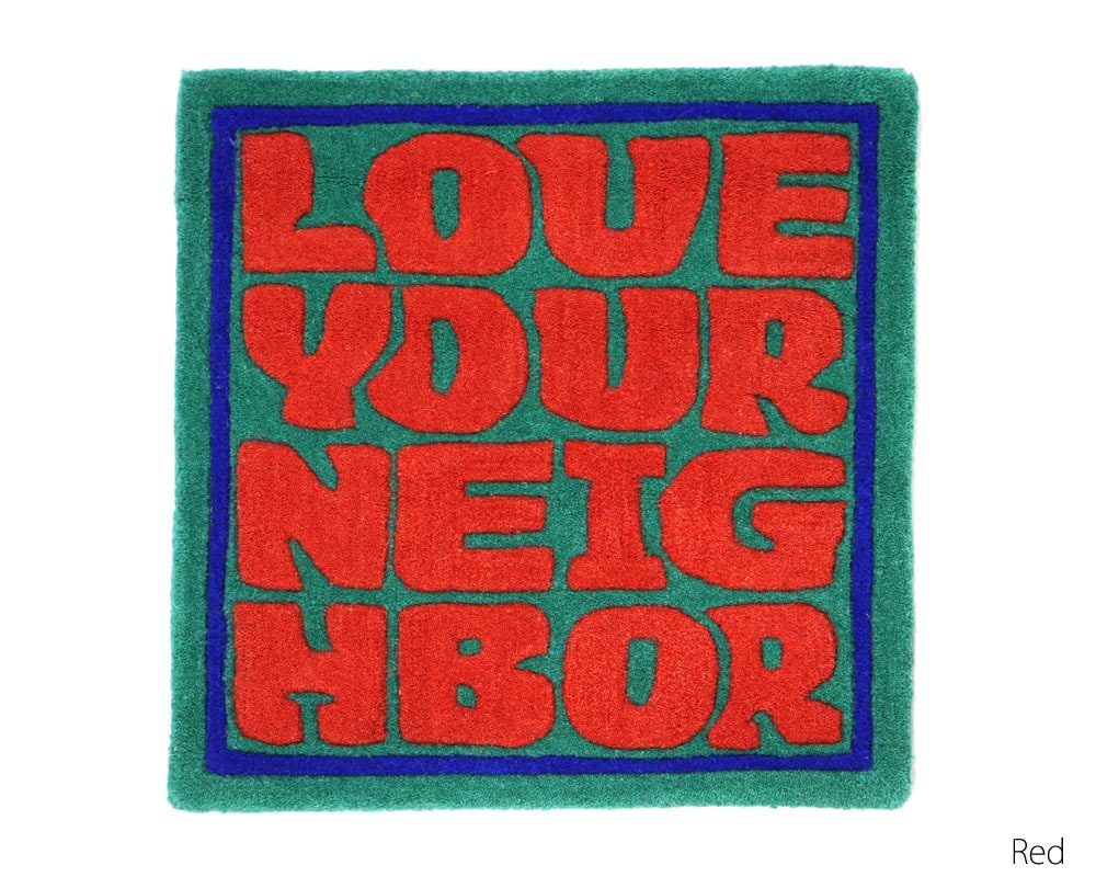 POPなデザインとカラーリングのアクセントラグ「LYN Rug /ラブユアネイバーラグ」です。 「LOVE YOUR NEIGHBOR(隣人を愛せよ)」のメッセージを POPなデザインで仕上げたラグマットです 。 玄関やリビングと色々な場所に対応できるよう表面をウール、裏面をコットン素材にて製作しています。