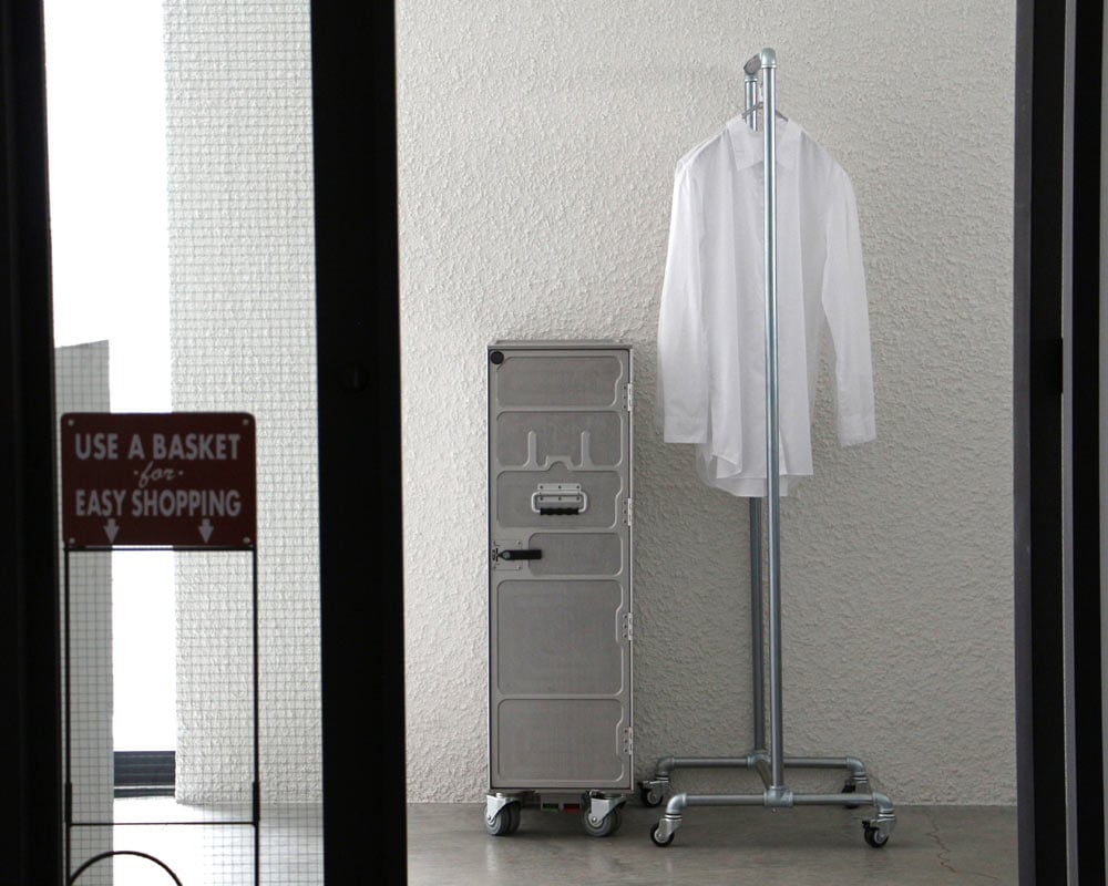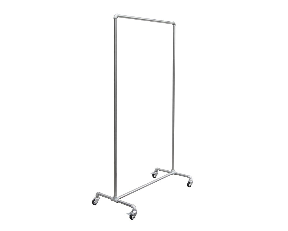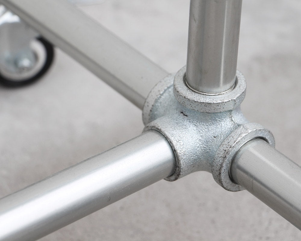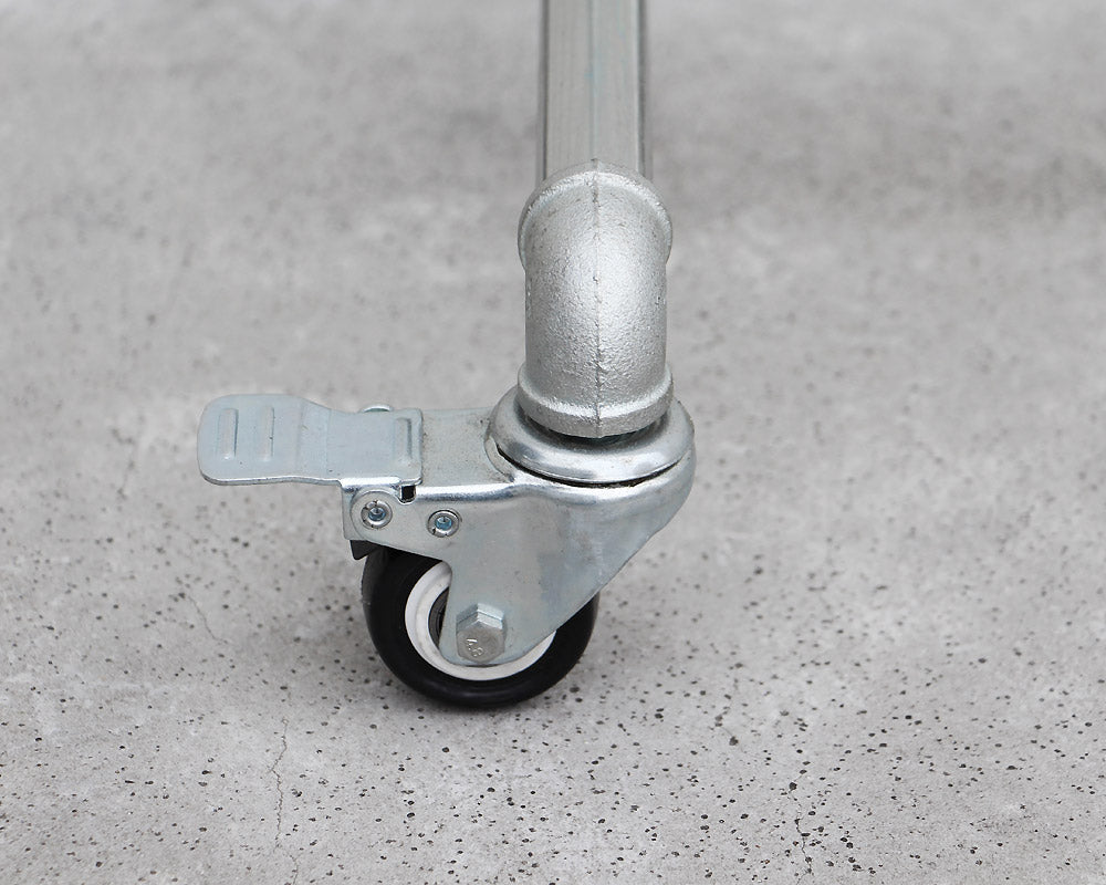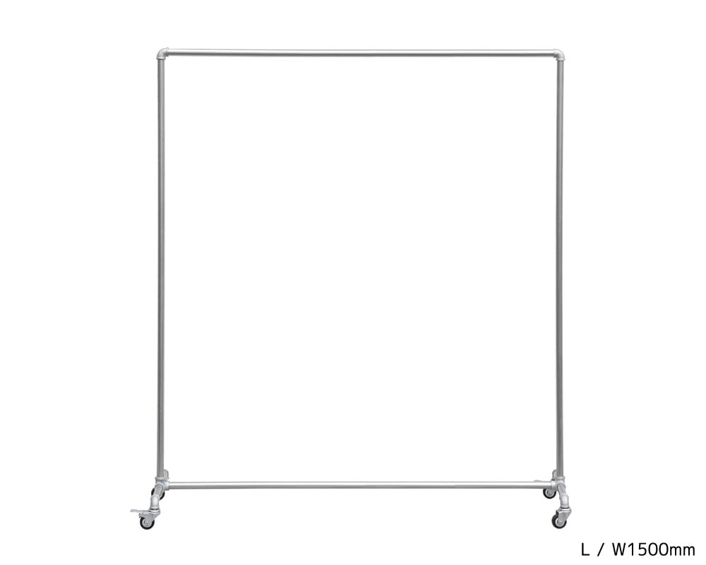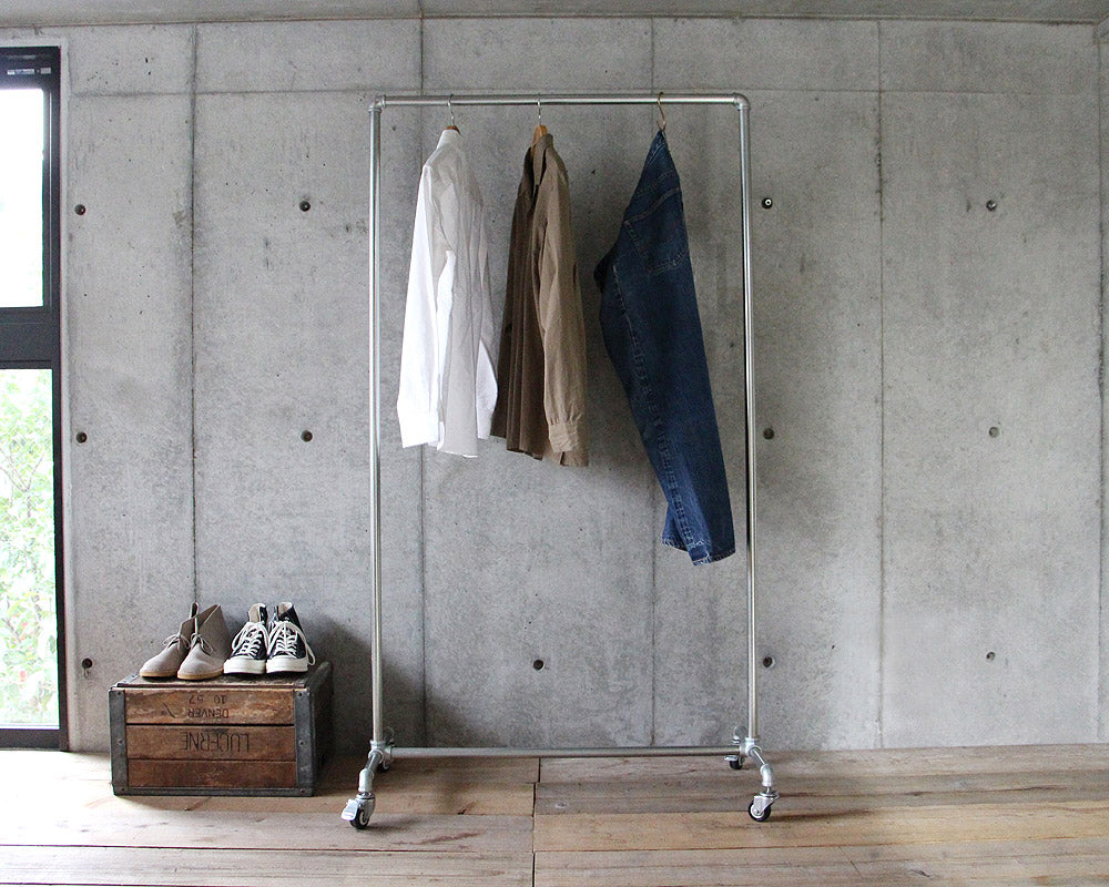 ガス管と継手を利用したシンプルなキャスター付きのハンガーラックです。亜鉛メッキの鉄パイプ使用した機能的なハンガーラックは、スチールながら無骨すぎず、そのシンプルな佇まいはあらゆる空間に良く合います。ストッパー付きのキャスターを備え、衣類を掛けたままの移動も楽々。ガス管を使用しているため、コストも抑えられていて、ご家庭での使用以外にも、ショップなどでの使用もおすすめです。