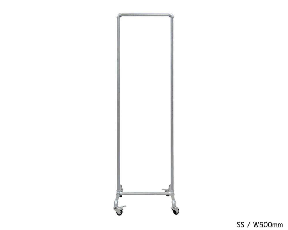 ガス管と継手を利用したシンプルなキャスター付きのハンガーラックです。亜鉛メッキの鉄パイプ使用した機能的なハンガーラックは、スチールながら無骨すぎず、そのシンプルな佇まいはあらゆる空間に良く合います。ストッパー付きのキャスターを備え、衣類を掛けたままの移動も楽々。ガス管を使用しているため、コストも抑えられていて、ご家庭での使用以外にも、ショップなどでの使用もおすすめです。