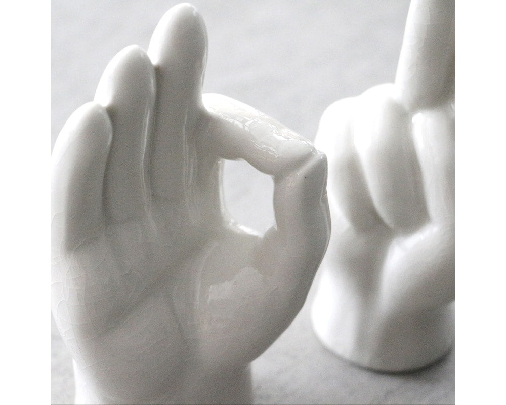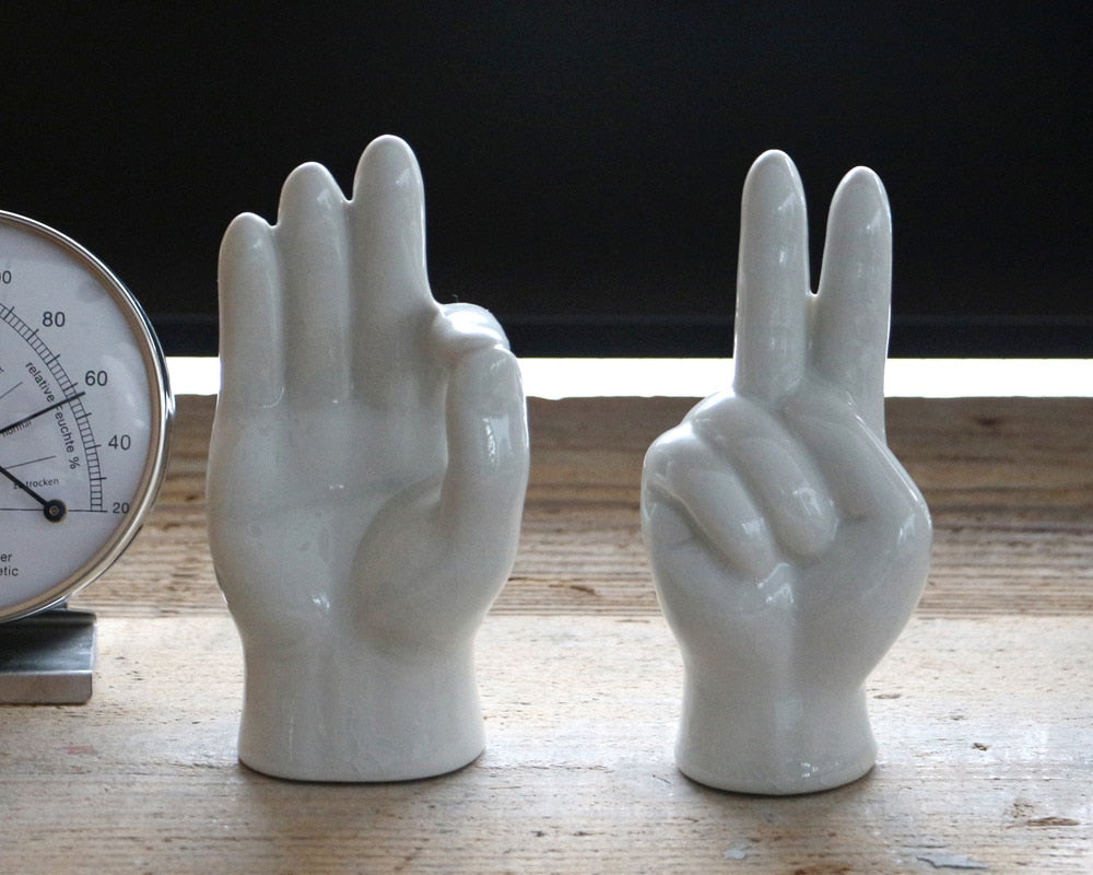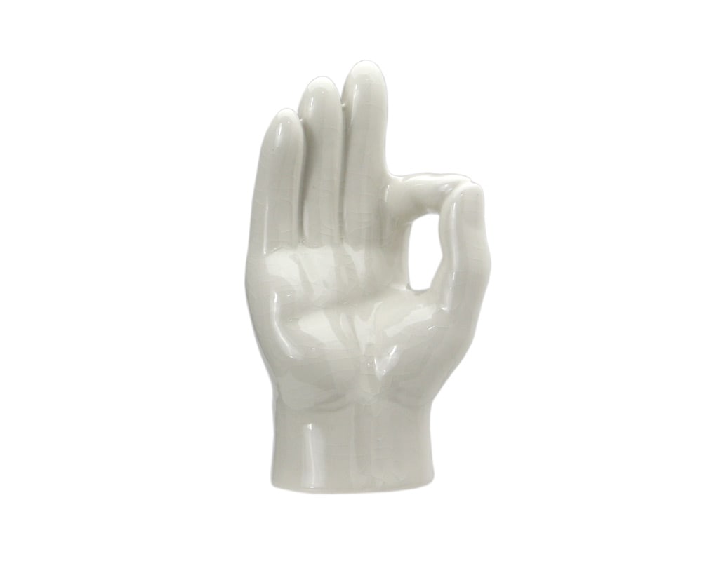 セラミックで作られた「ピース」と「OK」の手をモチーフにした「Porcelain Hand Object /ポーセリン ハンド オブジェ 」です。 70年代によく見かけた木製ハンドオブジェをモチーフとしたセラミック製オブジェです。 艶のある美しい質感と全体に入ったビンテージ感のある貫入が特徴的。 キャビネットやデスク上に置いておくだけで、インテリアとして感度があがります。