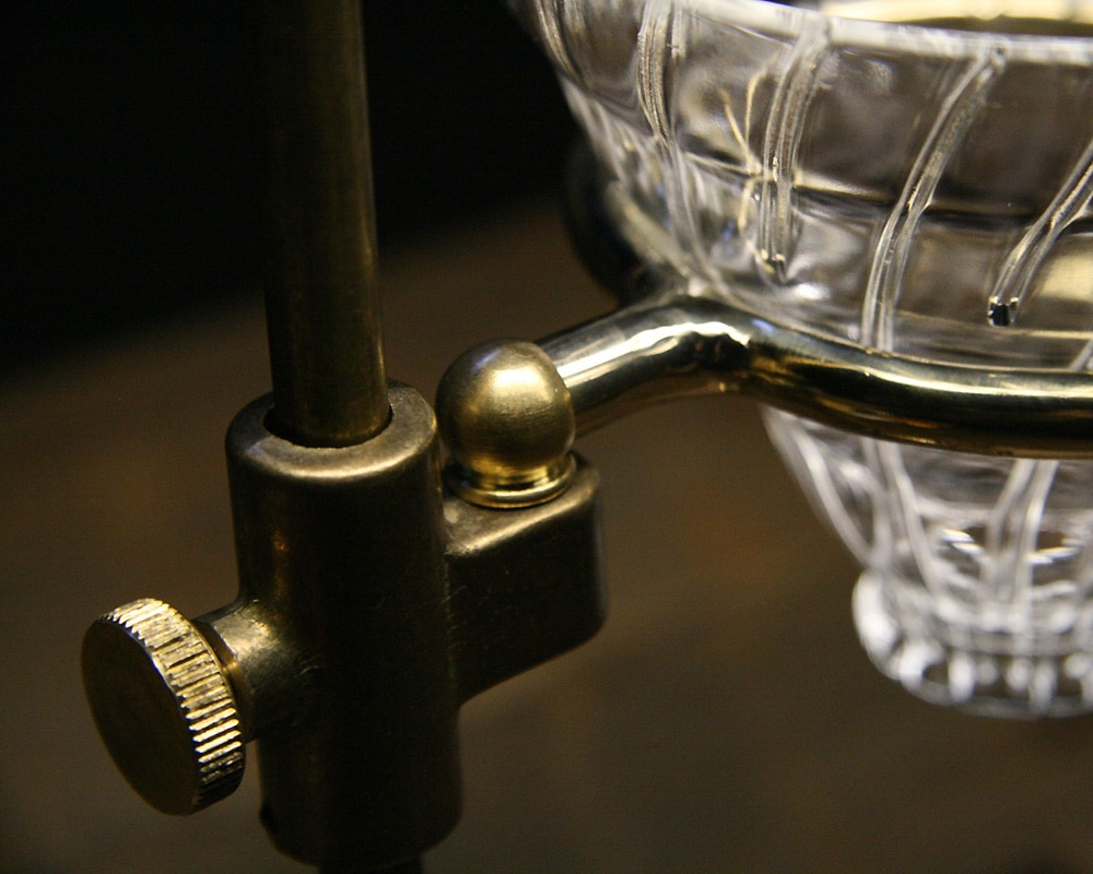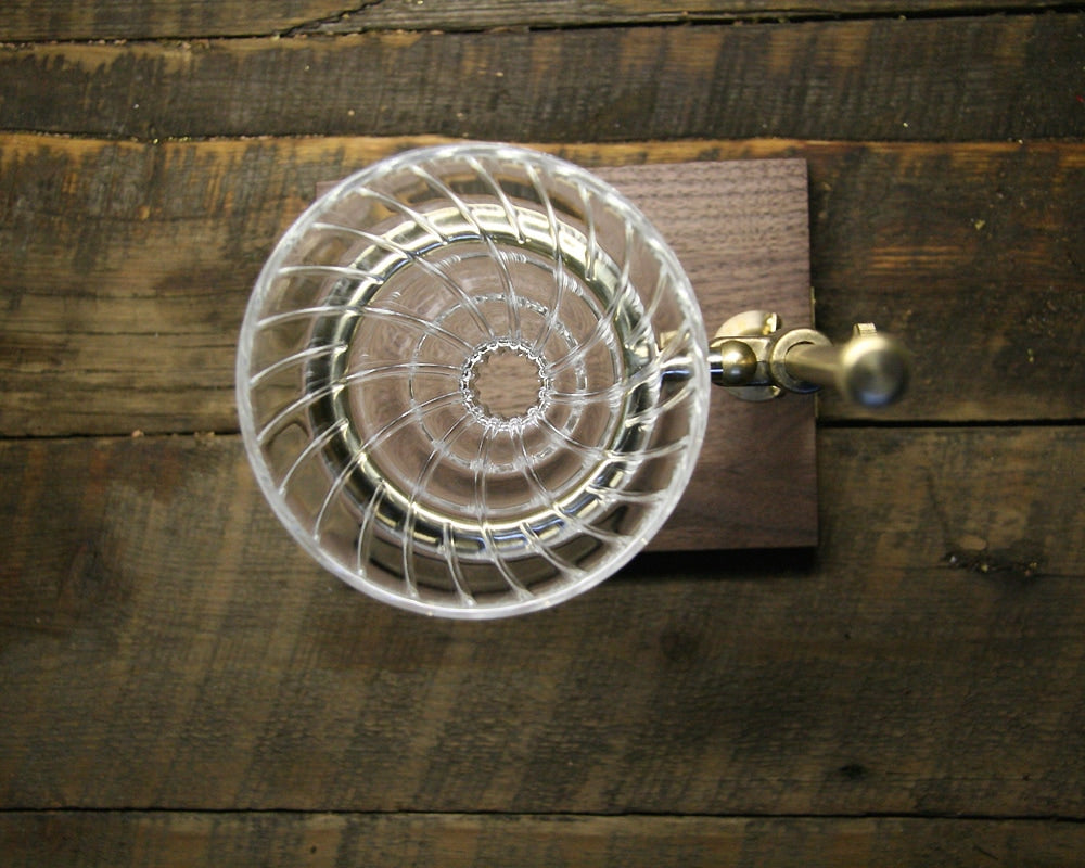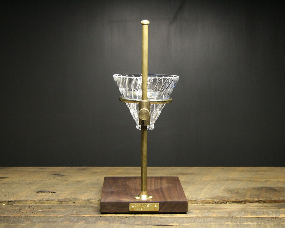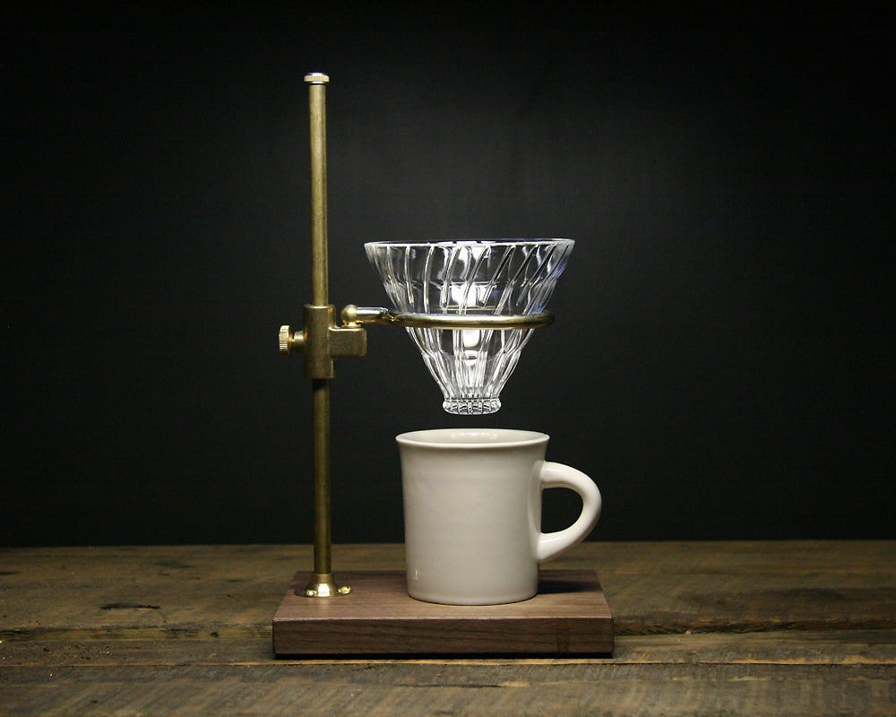 アメリカ・コロラド州フォートコリンズの「THE COFFEE REGISTRY」によるウォールナット材とブラス素材を組み合わせた実験器具のようなコーヒードリップスタンド(オーバースタンド)です。『コーヒー好きのためのドリップスタンド』まるで実験器具のようなこのポーオーバースタンド。ドリッパーをセットし、挽き立ての豆を入れ、泡立ちを確認しながらゆっくりお湯を注ぐ。コーヒーはドリップの仕方ひとつで味わいが変化します。まさに結果が楽しみな実験の様な作業です。日々の喧騒からから離れ、1杯のコーヒーを美味しく淹れたい方のために作られるドリップスタンドです。『オブジェにもなり得る佇まい』このドリップスタンドはアメリカの工房で1点1点手作業で作られています。台座にはウォールナットの無垢材を使用し、アームやリング、ビスにいたるまで全て真鍮製のものを使用しています。また、ビスはマイナスネジを使うこだわりです。年月を経ることでまるでアンティークのような風合いになるスタンドは、キッチン周りに飾っておいても絵になります。『マグからポットまで対応』ポーオーバースタンドは全てのタイプで高さの変更ができるようになっています。1杯だけ淹れたいときはマグやカップに直接ドリップ。数人分淹れたいときにはガラスポットへと、様々な入れ物に対応できます。また、ドリッパーリングの直径は約75mmで、世界中のコーヒーのプロも使用するHARIO(ハリオ)のV60のドリッパー(別売)がしっかりフィットします。他の日本製のドリッパーも直径が合う物はもちろん使用できます。簡素ながら洒落た梱包で、新築祝いやコーヒー好きの方へのギフトにも最適です。