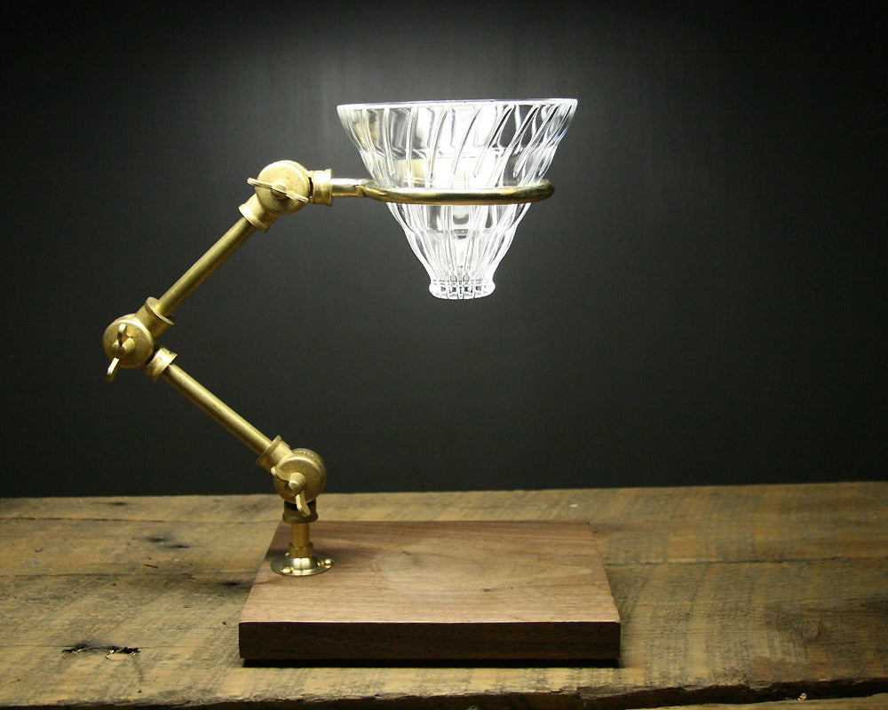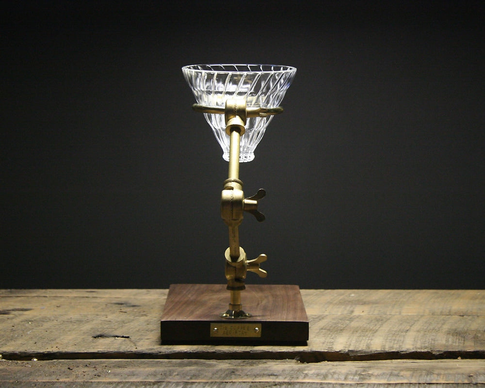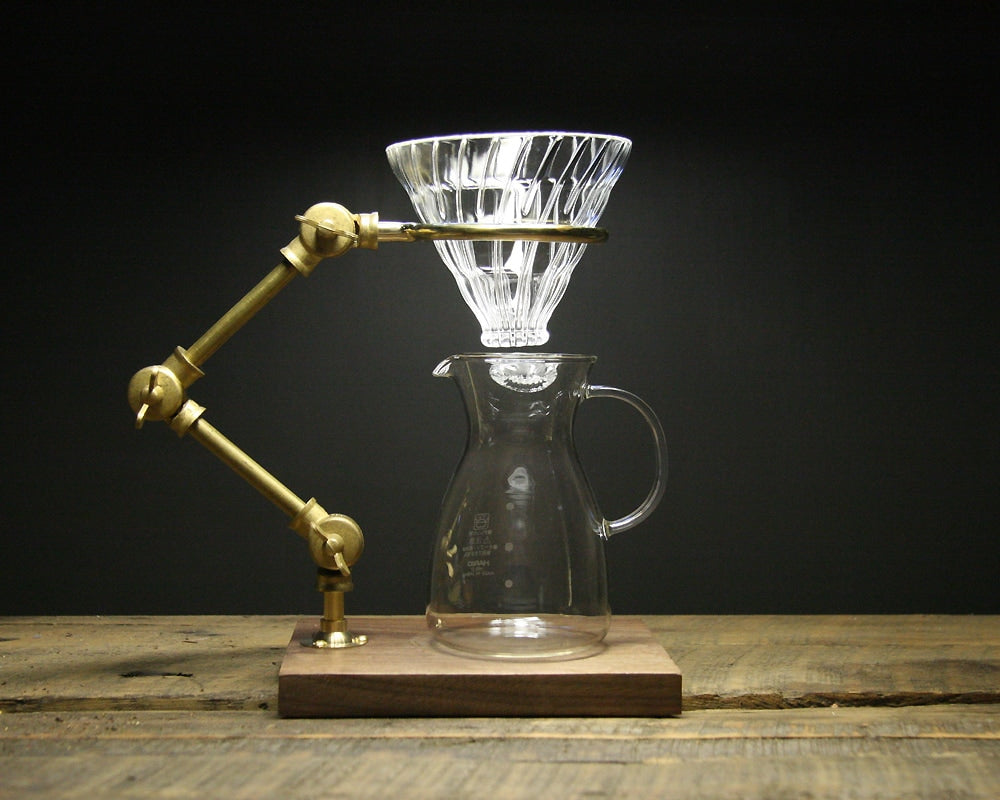 アメリカ・コロラド州フォートコリンズの「THE COFFEE REGISTRY」によるウォールナット材とブラス素材を組み合わせた実験器具のようなコーヒードリップスタンド(オーバースタンド)です。『コーヒー好きのためのドリップスタンド』まるで実験器具のようなこのポーオーバースタンド。ドリッパーをセットし、挽き立ての豆を入れ、泡立ちを確認しながらゆっくりお湯を注ぐ。コーヒーはドリップの仕方ひとつで味わいが変化します。まさに結果が楽しみな実験の様な作業です。日々の喧騒からから離れ、1杯のコーヒーを美味しく淹れたい方のために作られるドリップスタンドです。『オブジェにもなり得る佇まい』このドリップスタンドはアメリカの工房で1点1点手作業で作られています。台座にはウォールナットの無垢材を使用し、アームやリング、ビスにいたるまで全て真鍮製のものを使用しています。また、ビスはマイナスネジを使うこだわりです。年月を経ることでまるでアンティークのような風合いになるスタンドは、キッチン周りに飾っておいても絵になります。『マグからポットまで対応』ポーオーバースタンドは全てのタイプで高さの変更ができるようになっています。1杯だけ淹れたいときはマグやカップに直接ドリップ。数人分淹れたいときにはガラスポットへと、様々な入れ物に対応できます。また、ドリッパーリングの直径は約75mmで、世界中のコーヒーのプロも使用するHARIO(ハリオ)のV60のドリッパー(別売)がしっかりフィットします。他の日本製のドリッパーも直径が合う物はもちろん使用できます。簡素ながら洒落た梱包で、新築祝いやコーヒー好きの方へのギフトにも最適です。