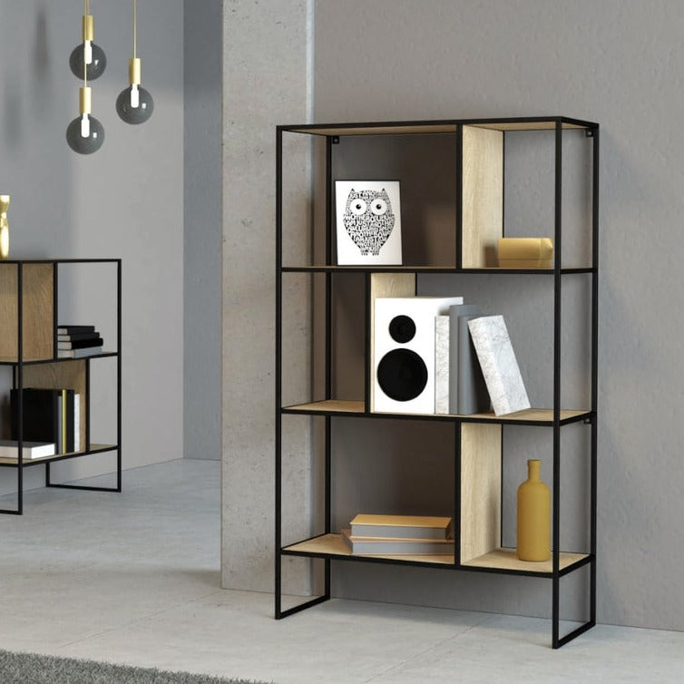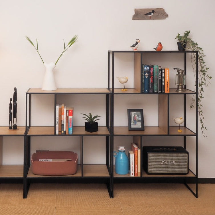 モダンとミニマルが融合した使いやすいシェルフです。棚板3段に縦の間仕切り、天板も使用可能です。オークの棚板と組み合わされた黒のスチールフレームですっきりした印象を与えます。組み合わせにより様々な生活スタイルに合わせた使い方が可能となります。