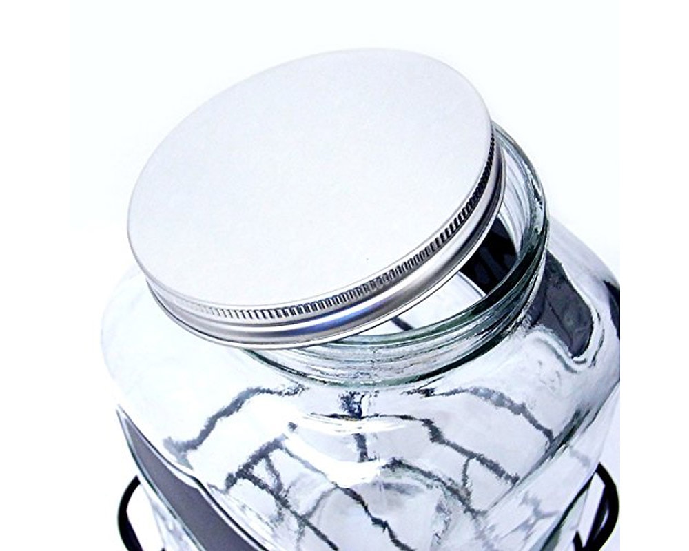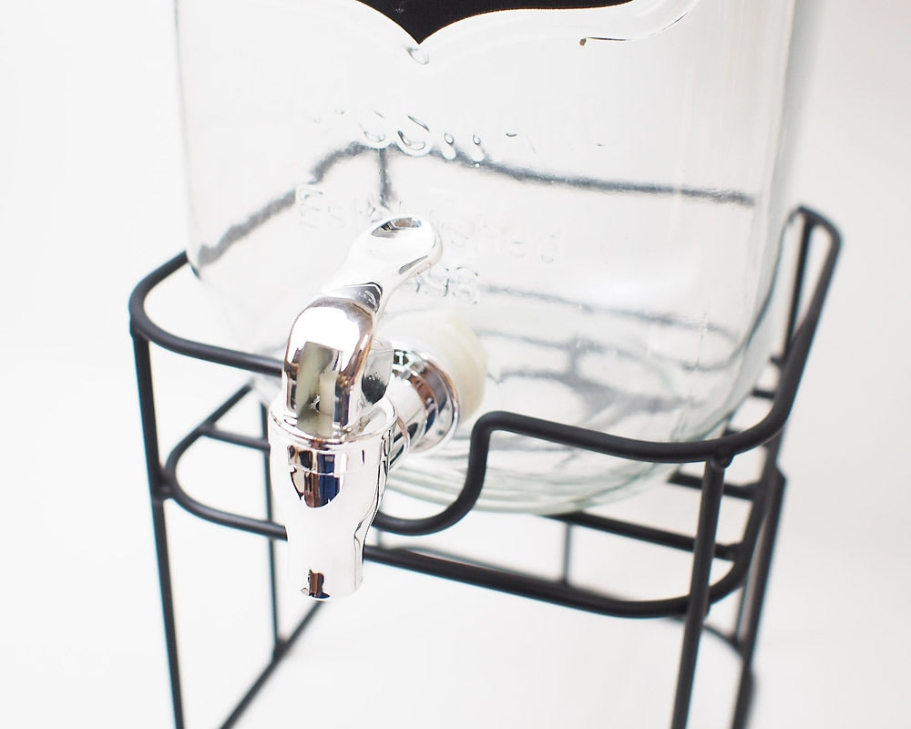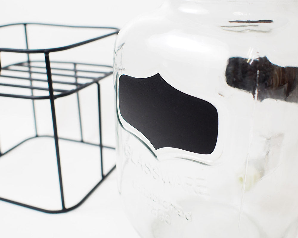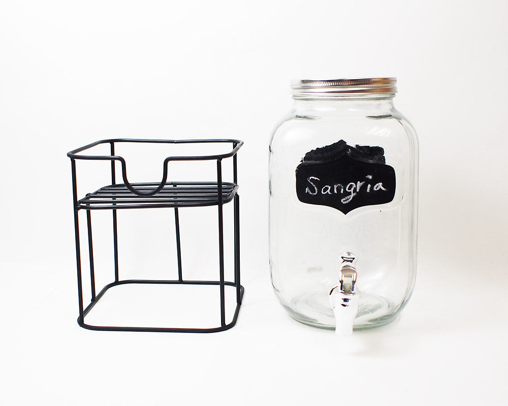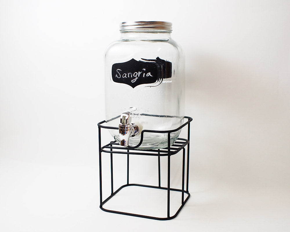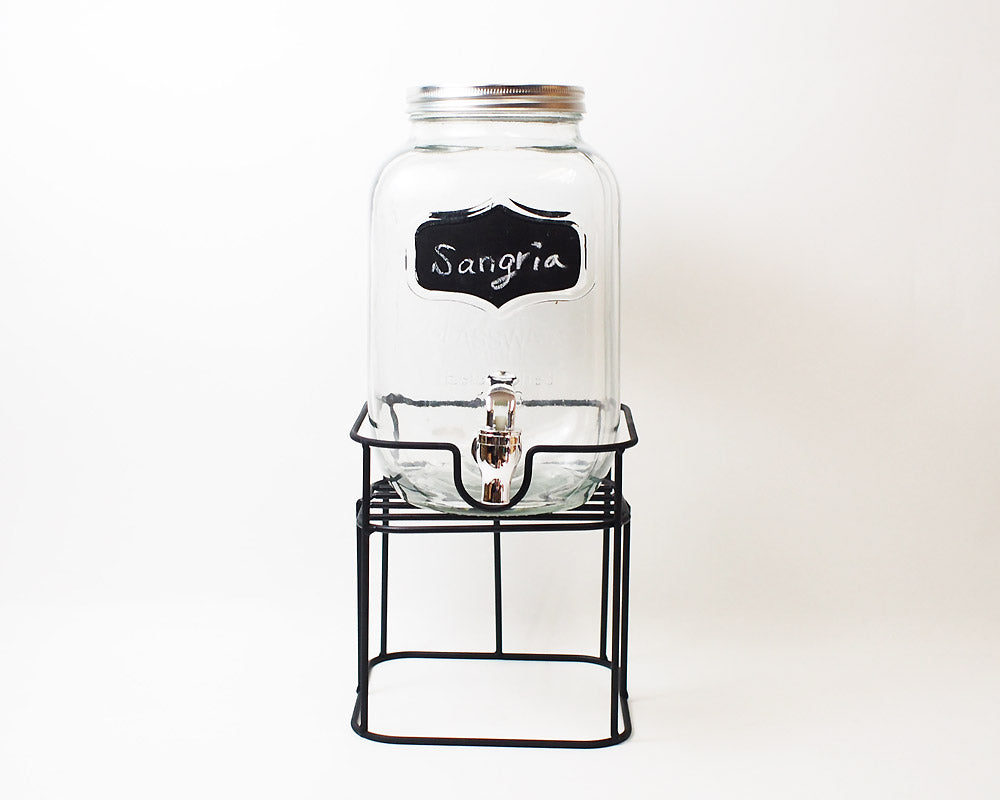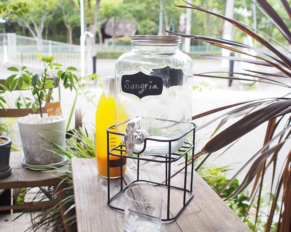 前面と背面にある黒板ペイントが特徴。レモネードやサングリアが似合いそうなガラスドリンクディスペンサー。 大ぶりなサイズのガラスジャーに、蛇口を付けたドリンクディスペンサーです。 上部開口が大きく、フルーツなどを入れやすくお手軽にレモネードなどのサーバーとしてお使いいただけます。 またこのアイテムは、前面と背面にある黒板ペイントが特徴で、チョークを使用し、前面に内容物を書き込んだり、背面には日付や時刻を記入したり・・・ 黒板ペイントを施しているので、何度でも書いたり消したり出来ます。(濡れ布巾等で簡単に消す事が可能です)。 容量は約2.8リットルで、アルミふたを採用しておりますので、手を中に入れて洗浄も簡単。蛇口部分は、プラスティックのボルトを外して漂白も出来ます。 スタンド付きで嵩上げなしにドリンクをグラスに注げます。また、収納時にはスタンドを逆さまにしてディスペンサーを入れることで多少コンパクトに収納いただけます。