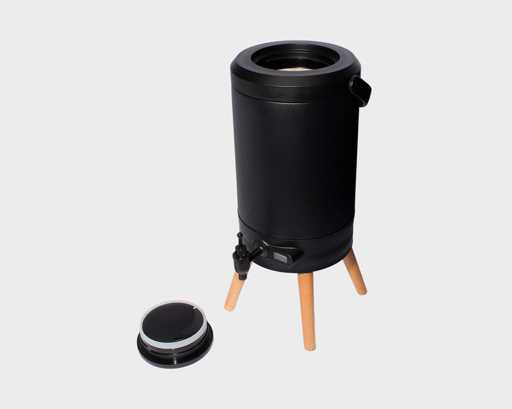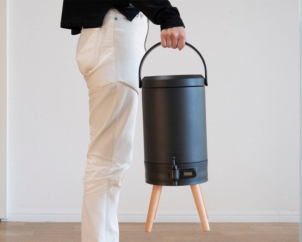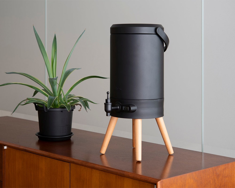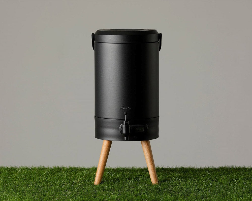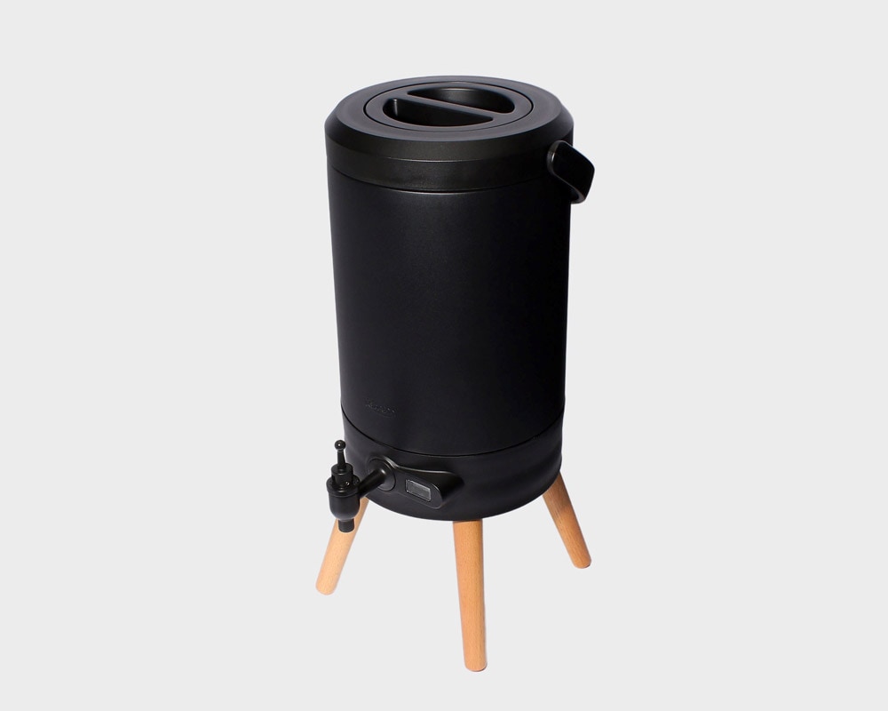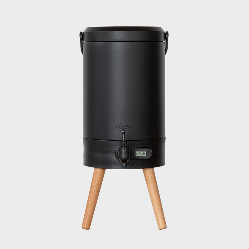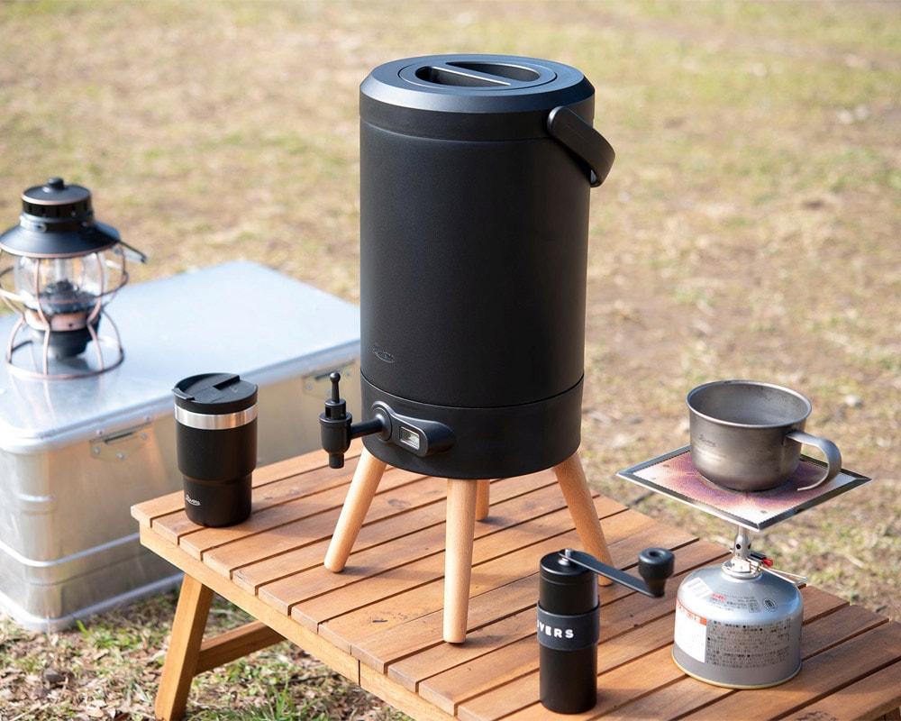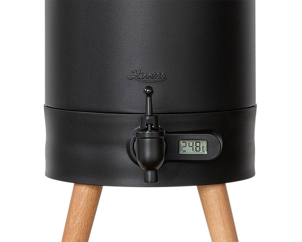 RIVERS(リバーズ)の、大容量5リットル、アウトドアからリビングまで、場所を選ばないインテリアライクなサーモジャグ「THERMO JUG CASK/サーモジャグ キャスク」です。天然木(ビーチ材)を使った脚がアクセントのシンプルなスタイルが特徴の大型サーモジャグです。大容量5Lの真空二重構造で長時間の保温保冷が可能。これだけあれば、真夏のスポーツイベントから、キャンプで調理に使えるレベル。もちろん保温性も高いので、手軽にコーヒーを淹れたり、スープをつくったりするのにも便利です。アイスバケツやクーラーボックスとしても活躍します。氷も溶けにくいので、アイスクーラーとしても機能します。ホームパーティーで、氷を詰めてシャンパンクーラー的に演出するのもユニークです。また、この製品には専用の大型ティーストレーナーが付属。一気にたくさんの水出し茶を淹れたりもできます。さらに本体には温度計がついていて、中のドリンク温度がわかるのも気が利いています。丈夫なダ真空二重構造はご自宅での使用はもちろん、カフェやレストランなど業務用として、また、キャンプやバーベキューなど、アウトドアシーンでも活躍します。