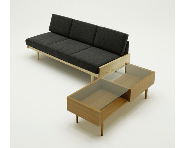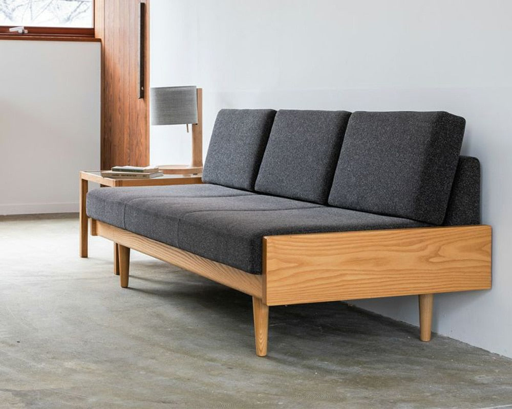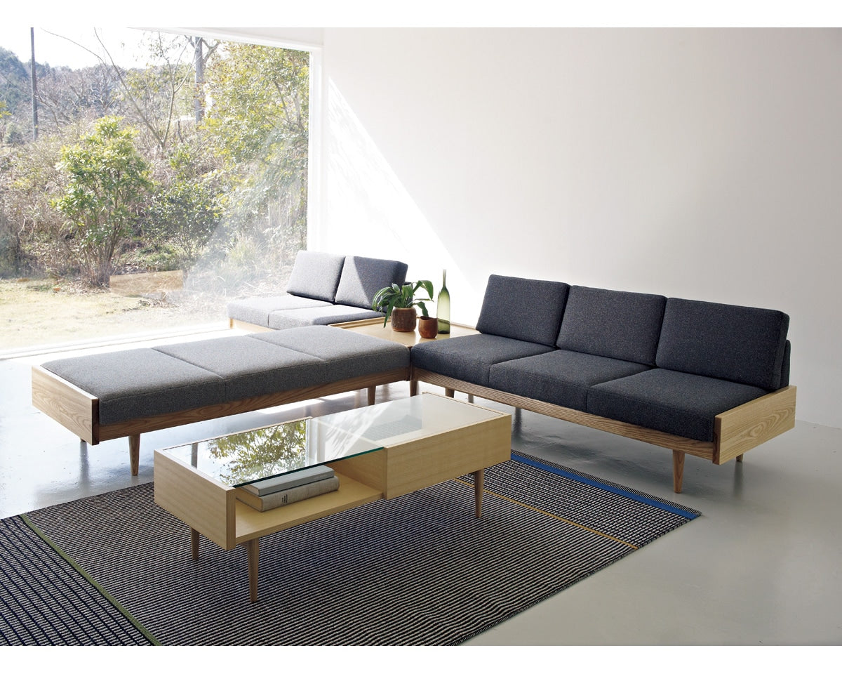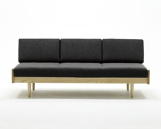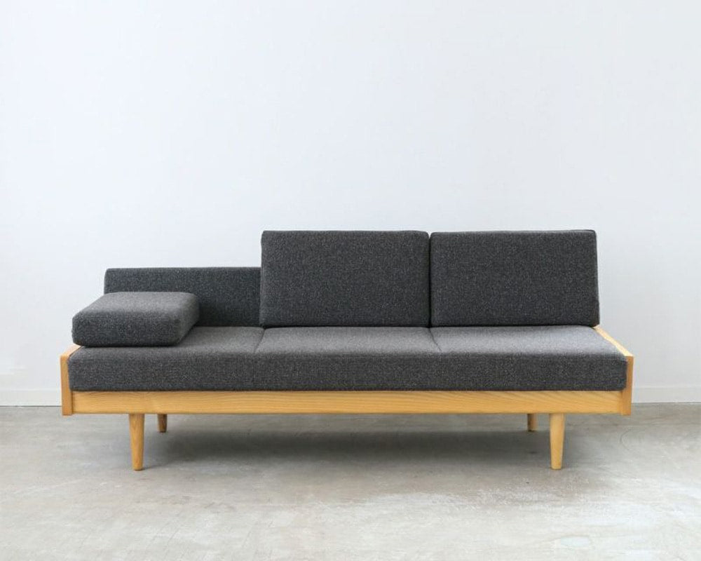 graf(グラフ)がデザインを手がけた、大人のためのadシリーズのデイベッドソファ「ad Day Bed sofa」 ソファで横になるというコンセプトのデイベッドで、こだわりのリビングに置けるデザインは実際皆無といっても過言ではありません。 その「デイベッドソファ」をgrafがデザインすると、他には類を見ないようなモダンで、洗練されたものになります。 39cmという低めの座面はゆったりと座りやすく、全体の高さも約70cmと低く抑えられいて限られたお部屋の空間を圧迫せず広く見せてくれます。 デイベッドとしても使える深い座面は適度な固さで座り心地がよく、背もたれを取り外して、それを枕代わりにそのまま横になるのにも最適です。また、来客時などの簡易ベッドとしても重宝します。 フレームにはホワイトアッシュの無垢材を使用していて、シンプルモダンなデザインの中に、ナチュラルなイメージをバランスよく配していて、完成度の非常に高いソファです。