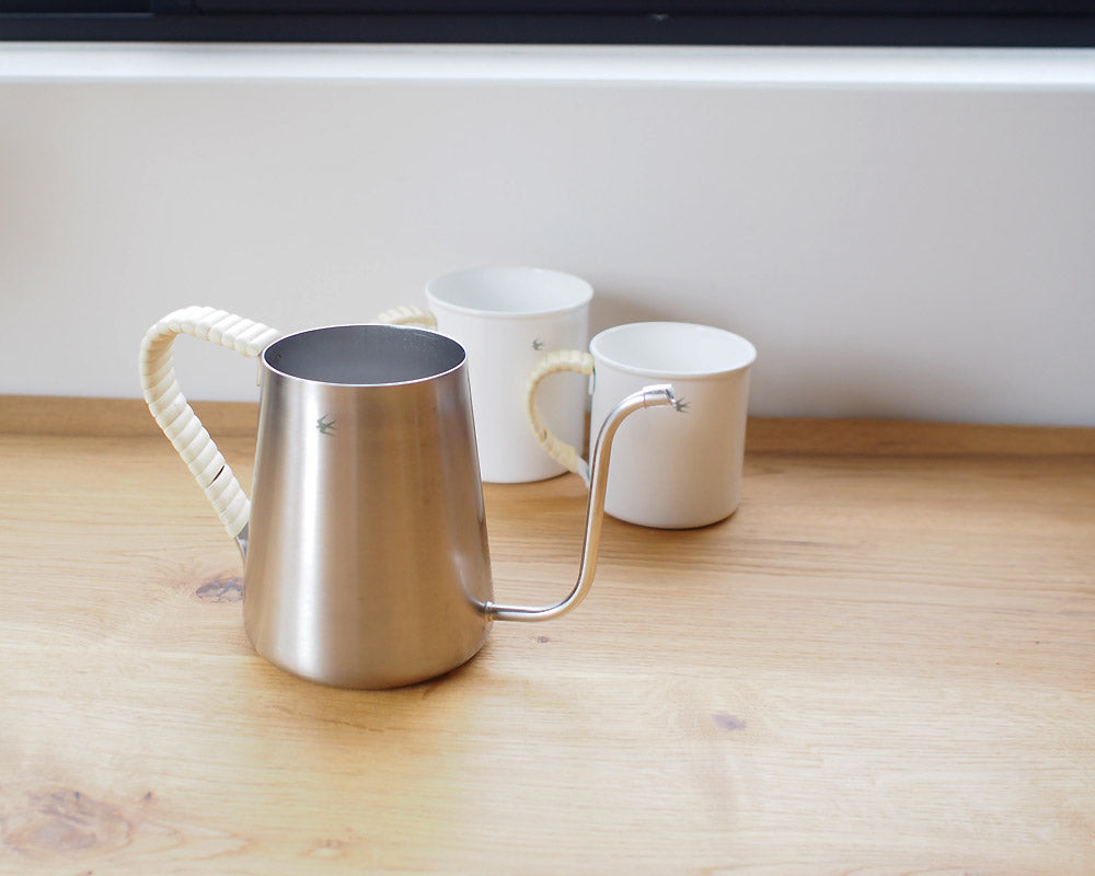 新潟県燕市で製作している GLOCAL STANDARD PRODUCTS /グローカルスタンダードプロダクツ「ツバメ」シリーズのステンレス製ドリップ専用ポットです。 ボディサイズを小型化、軽量化にすることでドリップする際にハンドリングしやすくなっています。適正満水容量は500ml(本体満水600ml)で、1〜2杯用のコーヒーを淹れるのにお勧めのサイズ感です。 注ぎ口は極細口で、口先は水切れが良いようにカットしています。 またハンドル部分には籐を巻くことで滑りにくくなっており、使い込むほどに色が濃く変化していくことから愛着を持ってご使用頂けます。 ※ 長時間の水浸け不可(籐部分が変形する可能性があります。) ※ 直火、IH不可( 湯を沸かす目的のポットではありませんのでご注意ください。お湯は別のケトルで沸かしていただき、本ポットに移していただく必要があります。)あくまでドリップ専用ポットとご理解下さい。