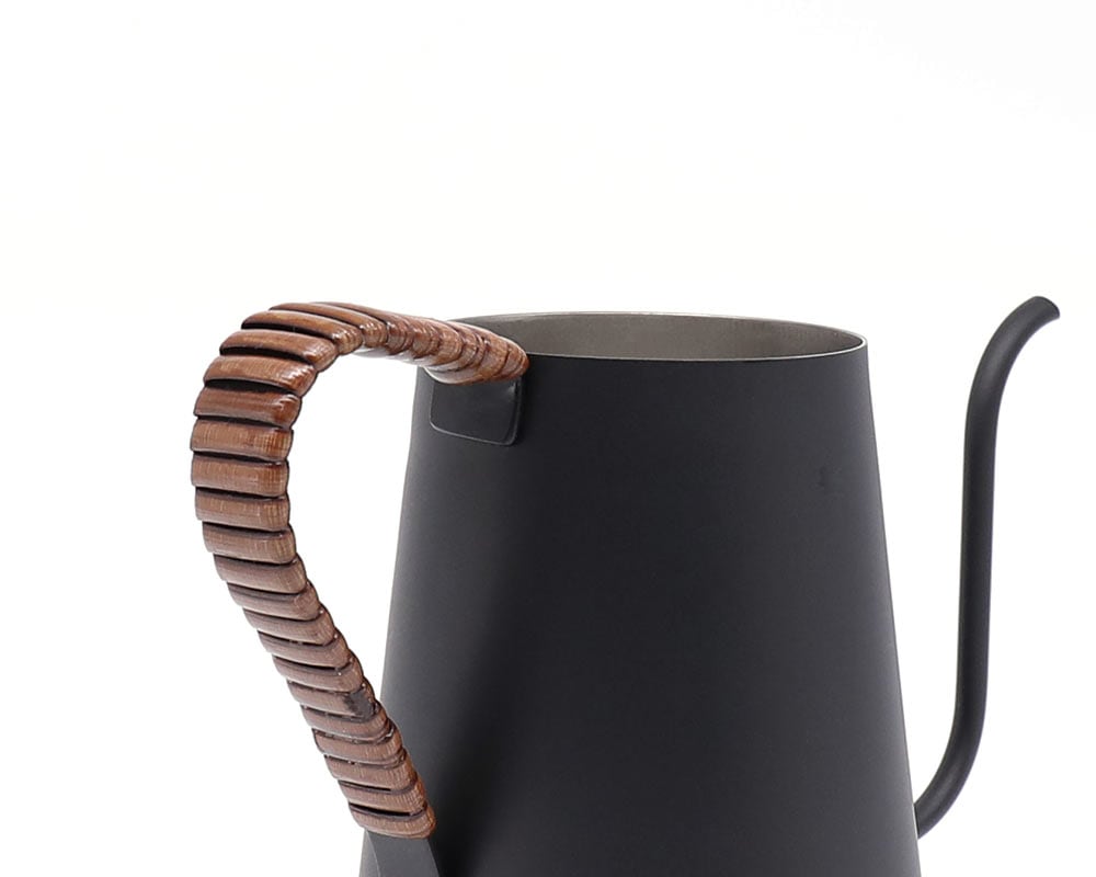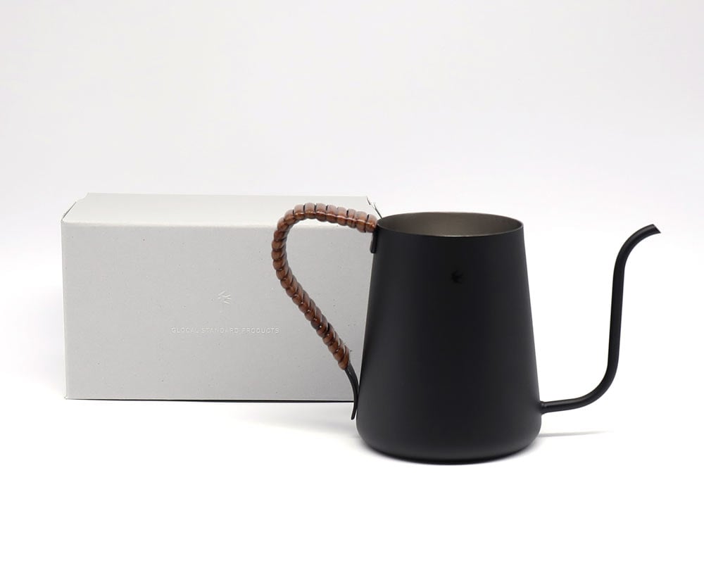 新潟県燕市で製作している GLOCAL STANDARD PRODUCTS /グローカルスタンダードプロダクツ「ツバメ」シリーズのステンレス製ドリップ専用ポット、マットブラックモデルです。 ボディサイズを小型化、軽量化にすることでドリップする際にハンドリングしやすくなっています。適正満水容量は500ml(本体満水600ml)で、1〜2杯用のコーヒーを淹れるのにお勧めのサイズ感です。 注ぎ口は極細口で、口先は水切れが良いようにカットしています。 またハンドル部分には籐を巻くことで滑りにくくなっており、使い込むほどに色が濃く変化していくことから愛着を持ってご使用頂けます。 マットブラックモデルには染色ブラウン色のラタンを選択、艶消し黒のボディとの相性も良いです。 ※ 長時間の水浸け不可(籐部分が変形する可能性があります。) ※ 直火、IH不可( 湯を沸かす目的のポットではありませんのでご注意ください。お湯は別のケトルで沸かしていただき、本ポットに移していただく必要があります。)あくまでドリップ専用ポットとご理解下さい。
