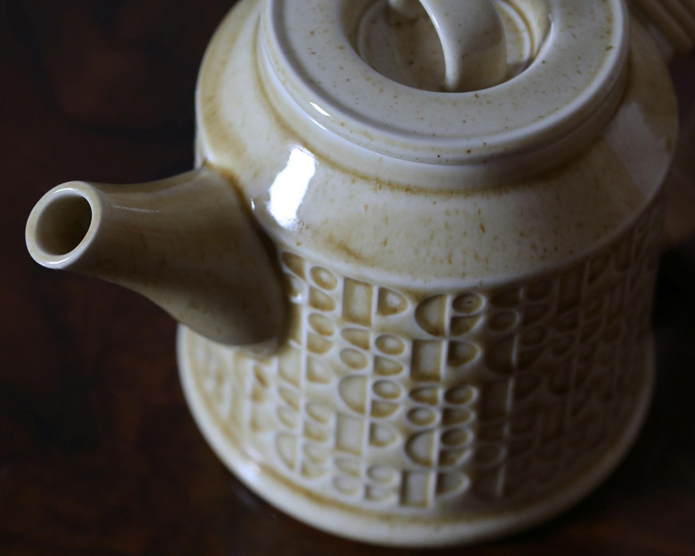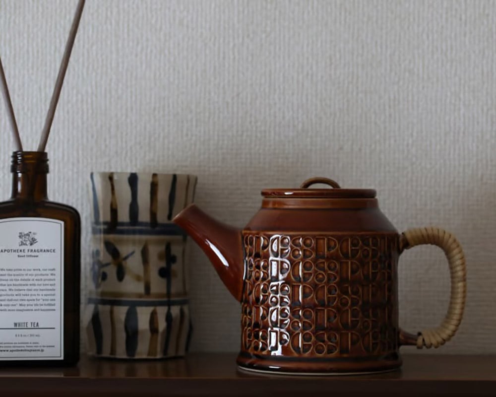 岐阜県多治見市と東京に拠点を置く窯元にて製作された GLOCAL STANDARD PRODUCTS /グローカルスタンダードプロダクツ「Kiln/キルン」シリーズの磁器製のポットです。 「Kiln/キルン」は英語で窯という意味。胴の部分にはオリジナルデザインのレリーフが施されています。 特殊な割れ型を用いることで極力繋ぎ目を無くし本来のデザインを損なわない手間がなされています。また複雑な形状は窯のなかで歪みや変形が起きる可能性がありとても調整が難しい中で製作されました。 あえて窯変の起こる釉薬を用いて、 ひとつひとつ釉相に個体差が生まれるようにされていて、 ひとつとして同じ表情がないことで愛着をもってお使い頂けます。 取手部分は天然のラタン(籐)を巻き、天然素材のため経年や使い込むことで味わい深く色濃く変化します。 付属の茶漉しをセットして紅茶やお茶を淹れていただくことができ、注ぎ口の液垂れ防止としてスキッターが付属していますので、お好みで装着していただけます。 ※ 長時間の水浸け不可(籐部分が変形する可能性があります。) ※ 直火、IH不可( 湯を沸かす目的のポットではありませんのでご注意ください。)