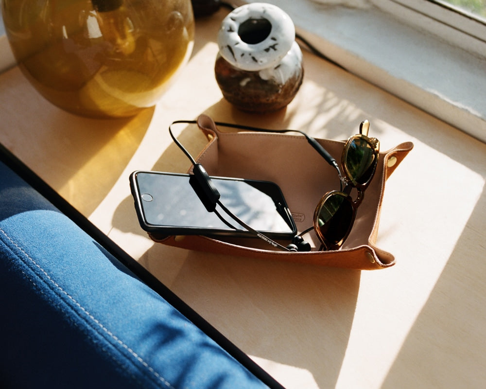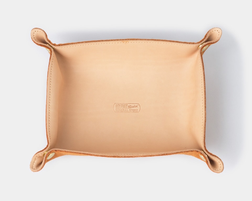 STUSSY Livin’GENERAL STORE レザーとフェルトを使用し持ち運びにも便利な携帯用トレイ「トラベルトレイ」です。 トラベル時に貴重品やポケットの中身を入れておくのに便利な携帯用レザートレイです。 上質な1枚革とフェルトを貼り合わせているので中身もトレイを置く家具も保護し傷つけません。 4角にスナップボタンを付けることで、そのスナップを留めるとトレイに、外すと1枚のレザーに戻ります。 携帯する時は全くかさばらず手軽に持ち歩けます。 滑らかでシボ感のある肉厚なレザー(牛革)はそのままに経年変化も楽しめるアイテムで、ギフトボックスに入ってのお届けになります。