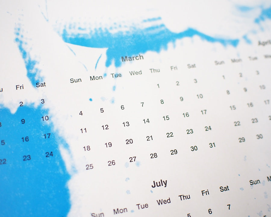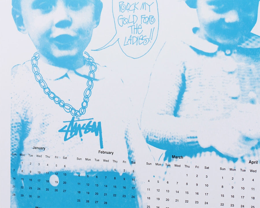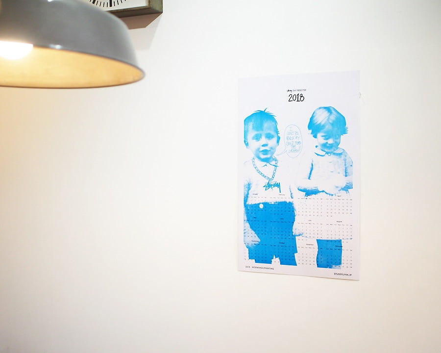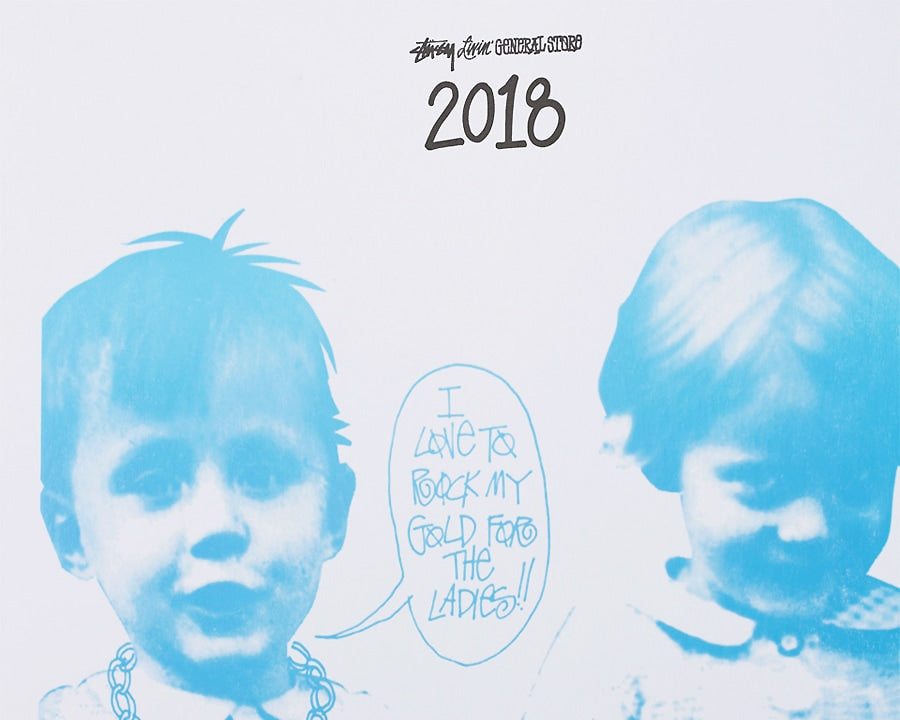 STUSSY Livin’GENERAL STORE の 活版印刷で刷られた2018年のレタープレスカレンダー(活版印刷ポスター)です。 サンフランシスコ北上の街オークランドにある1906年創業の印刷工房「Horwinski Printing Co.」にて活版印刷で印刷された肉厚ポスターカレンダーです。 今期はSTUSSYのデザインの中でもファンの多い「ROCK MY GOLD...」のグラフィックと共に2018年のカレンダーが印刷されています。 厚紙にコートされたポスター専用紙のため、フレーム等に入れず、ラフにそのまま壁に貼ったり、壁に立てかけたりしてディスプレイするのがおすすめです。
