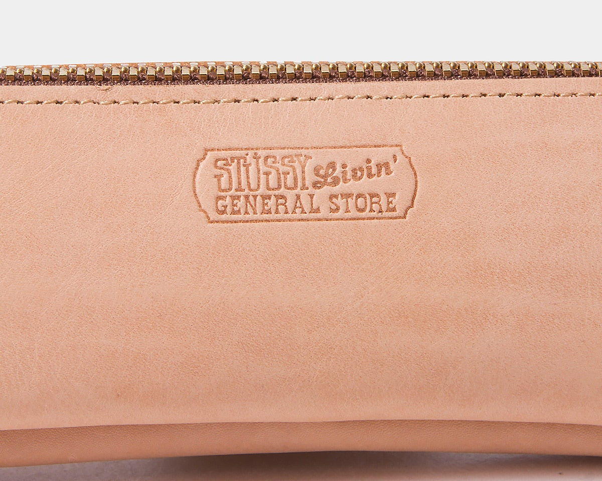 STUSSY Livin’GENERAL STORE の肉厚なレザー製にアップデートされたペンケースです。 長年好評のレザーシリーズがリニューアル。 しっかりとしたなめらかでシボ感のある肉厚なレザーは使い込む程に素晴らしい経年変化を見せます。 ジップには真鍮製のパーツを使用していて、上質なレザーと共にこだわりを感じます。 素材の良さを活かす為、エンボスのみのシンプルなデザインとなります。