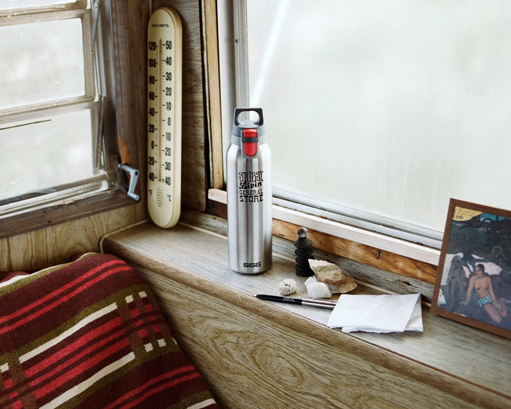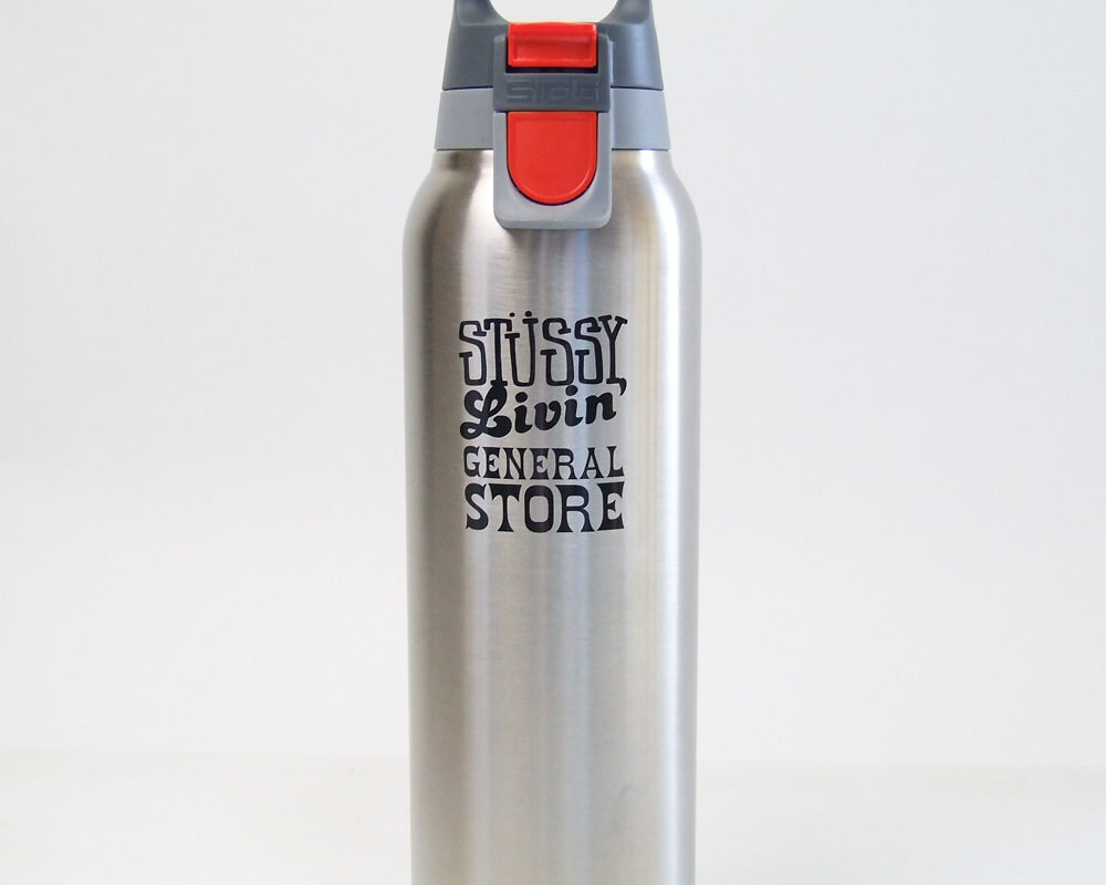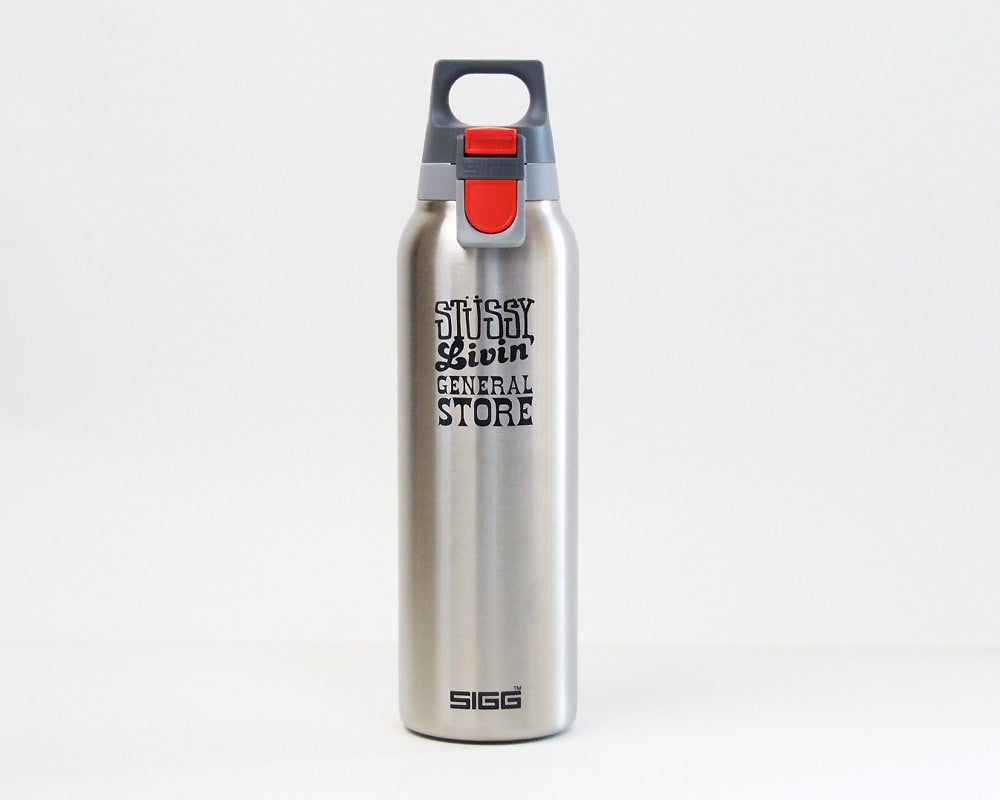STUSSY Livin’GENERAL STORE がスイスのボトルメーカー「SIGG(シグ)」に別注した、保温・保冷のきくサーモボトルがリニューアルしました。 1908年に創業、アルミボトルで知られるスイスを拠点とするボトルメーカー「SIGG」からステンレス製で保温・保冷のきくサーモボトル。 洗練されたデザインと高い保温性を兼ね備えている仕様はそのままに、片手で開閉が可能なワンタッチ式の飲み口となり更に使いやすくなりました。 その洗練されたデザインはドイツのグッドデザイン賞である「GERMAN DESIGN AWARD WINNER 2016」受賞しています。 [高い保温性] ・保温効力の高まるステンレス製真空2重構造。 ・サーモシグ本体に含まれる“ジルコニウム”が、真空層にわずかに残った酸素や湿気と結合し、熱や冷気を外に逃がさない真空効果を高めます。 ・真空面の内側に"銅のコーティング"を施すことで内側での一層高い熱反射性を誇ります。 ティーフィルター(茶漉し機能)付きのキャップは、大きめの茶葉ならそのまま入れて熱湯を注ぐだけで、飲むときは口に入らない便利な機能。 もちろん夏場に氷を入れたときなんかも重宝します。また、全て分解できるのでお手入れも簡単です。季節問わず持ち歩けるマイボトルとして。