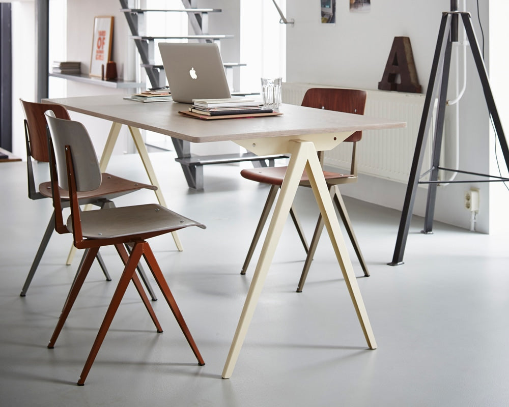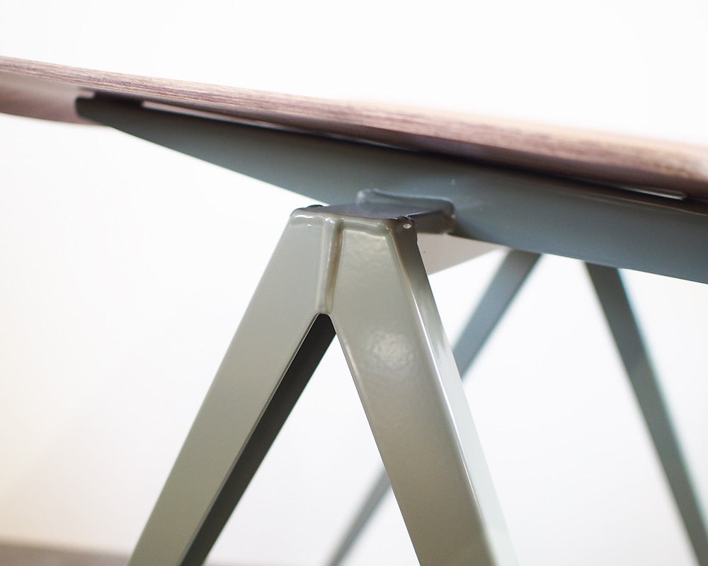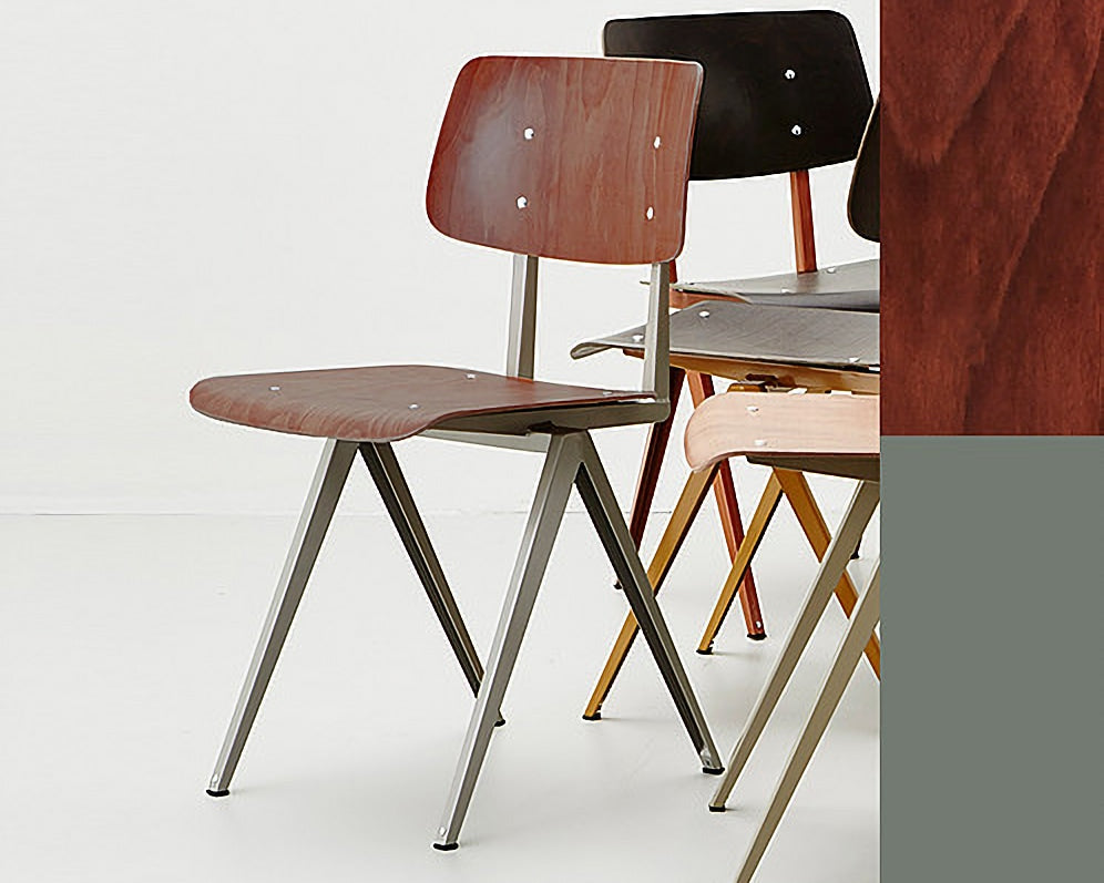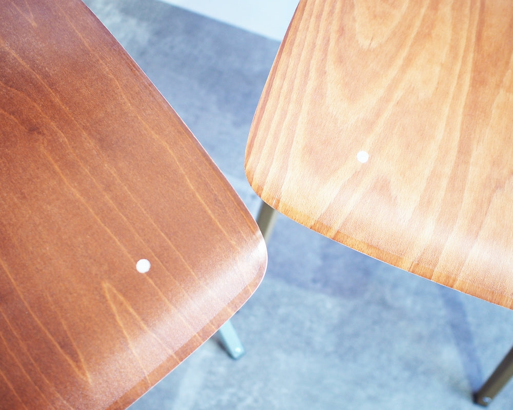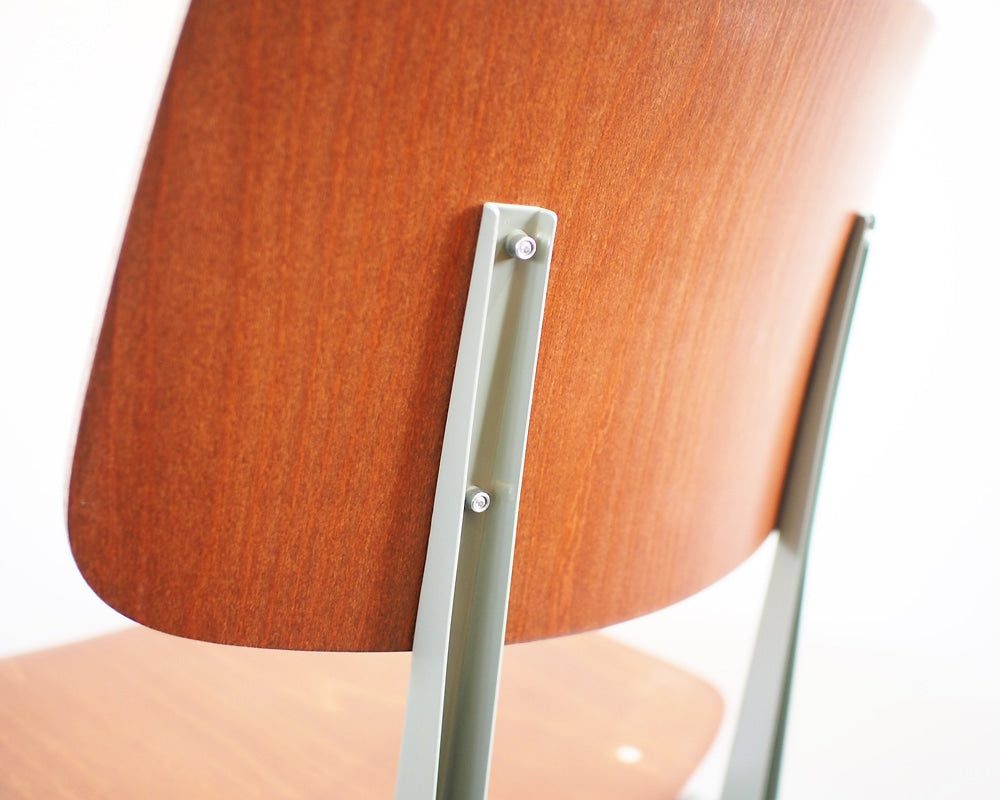 オランダのミッドセンチュリー期を代表する通称「コンパスレッグ」を採用したインダストリアルチェアModel S.16です。インダストリアルチェアModel S16は、1950年代後半から60年代初めに、学校、オフィス、病院、ダイニングホールなどの公共施設でのヘビーユーズに耐えられるよう、安価で実用性と耐久性が織り込まれたデザインとして製作されました。その後、国内の多くの施設にシェアが広がり、同社の代表的な製品として認知されるようになった椅子の一つです。一度は生産停止となったものの、ヴィンテージとして世界中にファンを持つS16は、2014年に生産を再開。Jean Prouve(ジャン・プルーヴェ)、Wim Rietveld(ウィム・リートフェルト)、Friso Kramer(フリソ・クラマー)らの工業製品の流れを汲んだシンプルで工業的な外観と豊富なカラーバリエーションが、時代や環境を超越し、住宅から商業施設、様々な空間で使用されています。コンパスレッグ オランダのミッドセンチュリーデザインの代表とも言われる「コンパスチェア」。逆V字に開いたレッグが特徴的な通称「コンパスレッグ」を採用し、1950年代から60年代にかけて複数のメーカーから相次いで製造されました。ガルファニタスも同様に生産していましたが、他のコンパスチェアとは異なり一般家庭ではなく、公共施設や学校、政府機関を中心に採用されています。特殊素材PAGウッド シートと背もたれに採用されている合板は、ドイツのPAGHOLZ社が開発した「PAGウッド」と呼ばれる特殊複合素材です。PAGウッドはブナ合板と特殊樹脂を複合圧縮した強化材で、耐衝撃性や耐久性、耐水性を備えた素材です。シートには細かなな凹凸があり滑りを抑えるなど細かい配慮がされS.16に対するこだわりを感じさせます。豊富なカラーバリエーション S.16のカラーは6色からお選びいただけます。ウッド部分とスチール部分が全て違うカラーで展開され、ダイニングテーブル等にカラーを変えてコーディネートされるのもおすすめです。全カラー渋めの色合いで、セインスの良い配色ですので、どんな組み合わせにしてもうまくコーディネートできるのも魅力です。