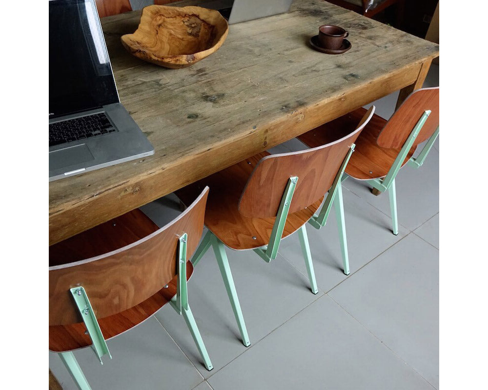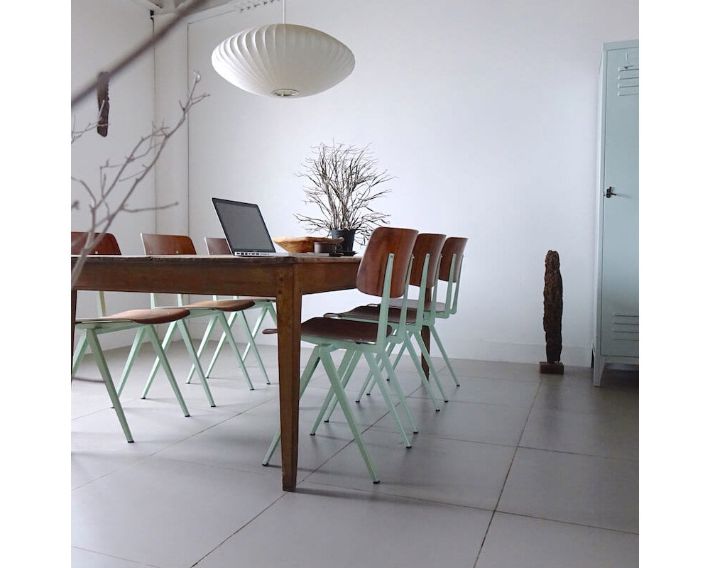 オランダのミッドセンチュリー期を代表する通称「コンパスレッグ」を採用したインダストリアルチェアModel S.16。2020年のスポットカラーの「ブラウン/パステルグリーン」です。インダストリアルチェアModel S16は、1950年代後半から60年代初めに、学校、オフィス、病院、ダイニングホールなどの公共施設でのヘビーユーズに耐えられるよう、安価で実用性と耐久性が織り込まれたデザインとして製作されました。その後、国内の多くの施設にシェアが広がり、同社の代表的な製品として認知されるようになった椅子の一つです。一度は生産停止となったものの、ヴィンテージとして世界中にファンを持つS16は、2014年に生産を再開。Jean Prouve(ジャン・プルーヴェ)、Wim Rietveld(ウィム・リートフェルト)、Friso Kramer(フリソ・クラマー)らの工業製品の流れを汲んだシンプルで工業的な外観と豊富なカラーバリエーションが、時代や環境を超越し、住宅から商業施設、様々な空間で使用されています。コンパスレッグ オランダのミッドセンチュリーデザインの代表とも言われる「コンパスチェア」。逆V字に開いたレッグが特徴的な通称「コンパスレッグ」を採用し、1950年代から60年代にかけて複数のメーカーから相次いで製造されました。ガルファニタスも同様に生産していましたが、他のコンパスチェアとは異なり一般家庭ではなく、公共施設や学校、政府機関を中心に採用されています。特殊素材PAGウッド シートと背もたれに採用されている合板は、ドイツのPAGHOLZ社が開発した「PAGウッド」と呼ばれる特殊複合素材です。PAGウッドはブナ合板と特殊樹脂を複合圧縮した強化材で、耐衝撃性や耐久性、耐水性を備えた素材です。シートには細かなな凹凸があり滑りを抑えるなど細かい配慮がされS.16に対するこだわりを感じさせます。2020年の国内限定スポットカラー 2020年の国内限定スポットカラーは爽やかで軽快感・解放感のある「パステルグリーン」。シートにはブラウンを採用しPOPな可愛らしさと工業的な要素を併せ持つカラーです。